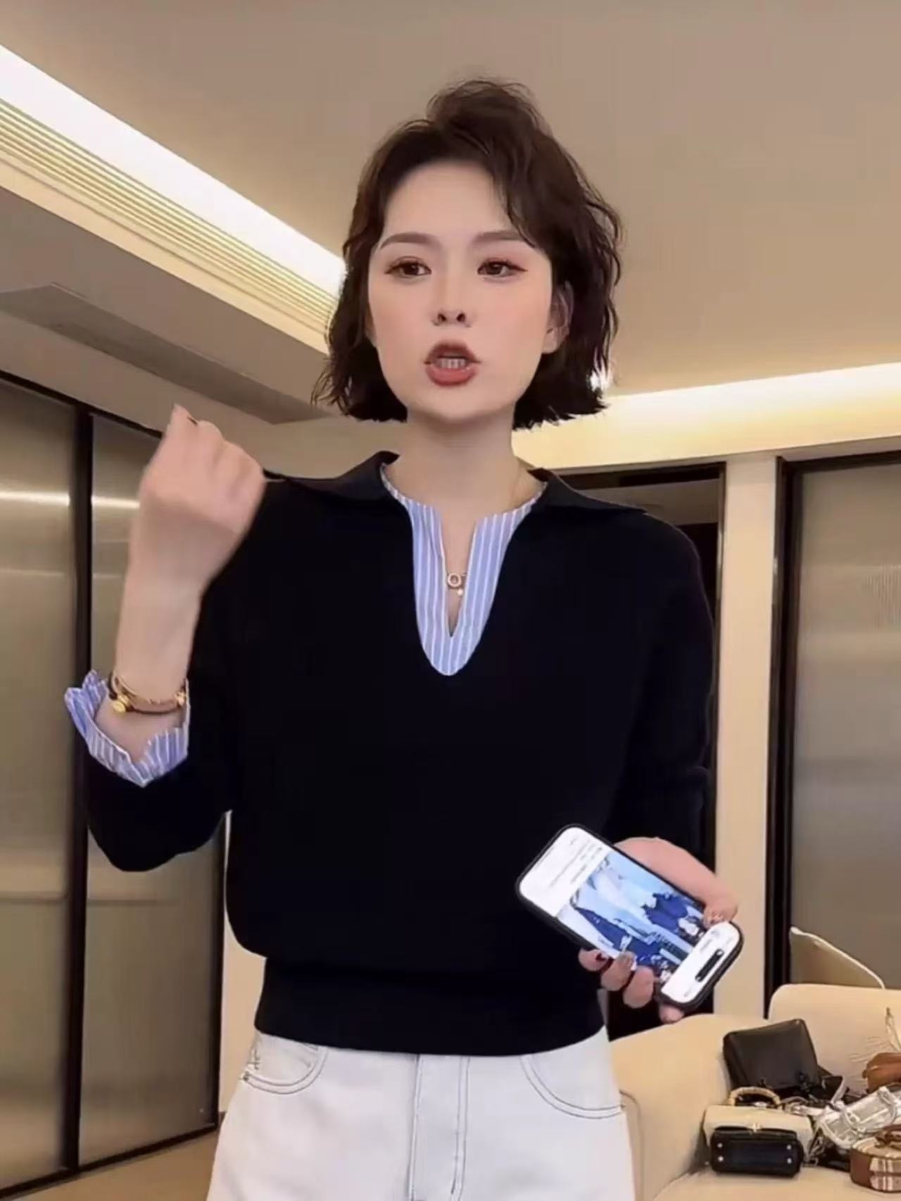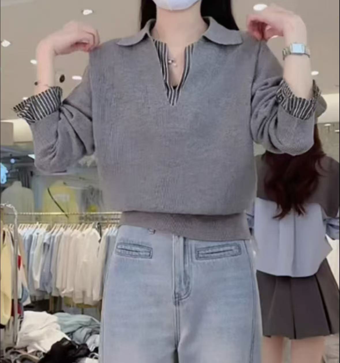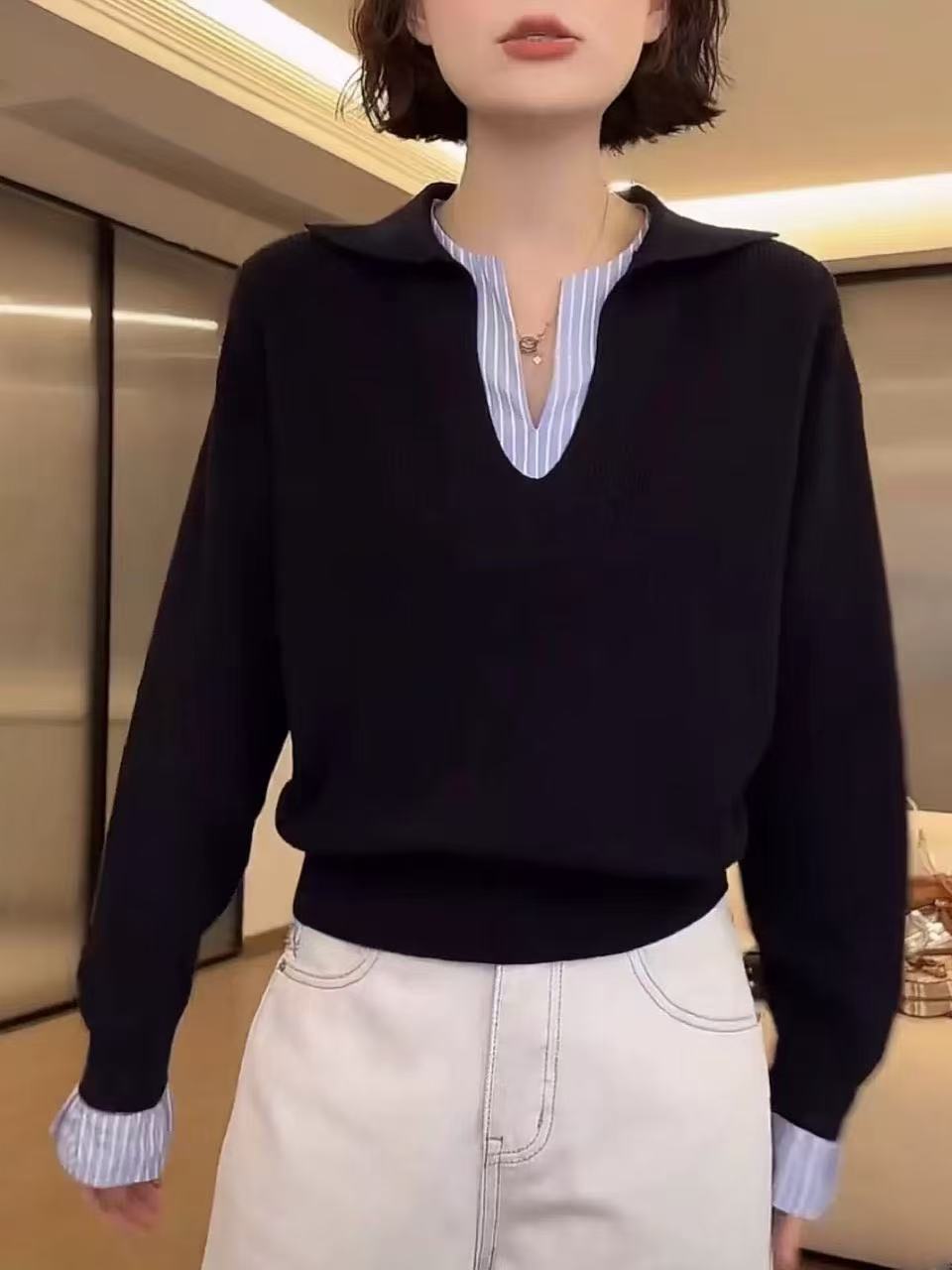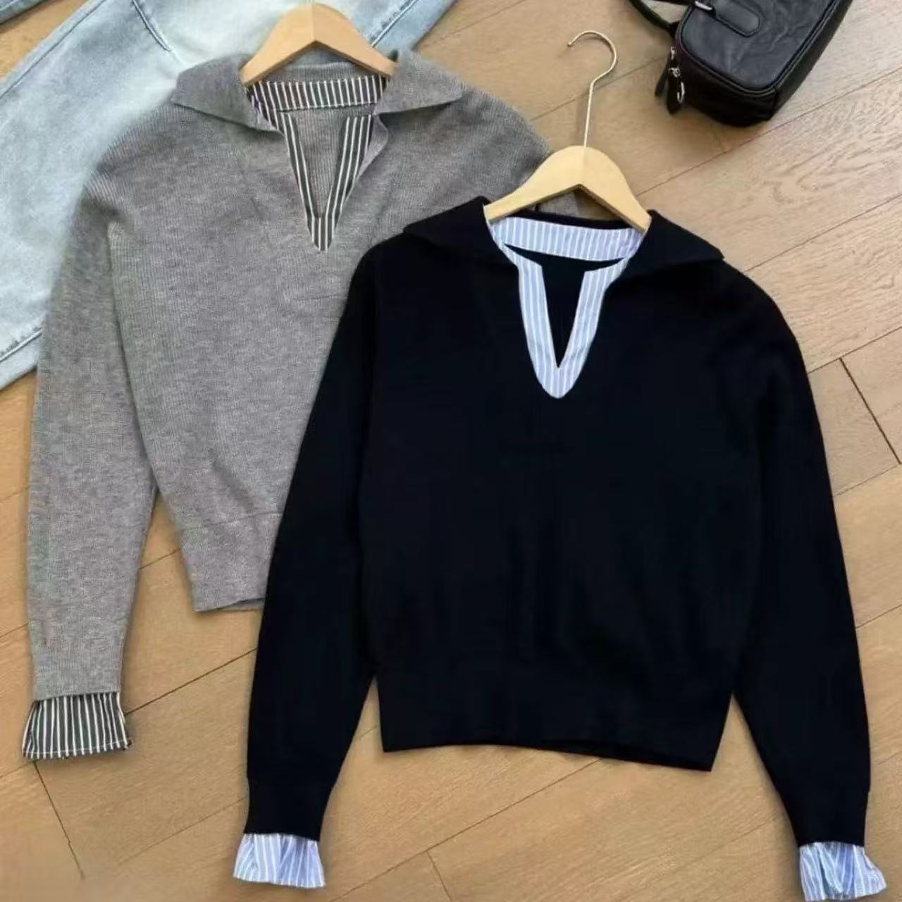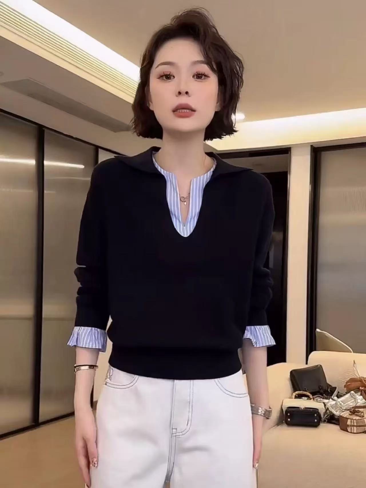 韩版设计感时尚气质假两件条纹撞色拼接套头针织衫女洋气百搭上衣