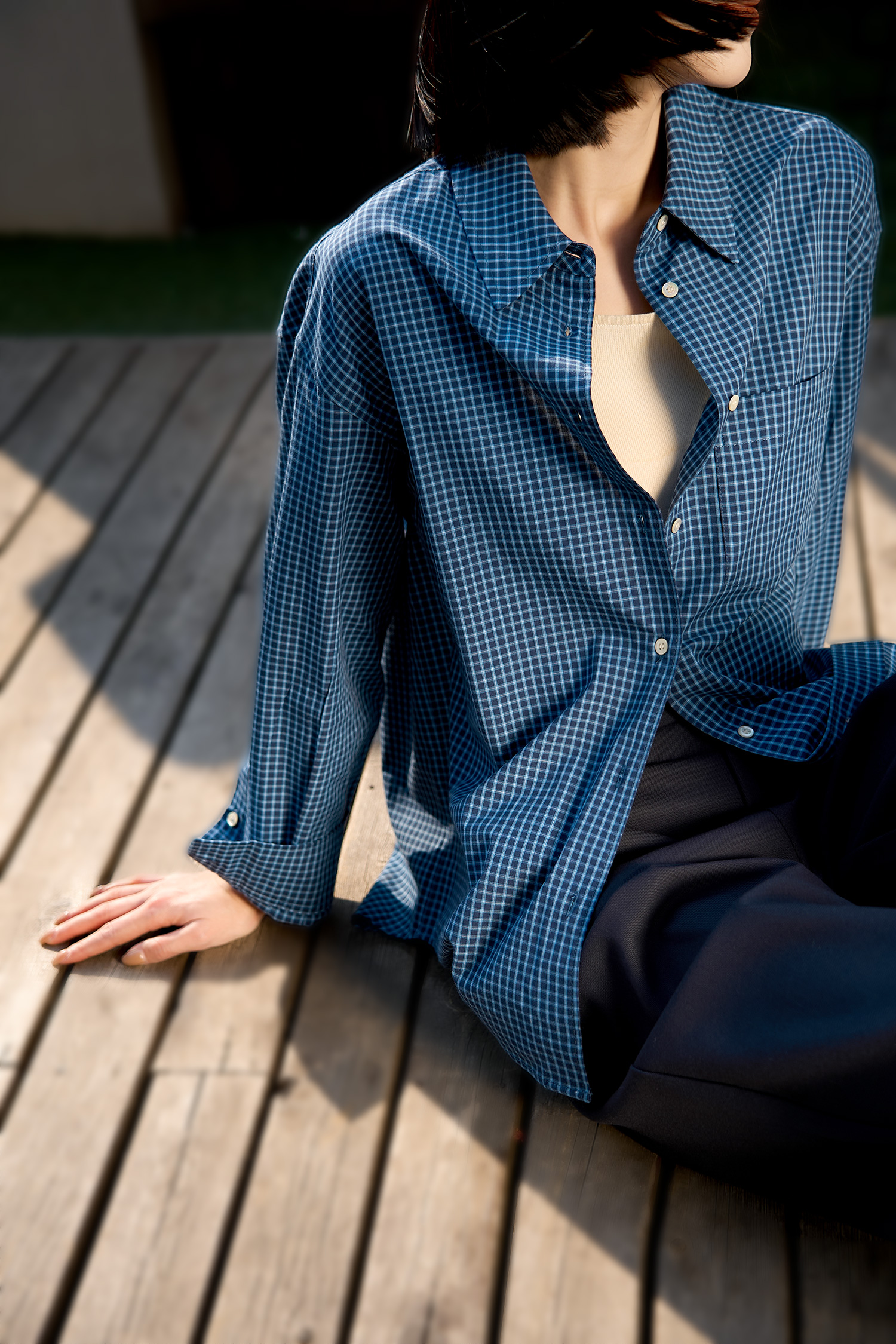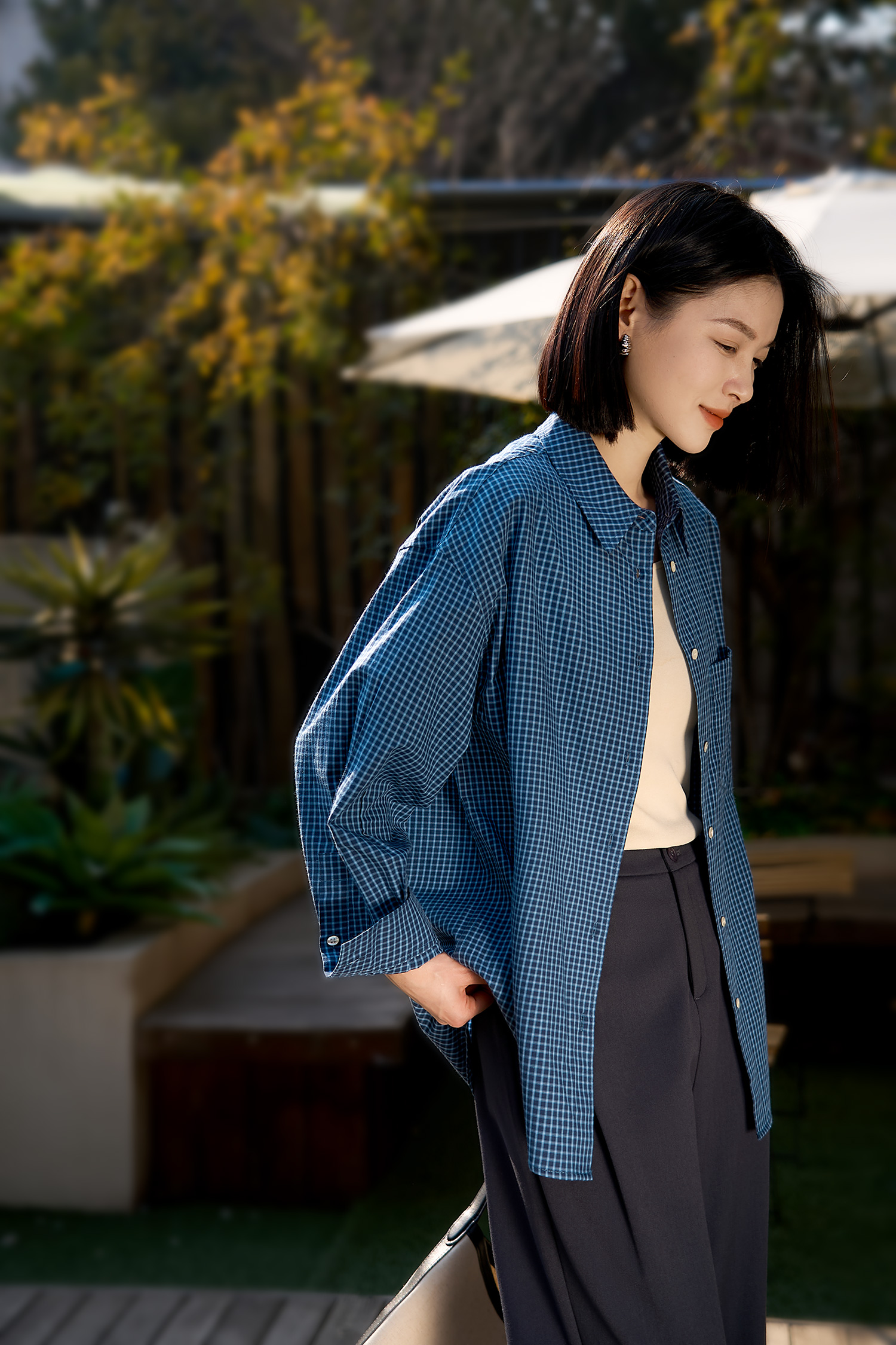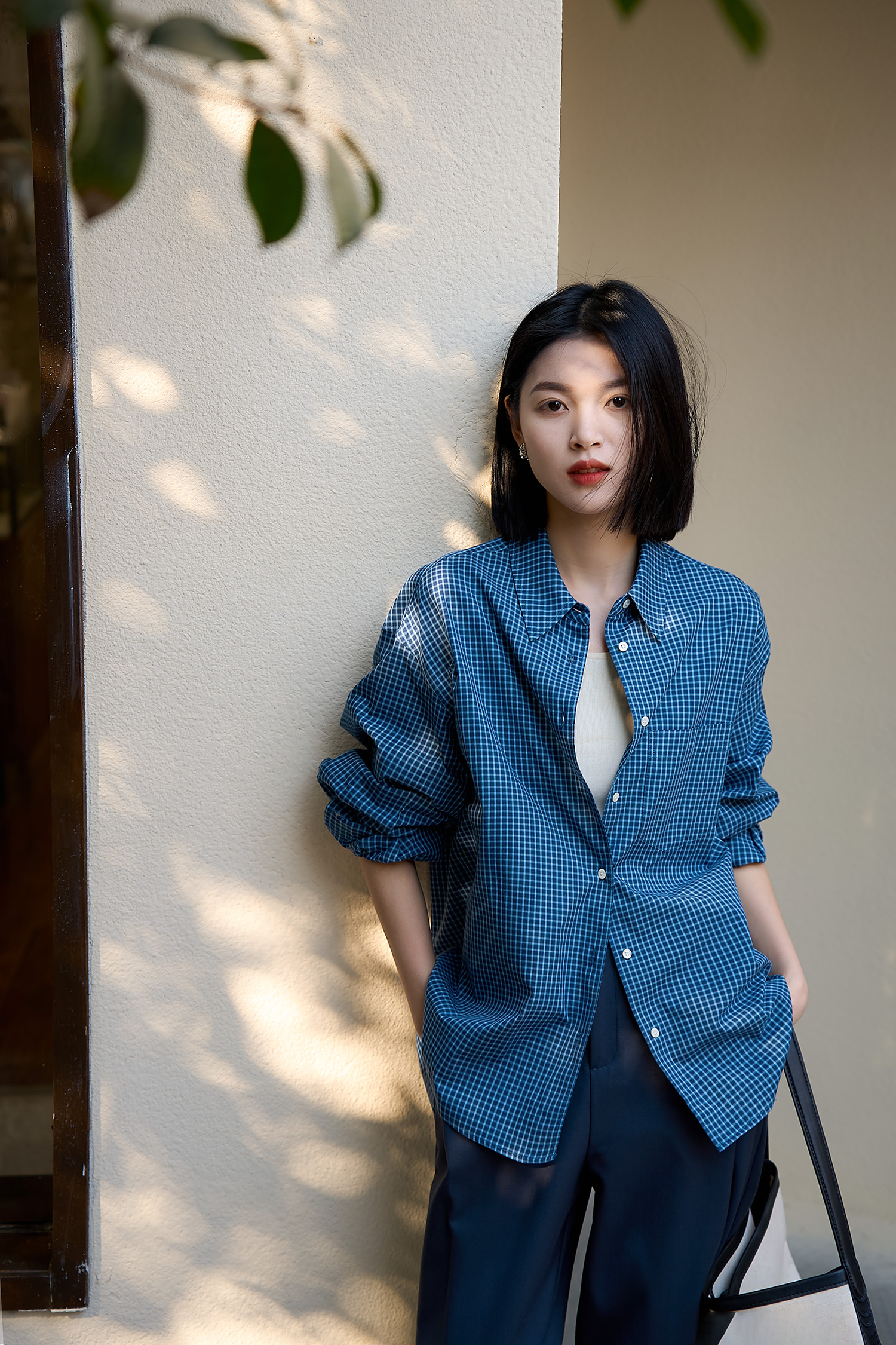 笑涵松弛廓形棉料衬衫 蓝白复古长袖薄外套上衣女2025年春季