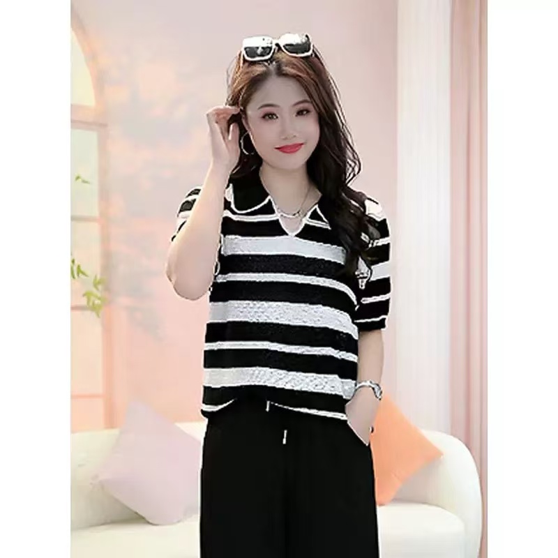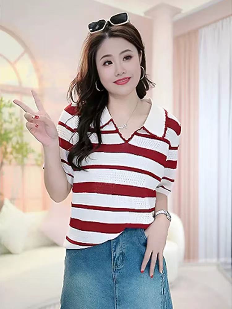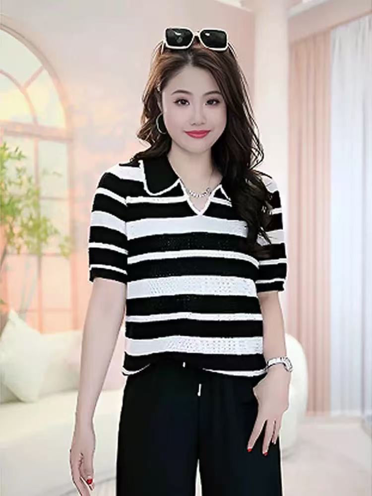 条纹V领针织短袖t恤女2025夏季新款爆款小个子polo领体恤冰丝上衣
