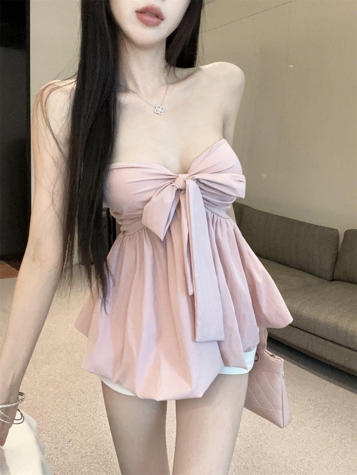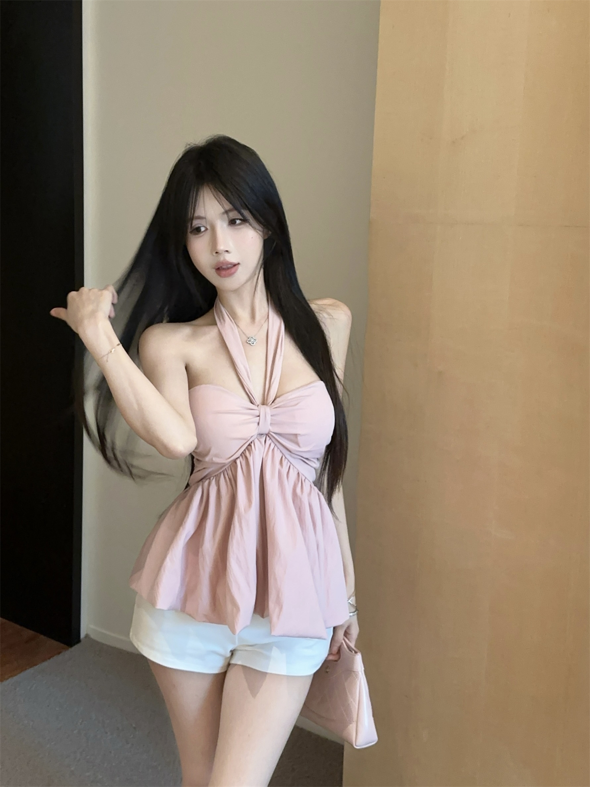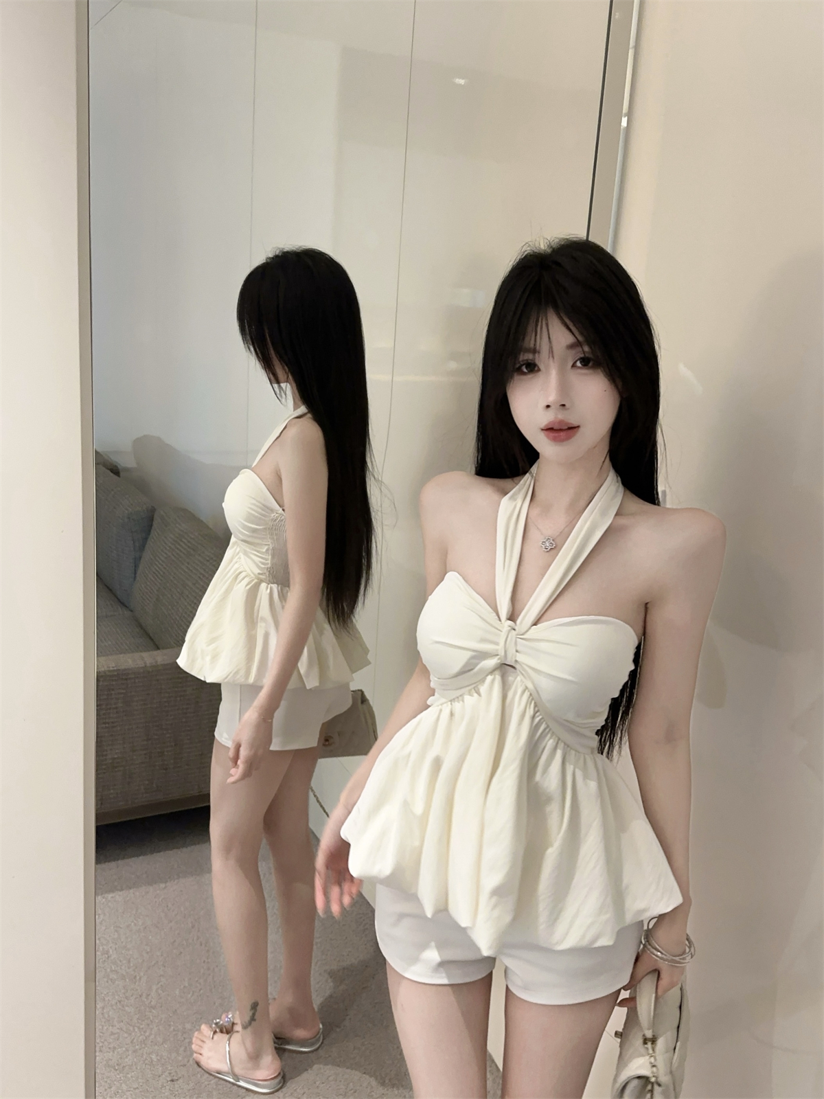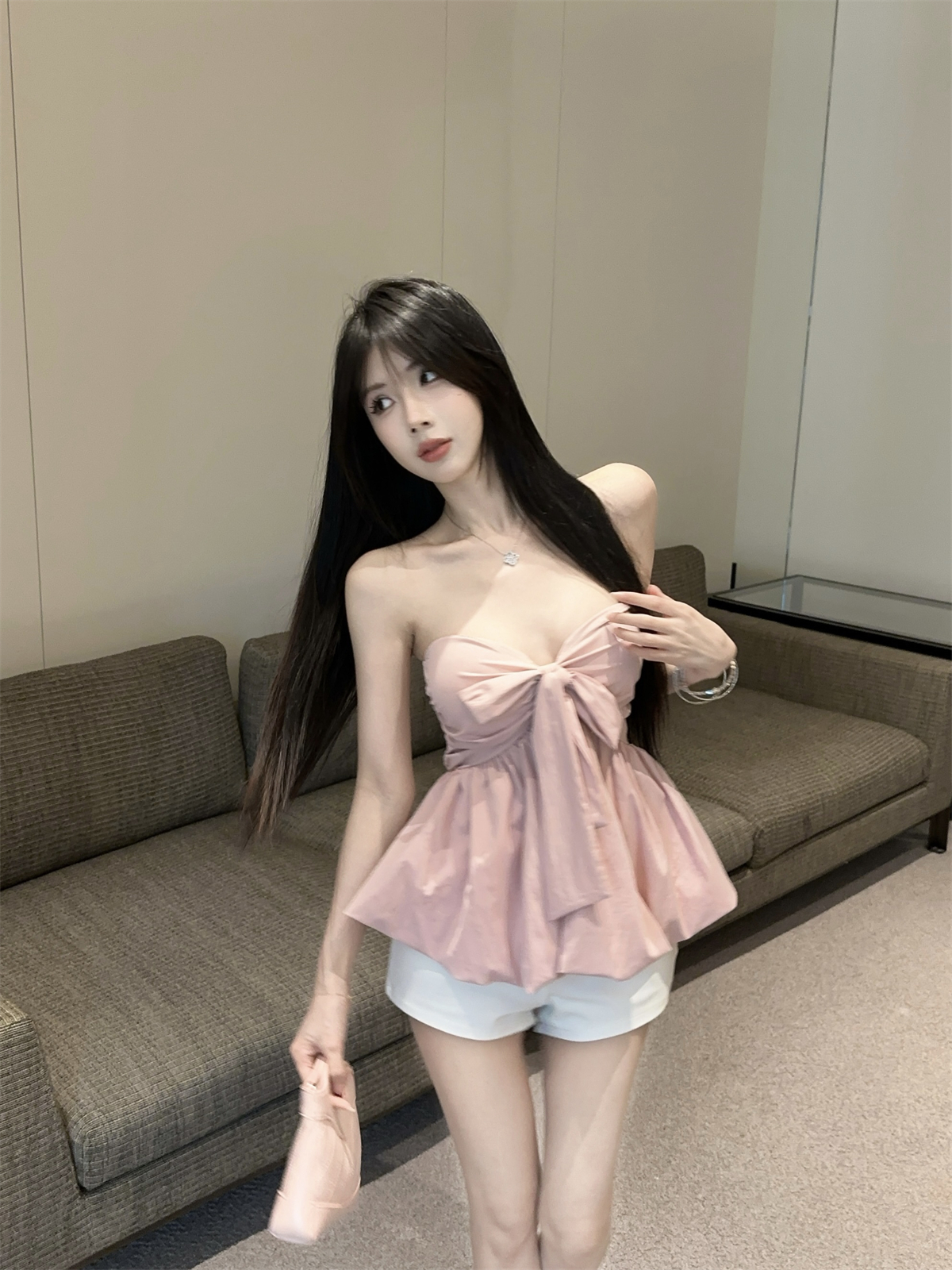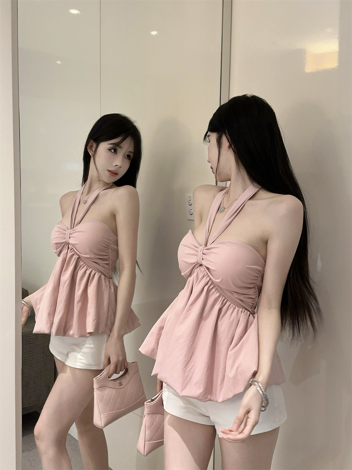 실제 촬영 및 실제 가격 순수한 욕망 나비 넥타이 다양한 착용 방법 홀터넥 서스펜더 서양식 작은 셔츠 반바지 여성 정장