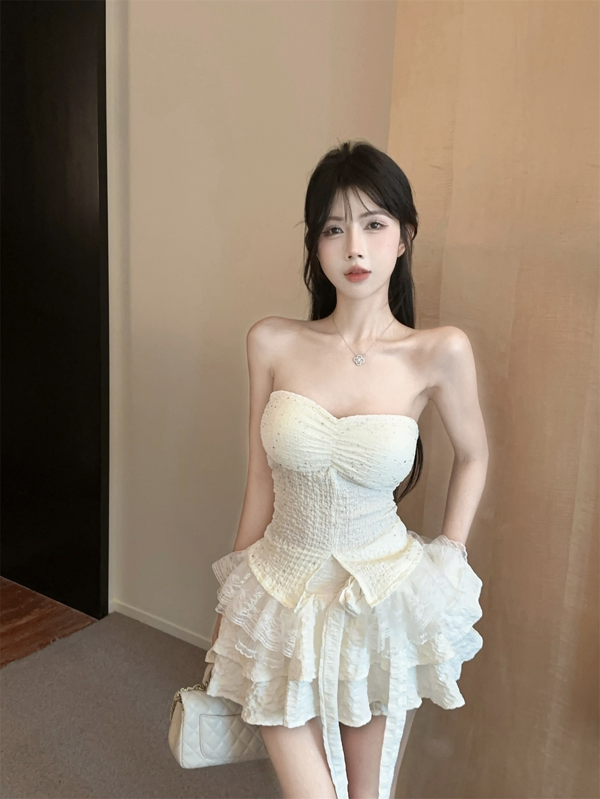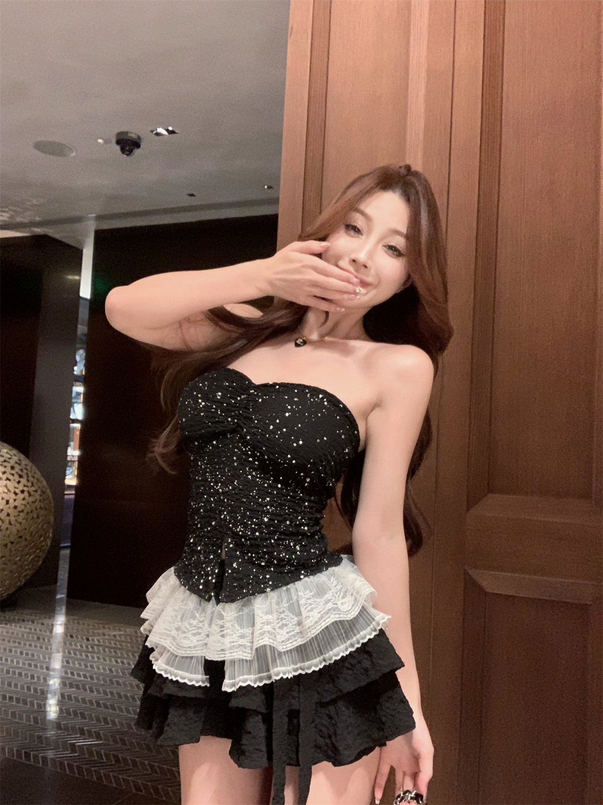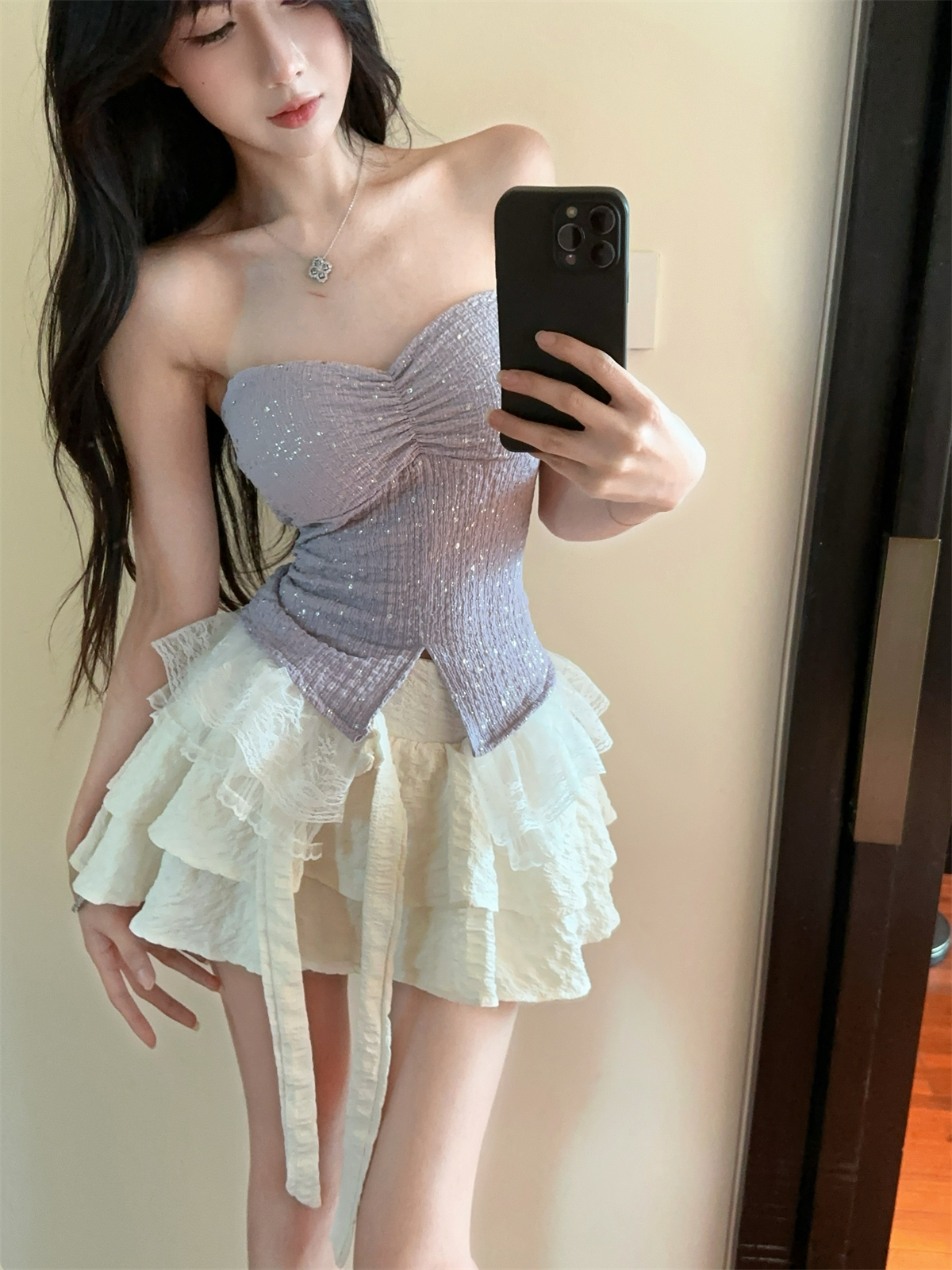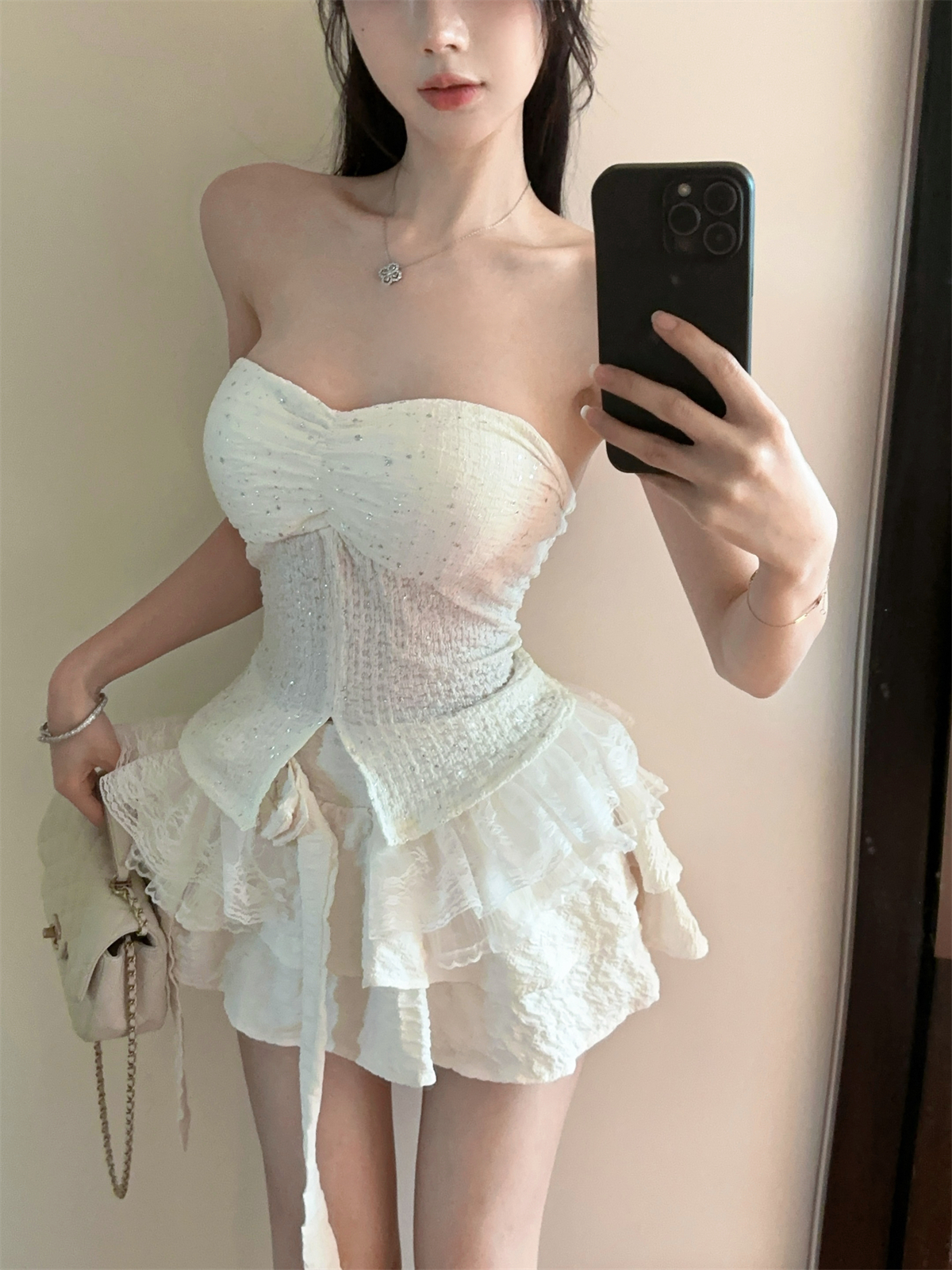 실제 촬영 및 실제 가격 골드 스탬프 스플릿 튜브 탑 레이스 탑 러플 리본 케이크 스커트 여성 달콤하고 매콤한 슈트