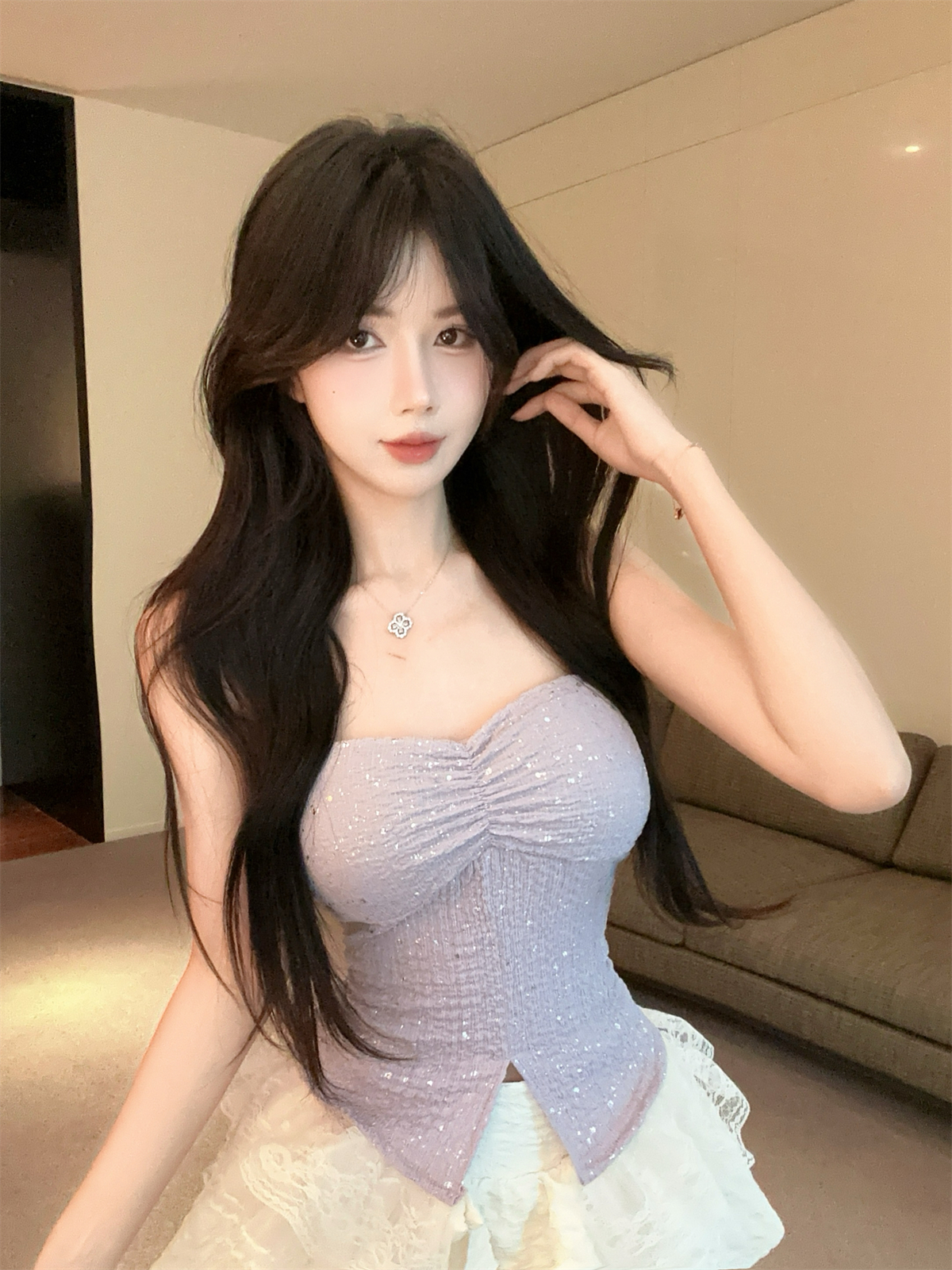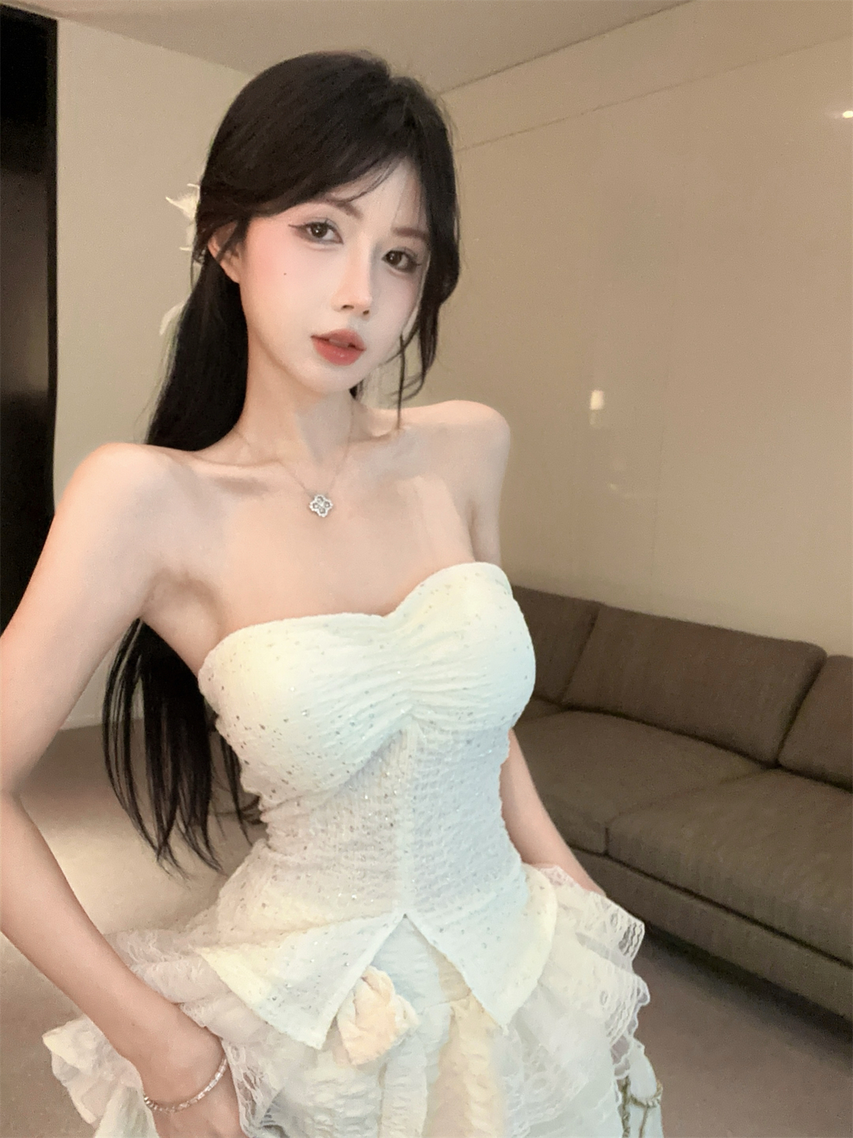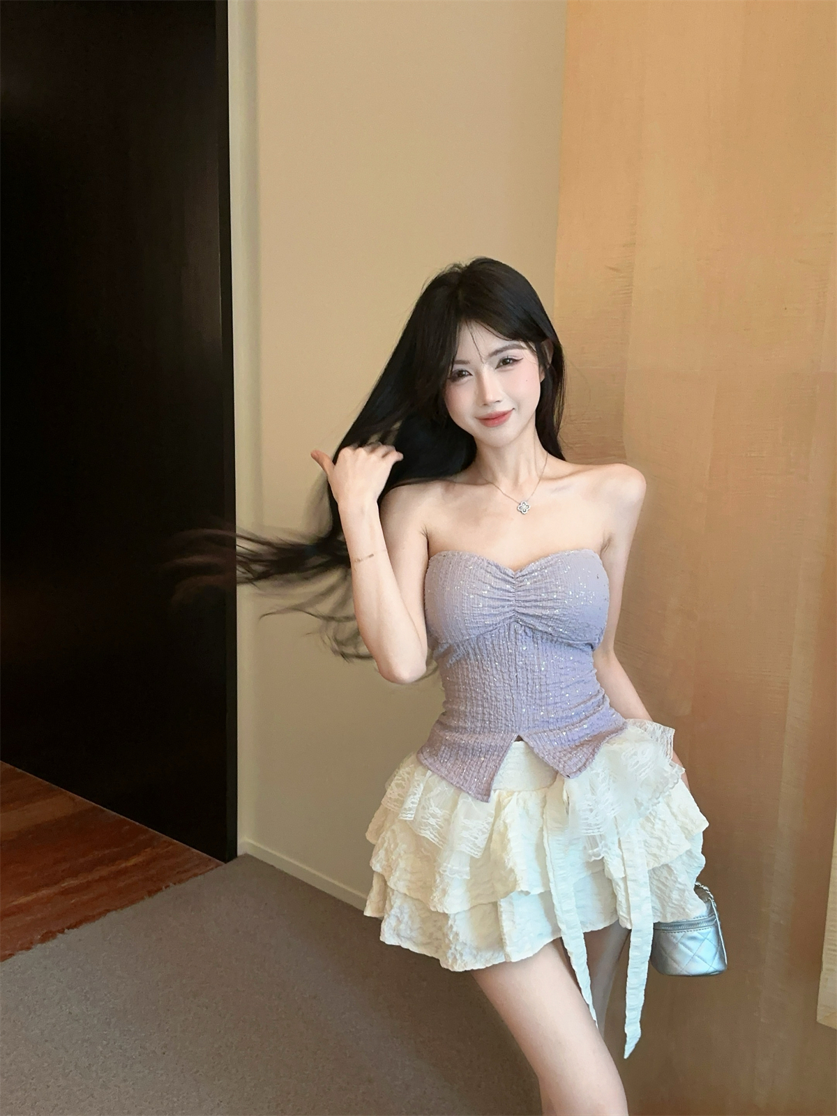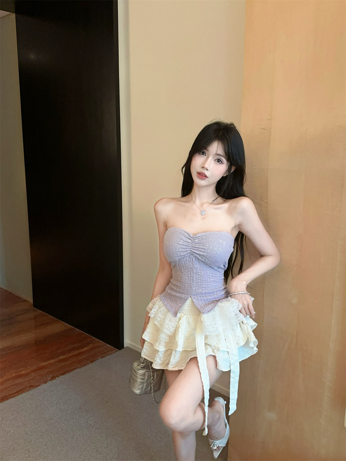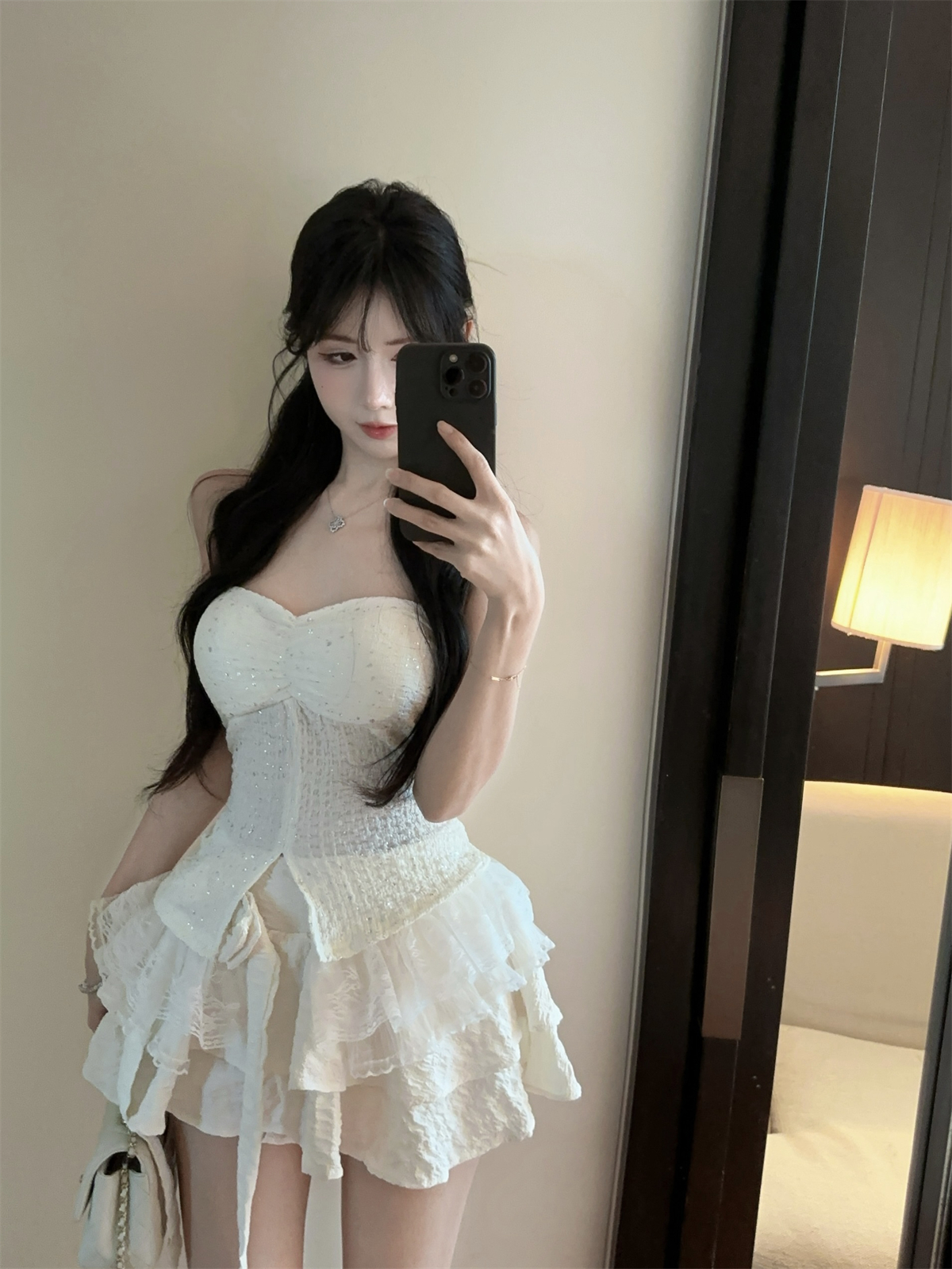 실제 촬영 및 실제 가격 골드 스탬프 스플릿 튜브 탑 레이스 탑 러플 리본 케이크 스커트 여성 달콤하고 매콤한 슈트
