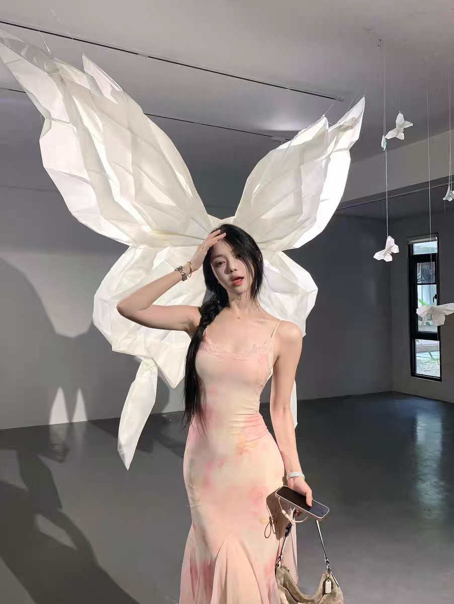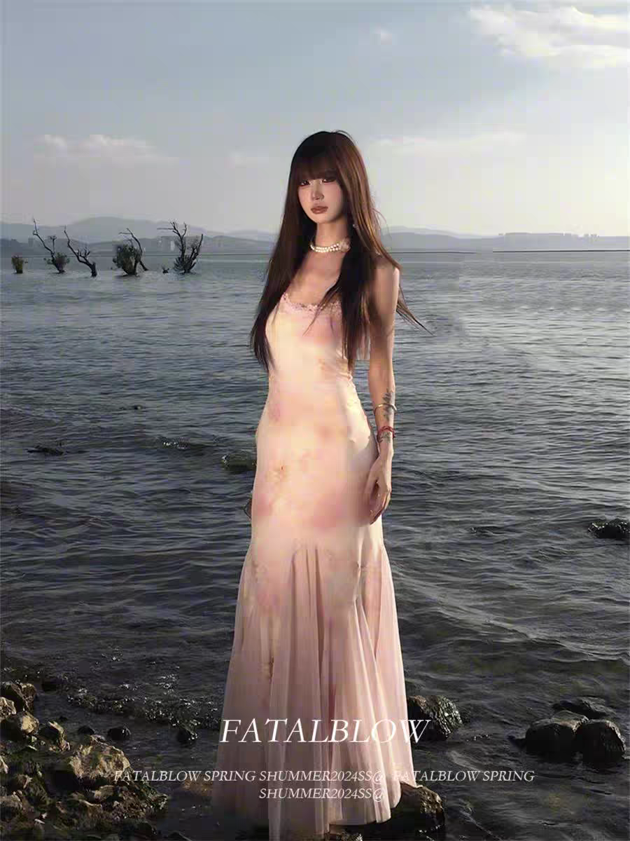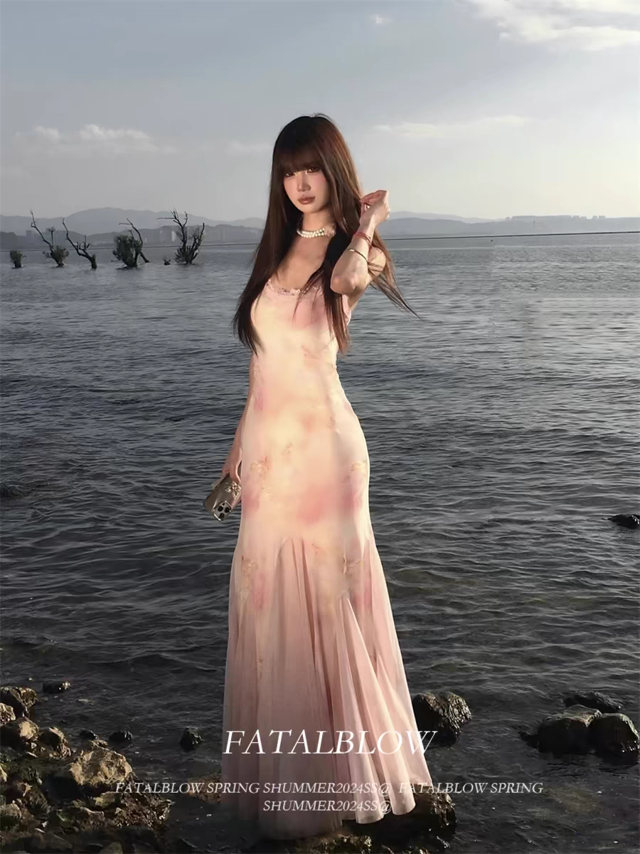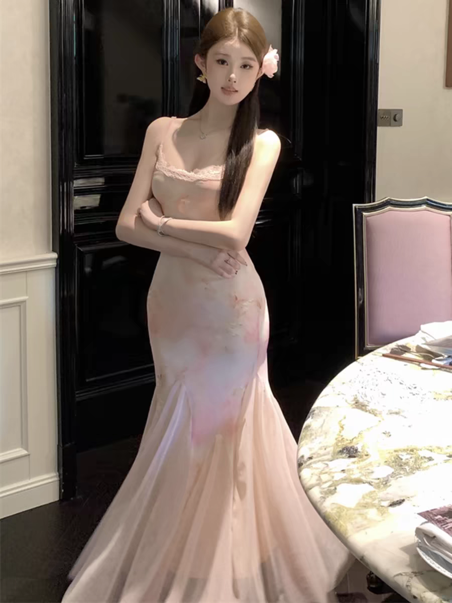 法式粉色碎花网纱吊带连衣裙女夏季2025年海边度假修身收腰长裙子