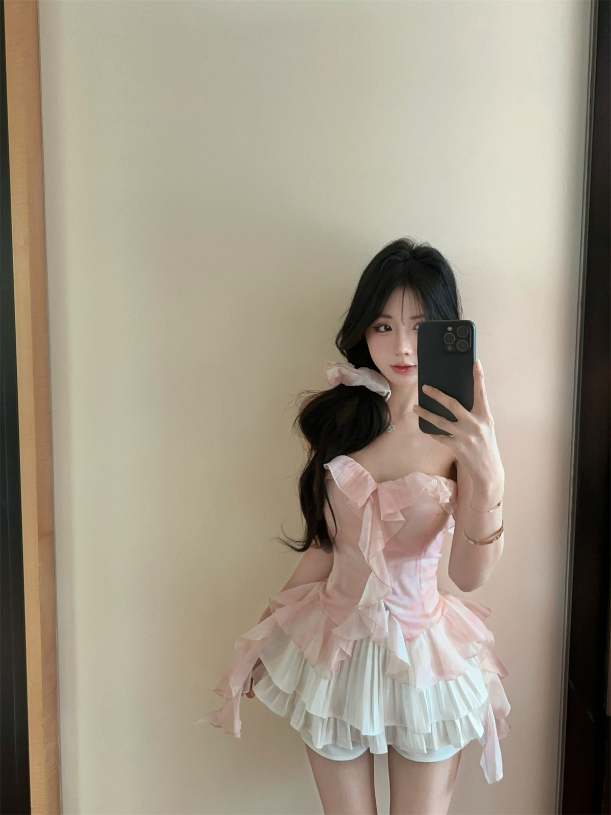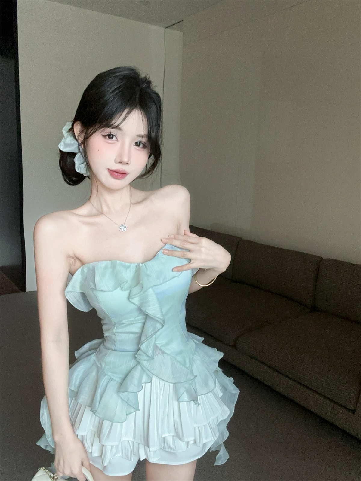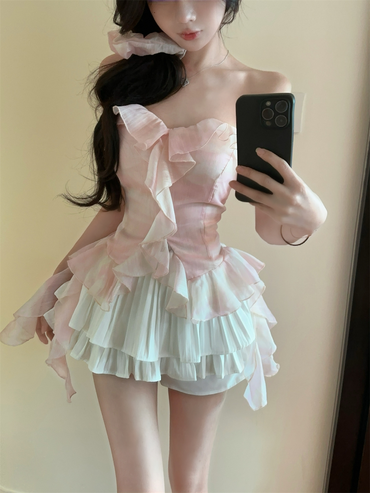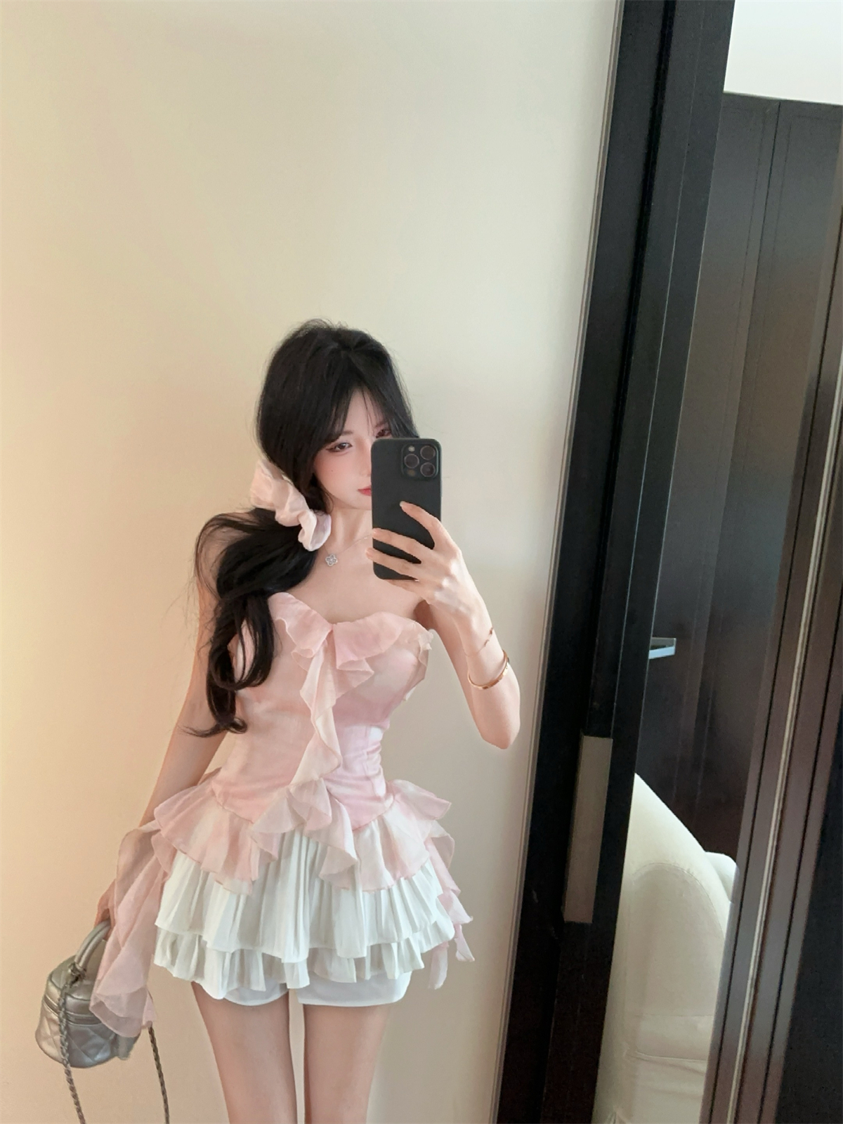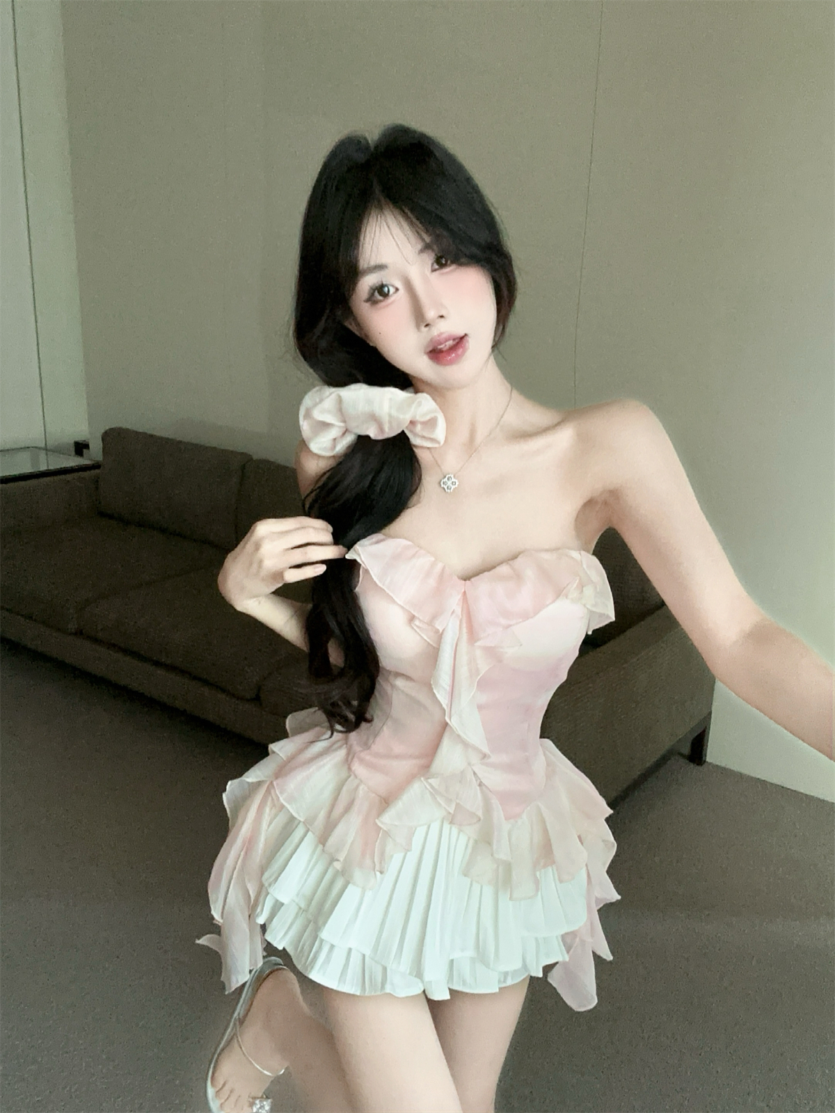 실제 촬영 및 실제 가격 프렌치 러플 불규칙 아이스크림 컬러 튜브탑 플리츠 스커트 여성 여름 정장