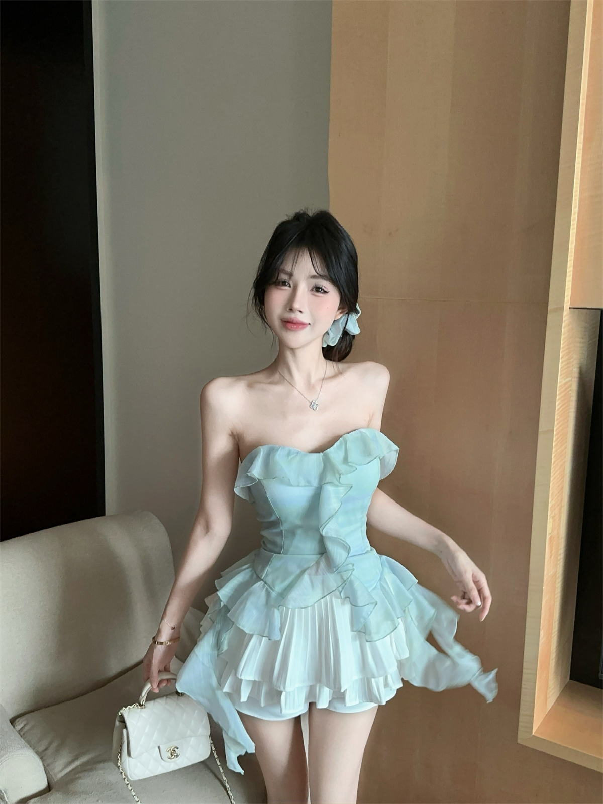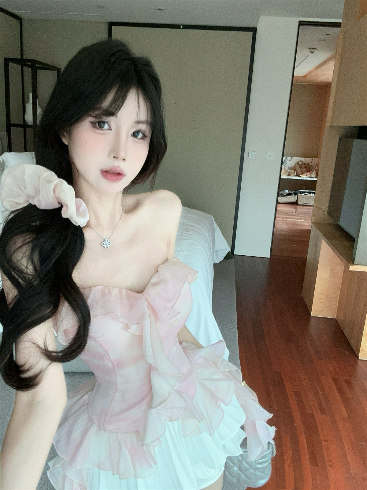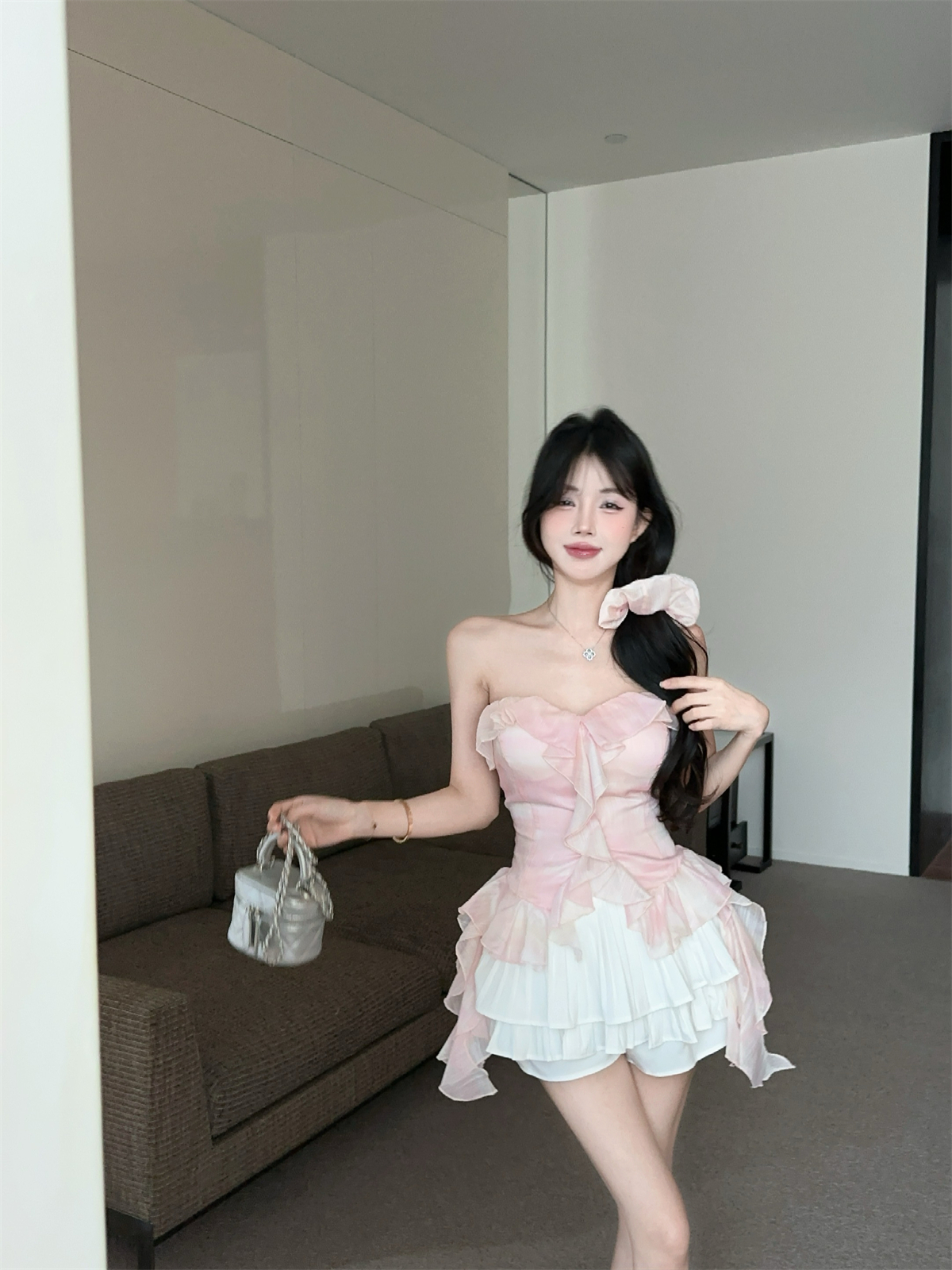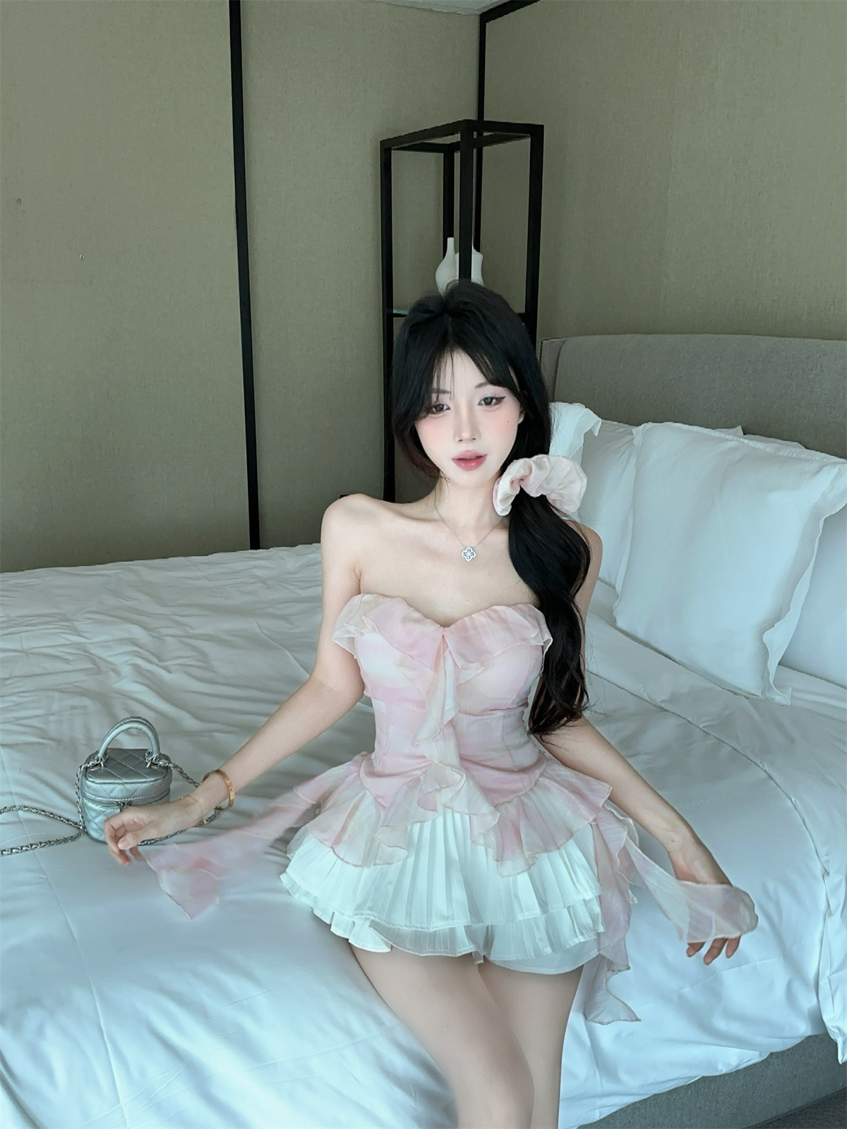 실제 촬영 및 실제 가격 프렌치 러플 불규칙 아이스크림 컬러 튜브탑 플리츠 스커트 여성 여름 정장