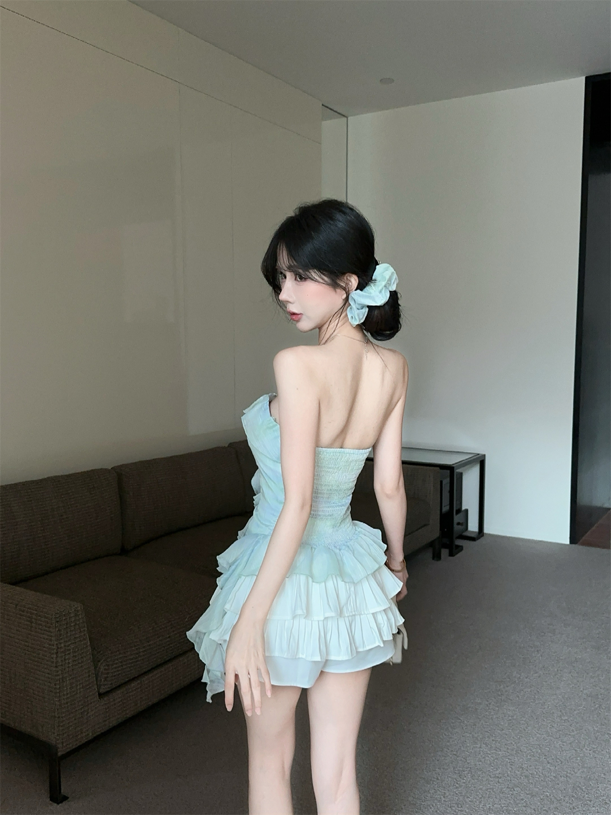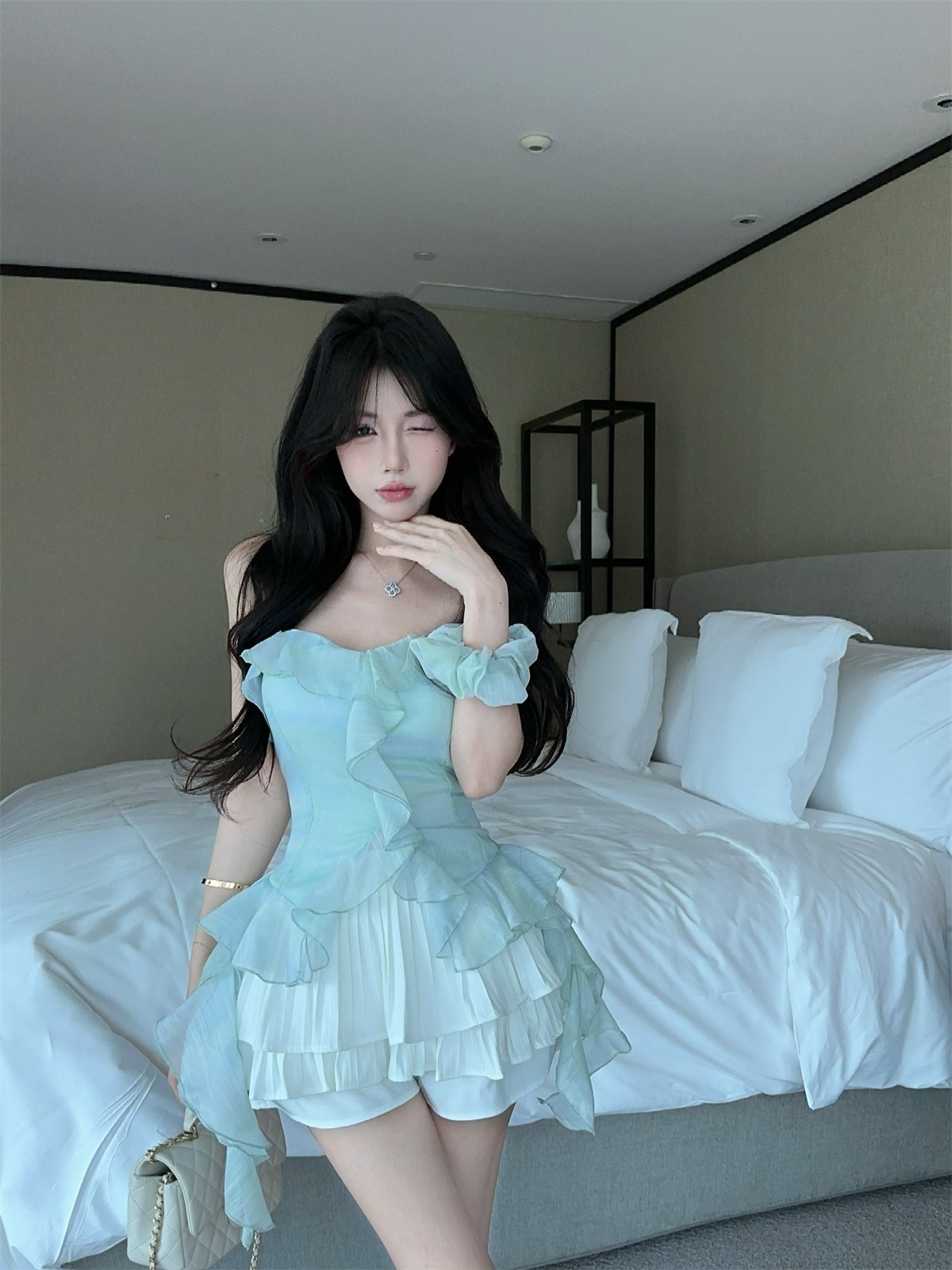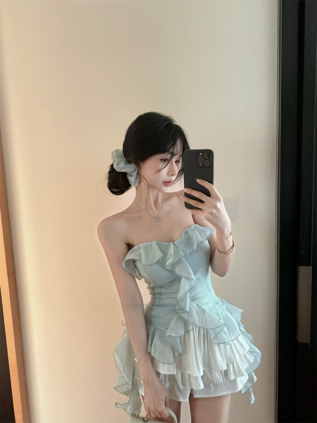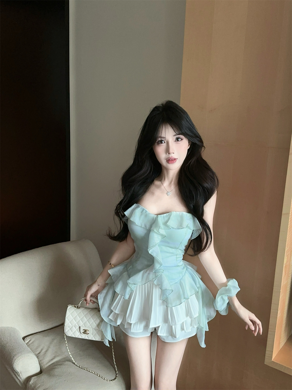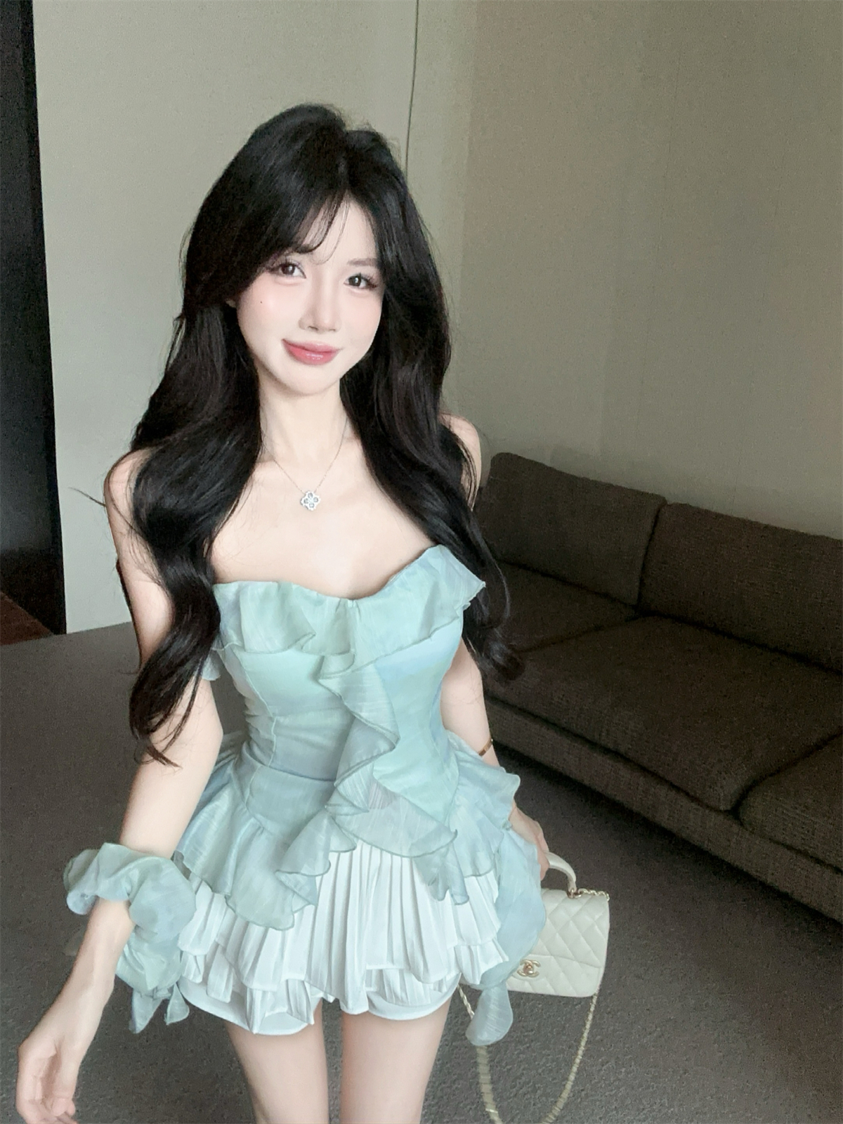 실제 촬영 및 실제 가격 프렌치 러플 불규칙 아이스크림 컬러 튜브탑 플리츠 스커트 여성 여름 정장