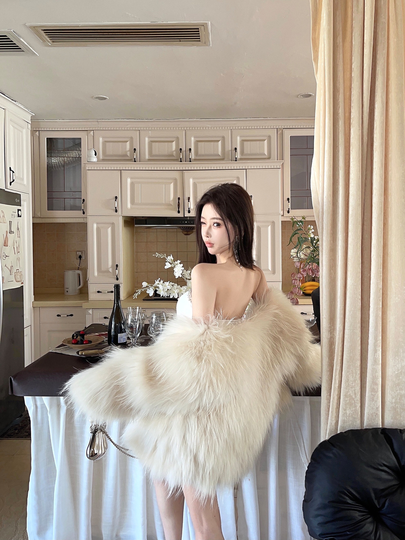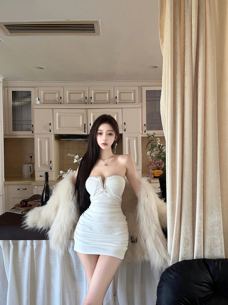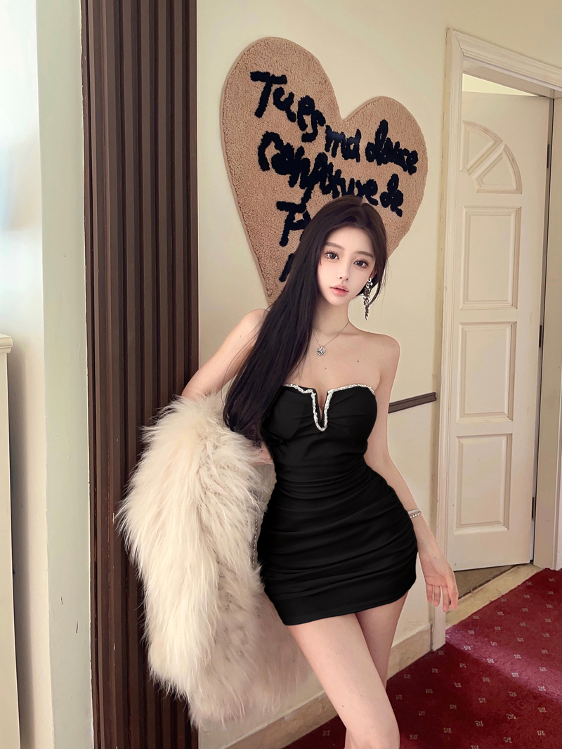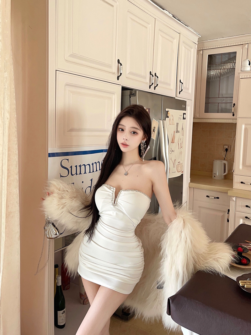 实拍重工镶钻抹胸高级感收腰褶皱内搭包臀连衣裙