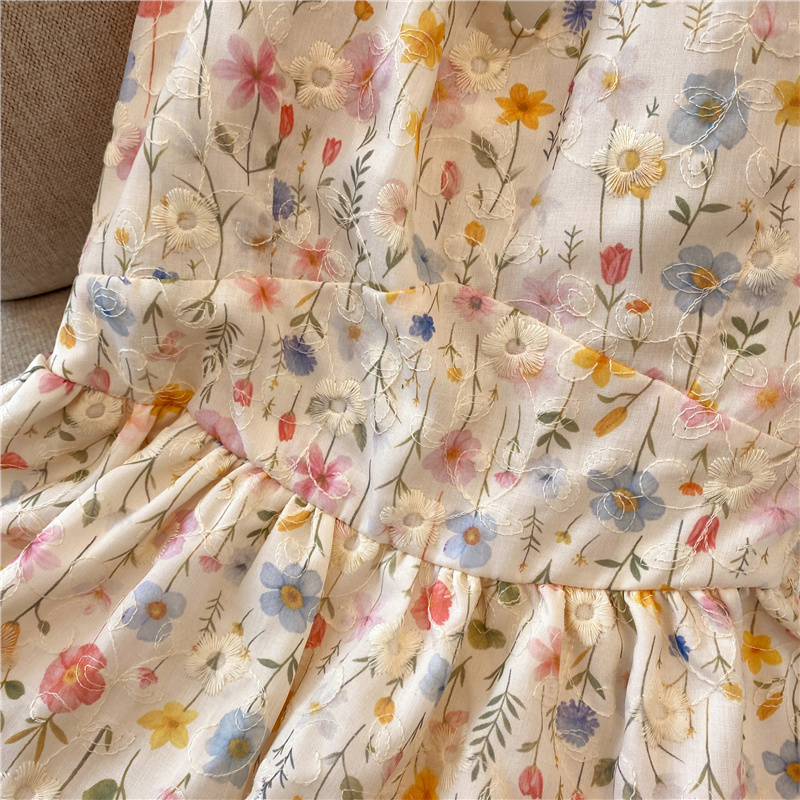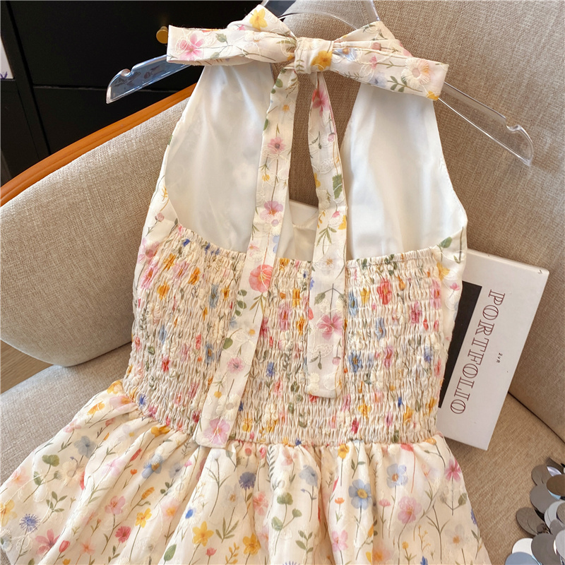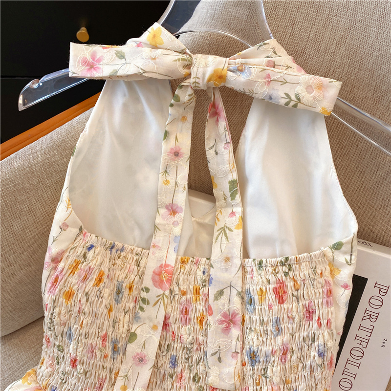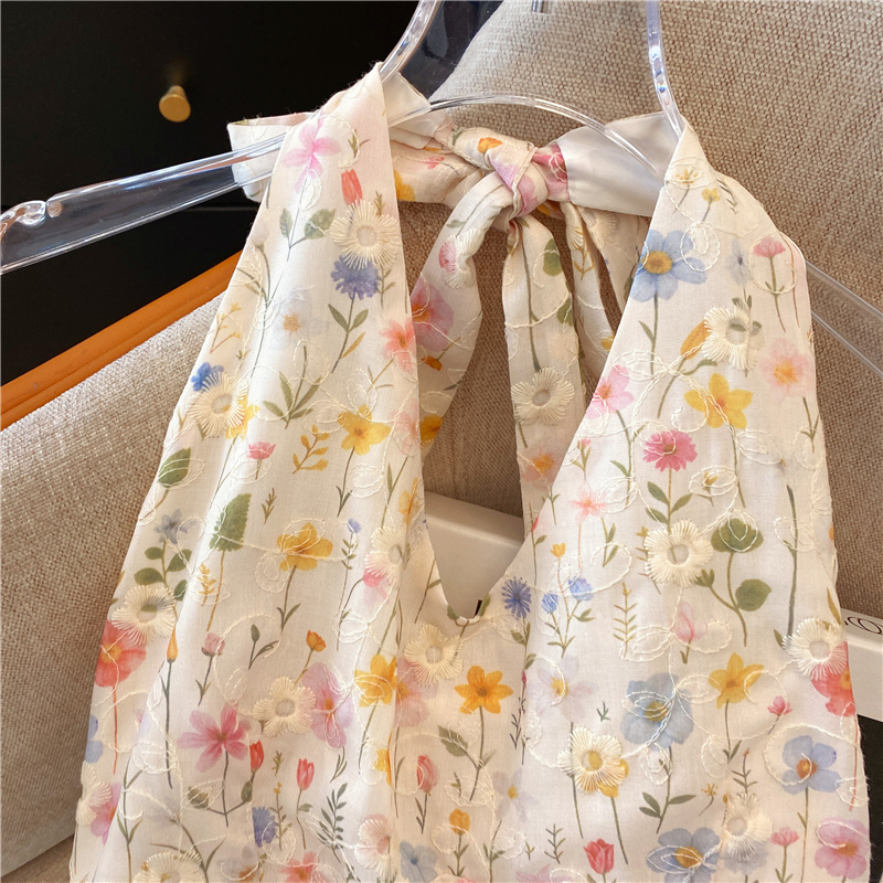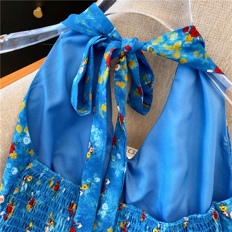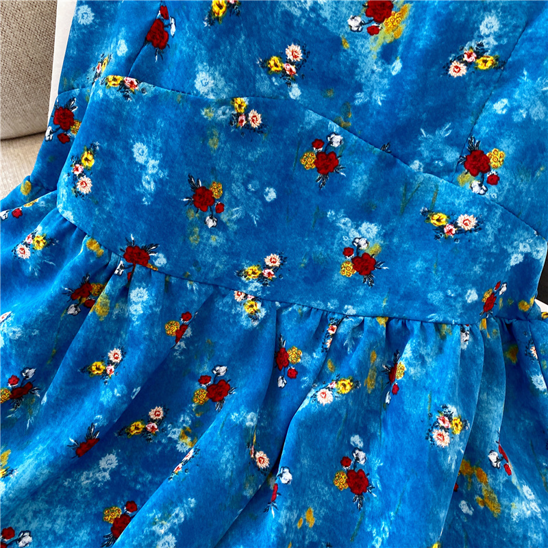 불규칙한 꽃무늬 프린트의 캐미솔을 입은 매력적인 여성의 실제 사진입니다. 허리를 날씬하게 보이게 하는 여름 디자인으로 휴가에 딱입니다.