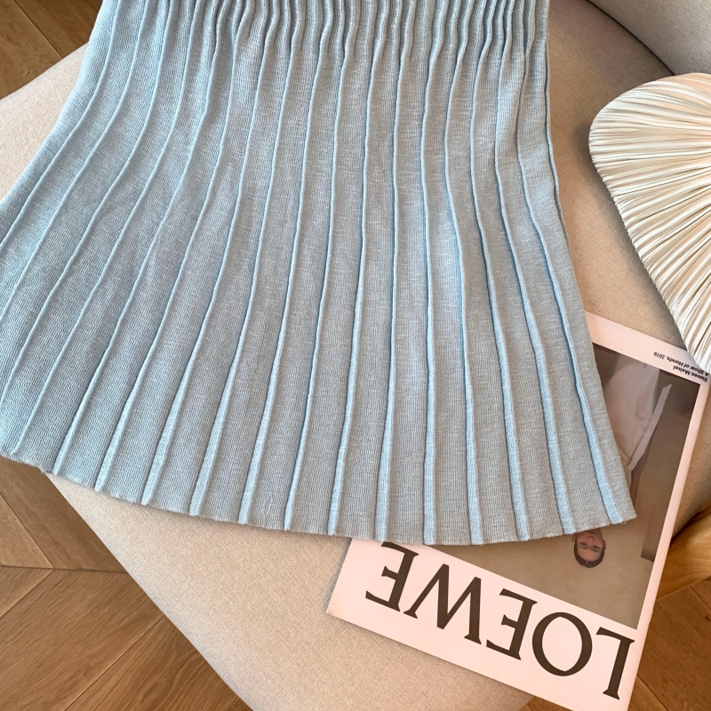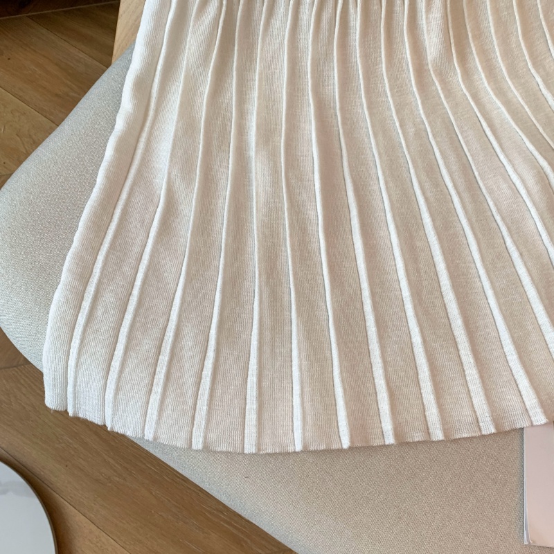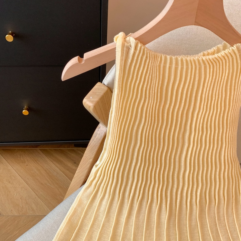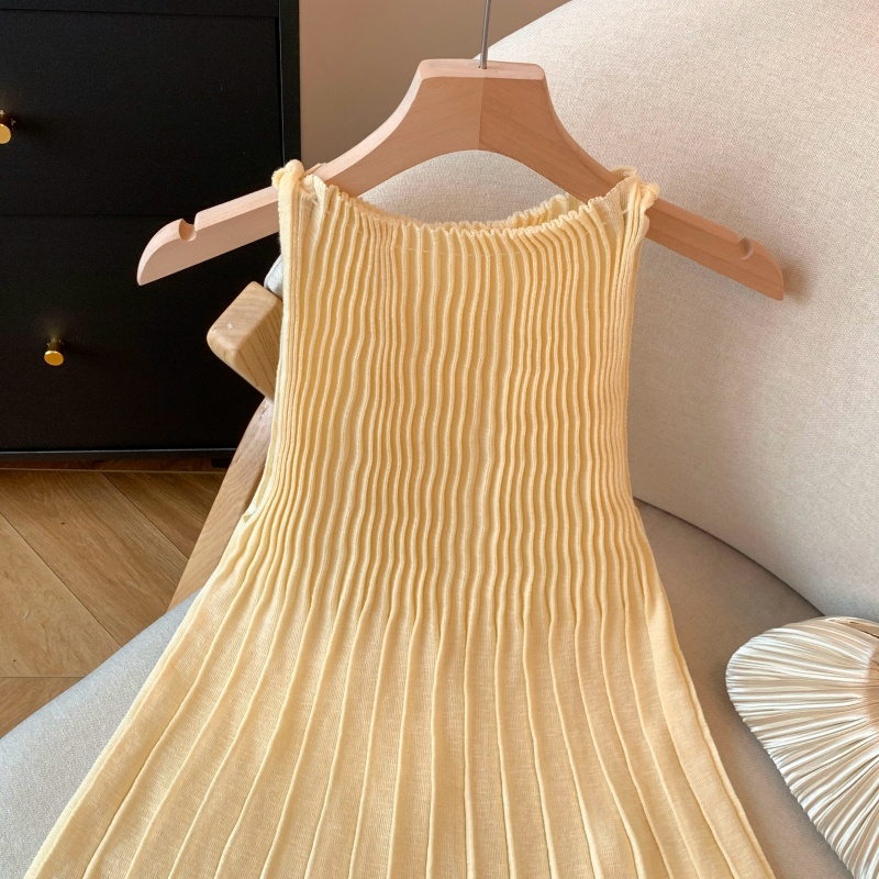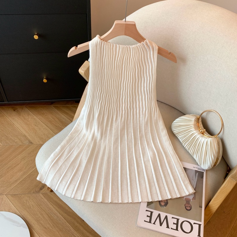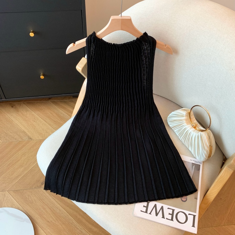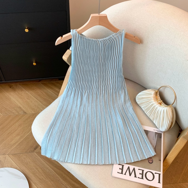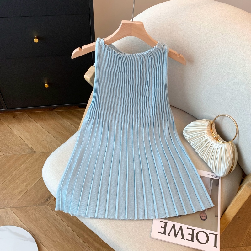 프랑스 스타일 라운드 넥 플리츠 니트 상의의 실제 사진, 2025년 여름 루즈하고 슬리밍 효과가 있는 여성용 슬리브리스 니트 조끼 상의.