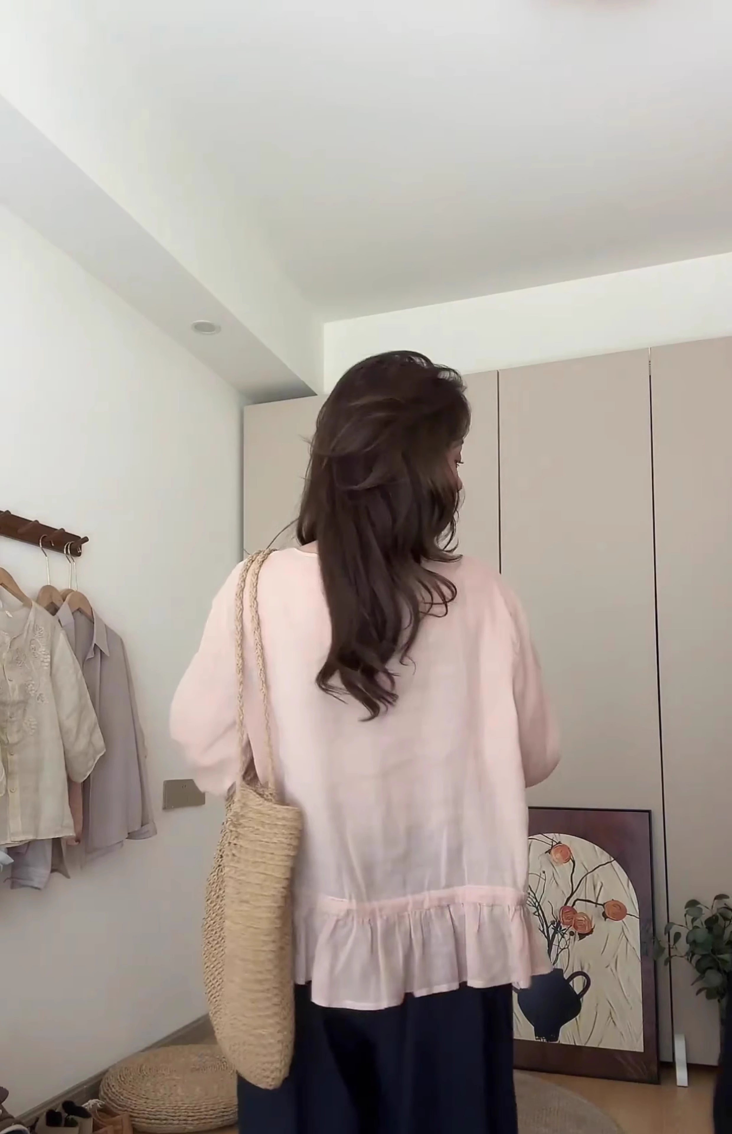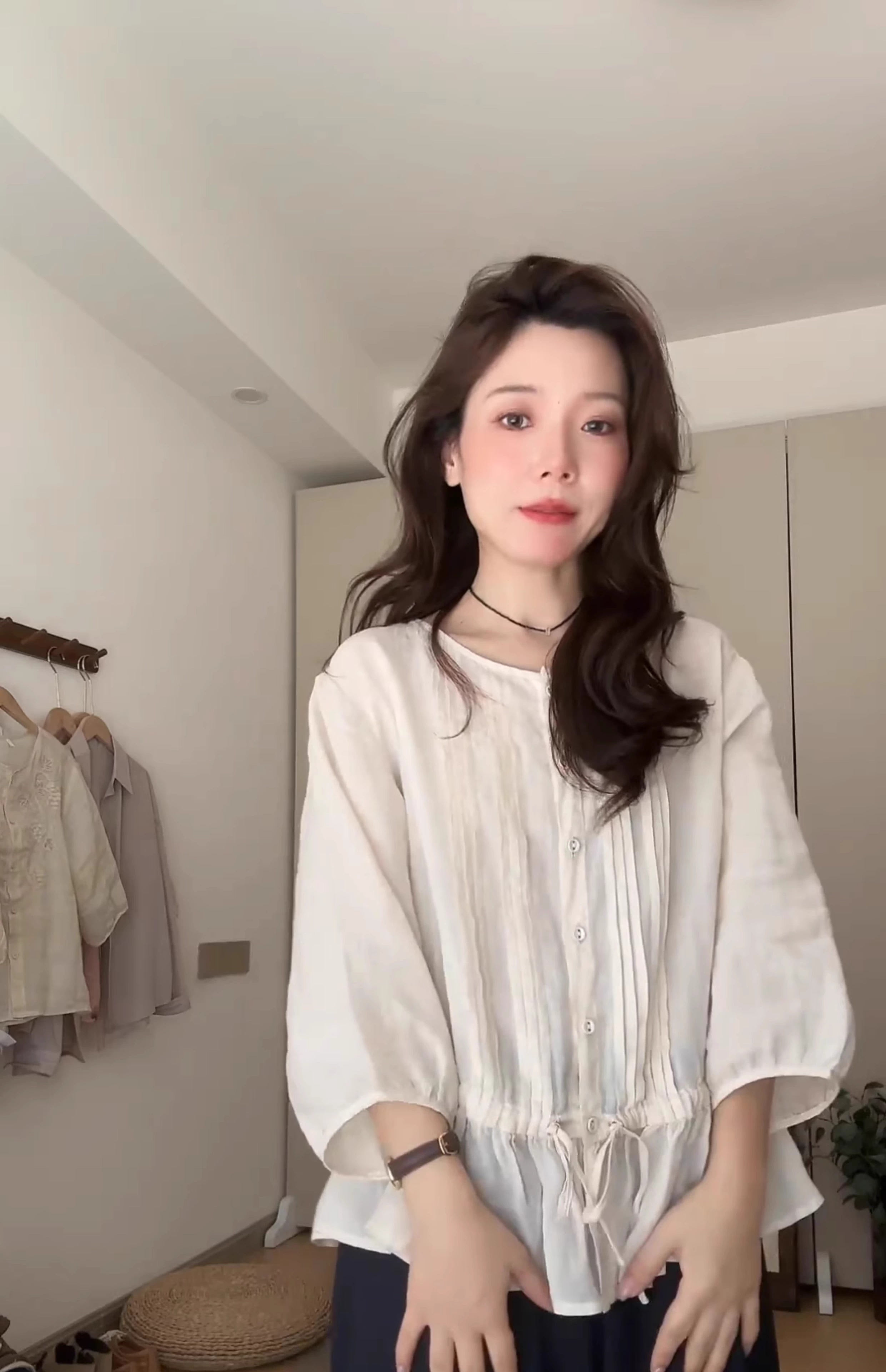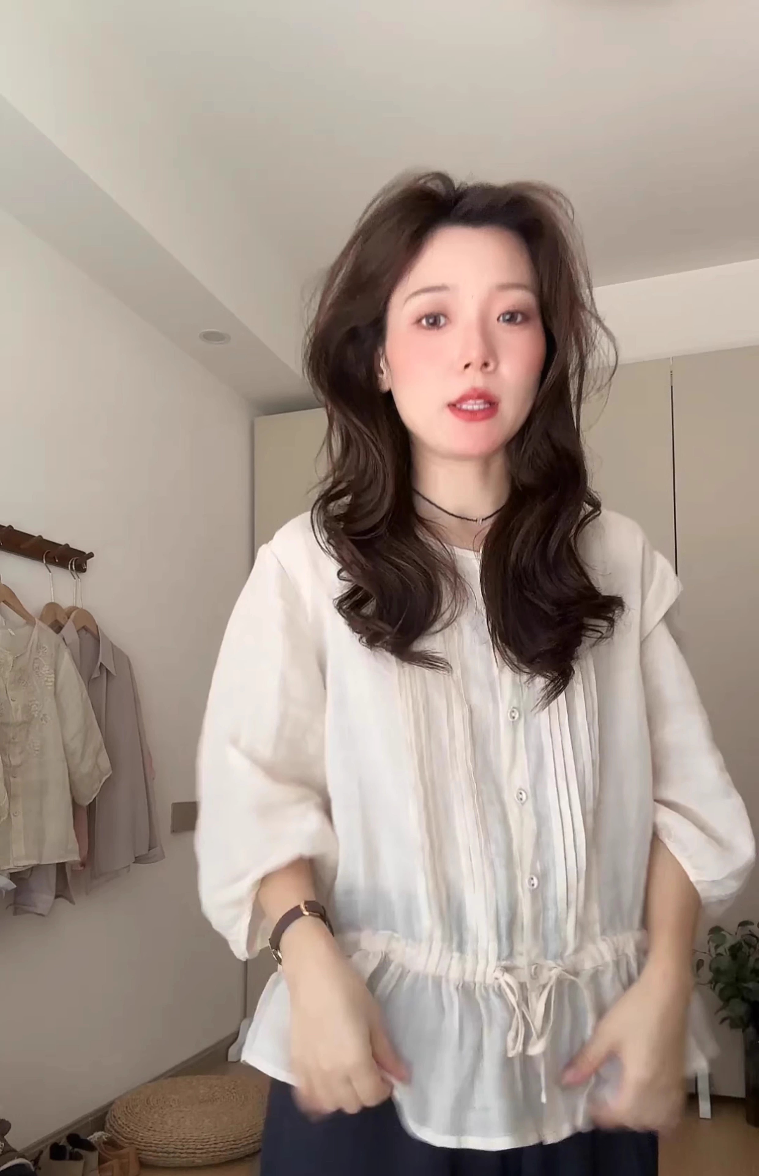 러플 밑단이 돋보이는 한국 스타일의 슬림핏 블라우스로, 매우 귀엽고, 루즈핏에 독특하고, 어려 보이는 라운드넥 디자인으로 트렌디합니다.