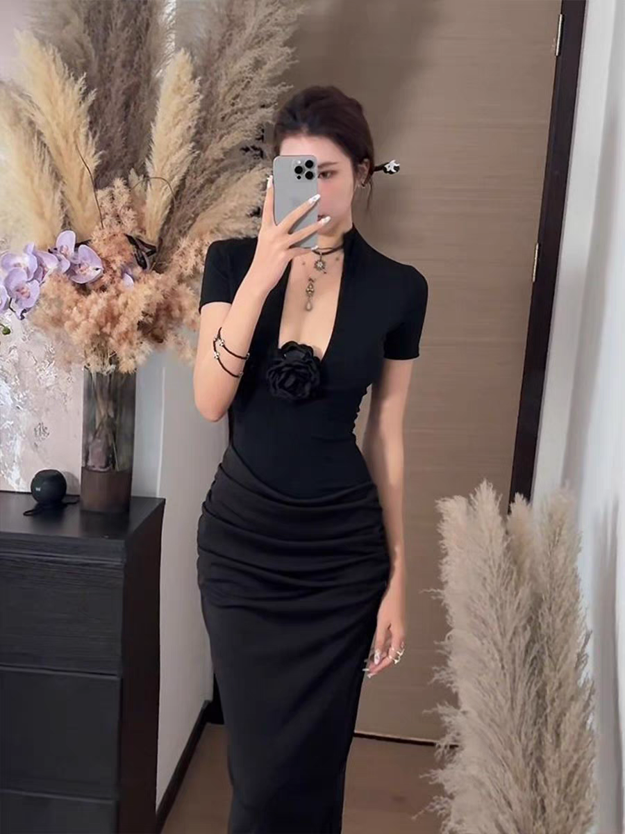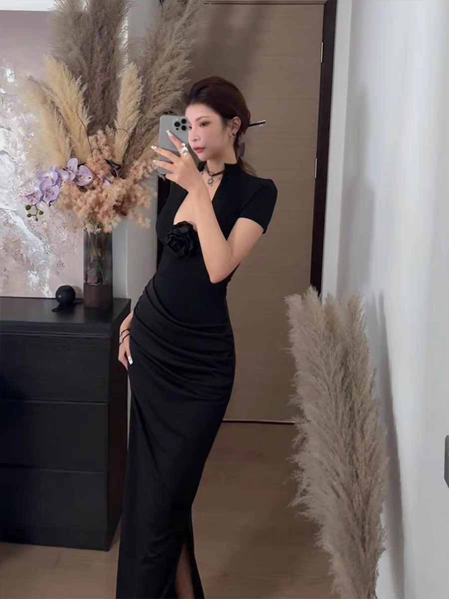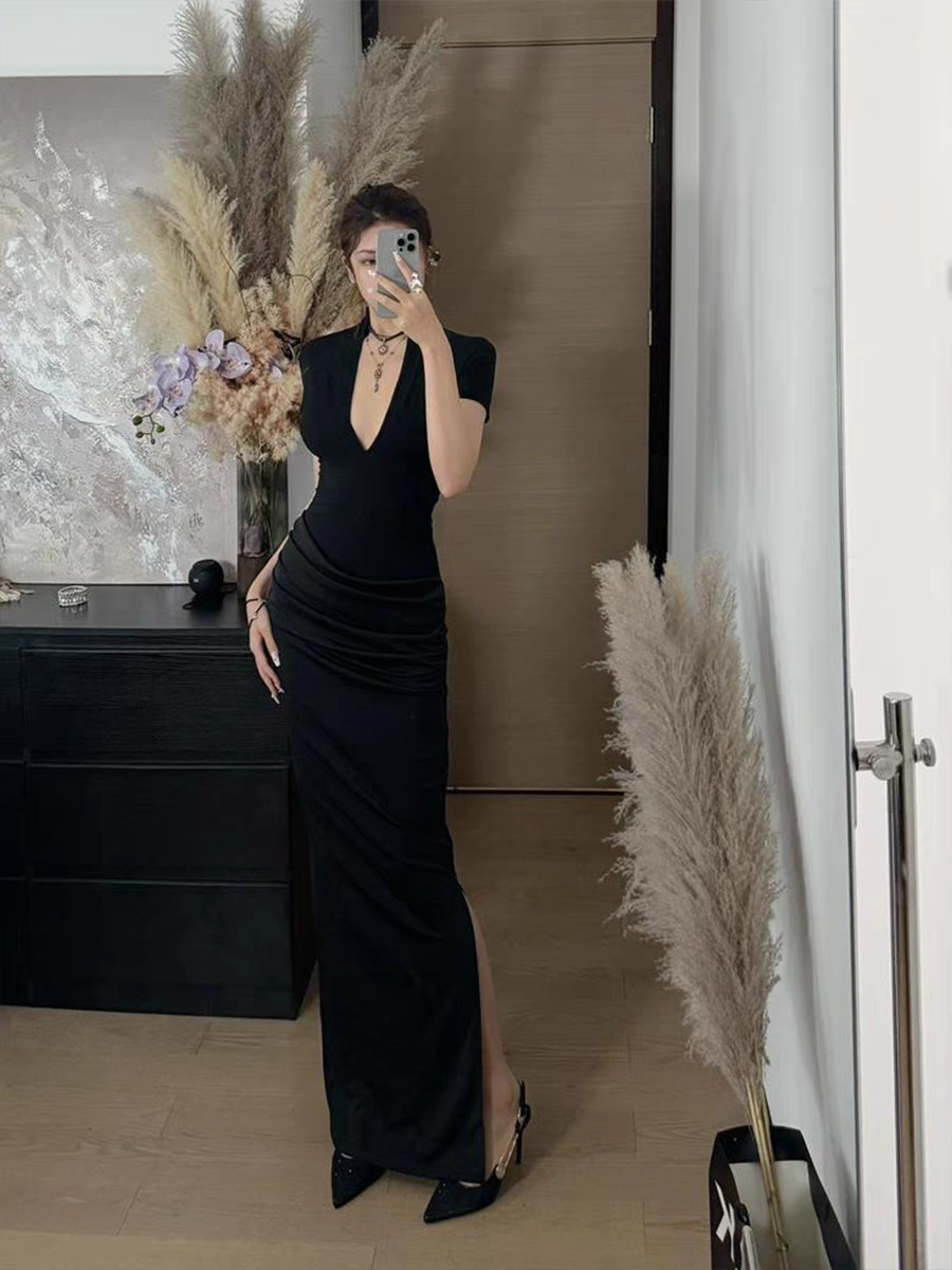 黑色气质新中式辣妹轻熟鱼尾裙高级性感显瘦长款开叉连衣裙御姐裙