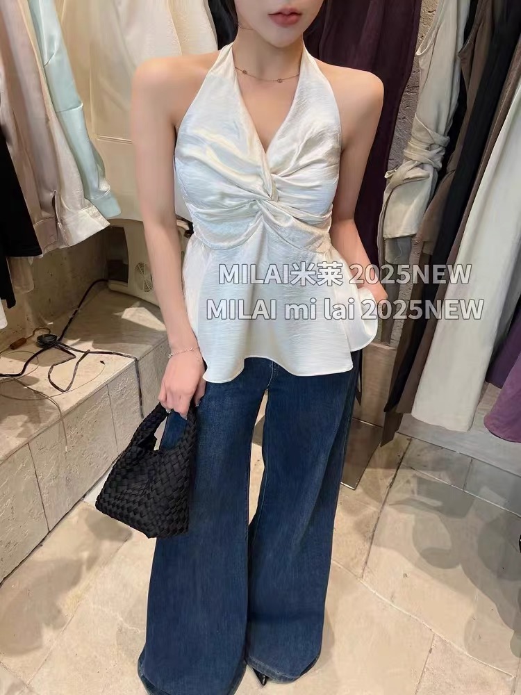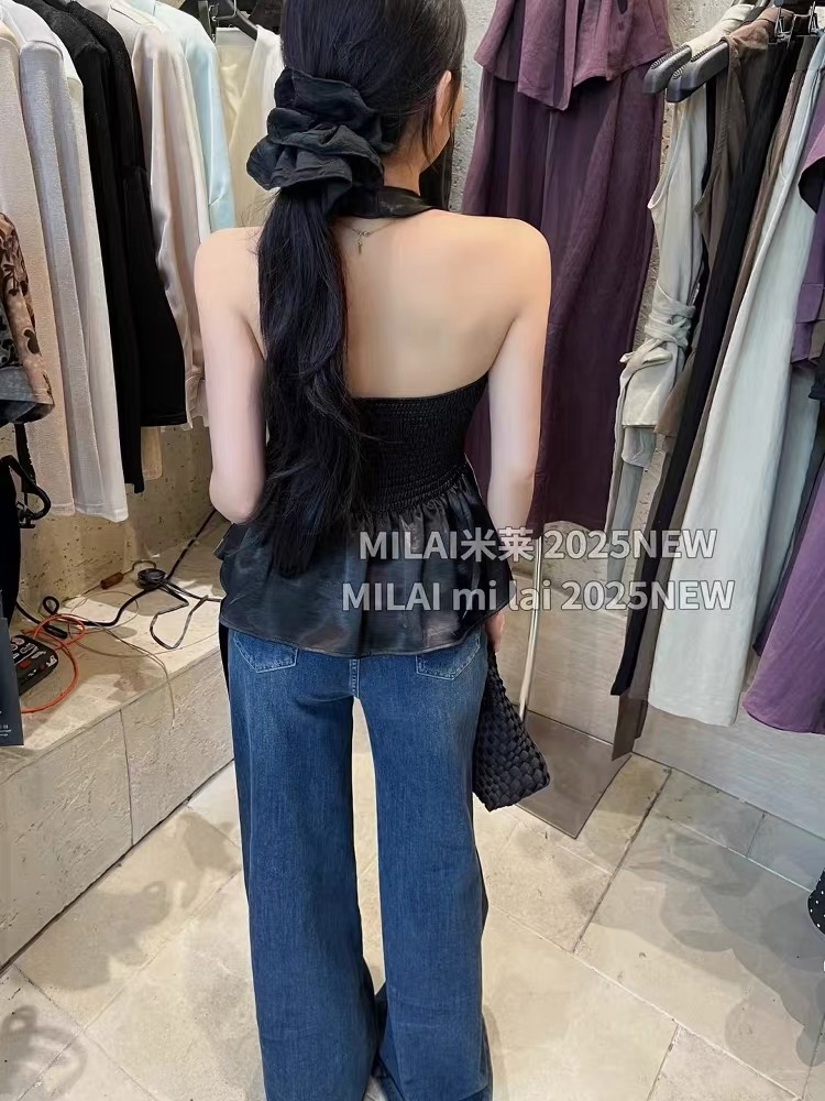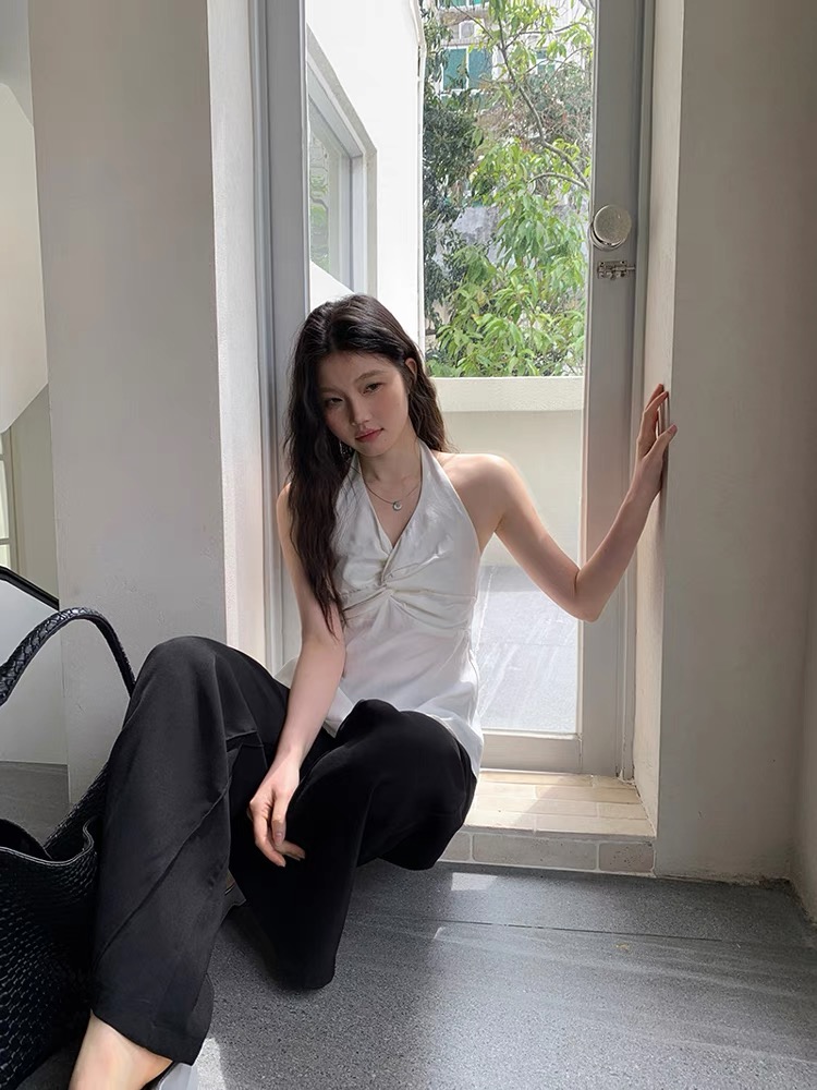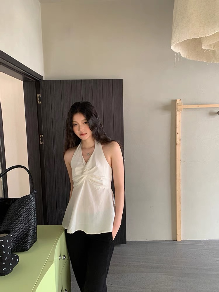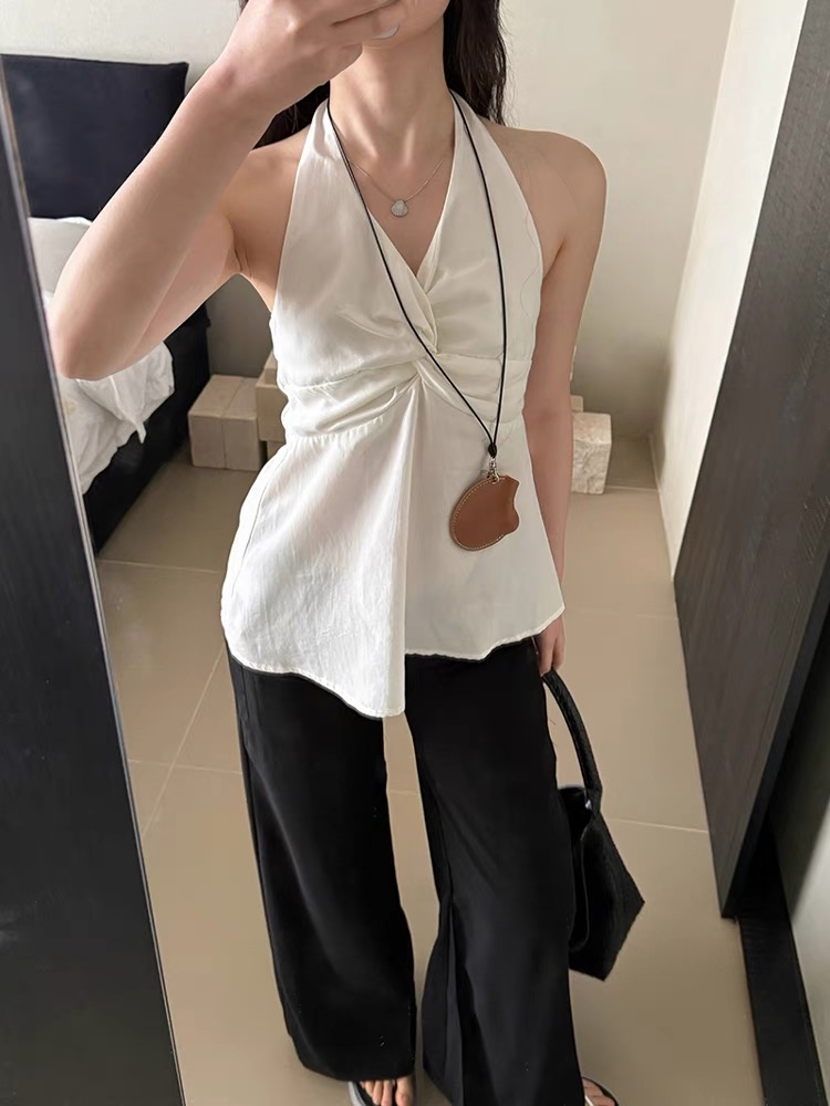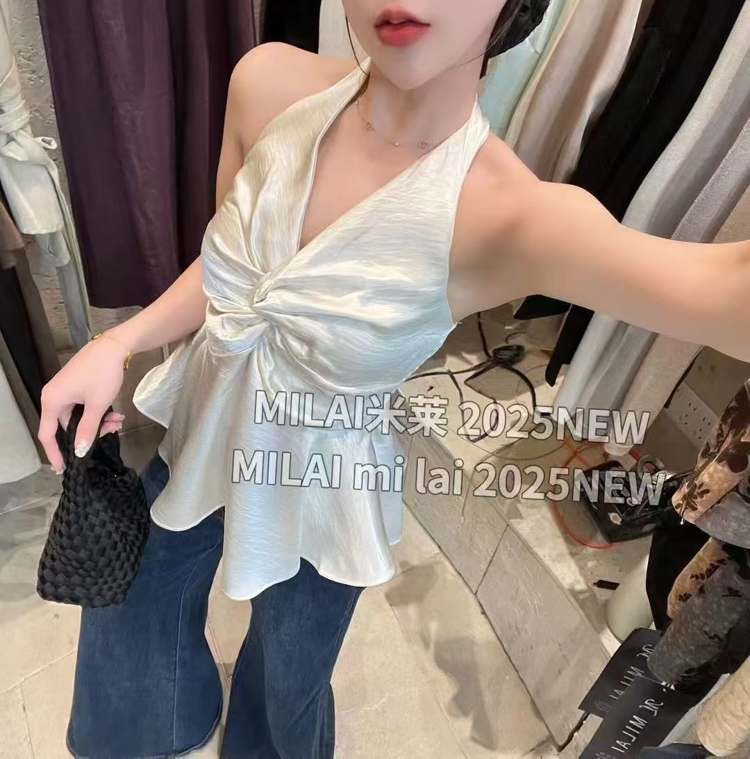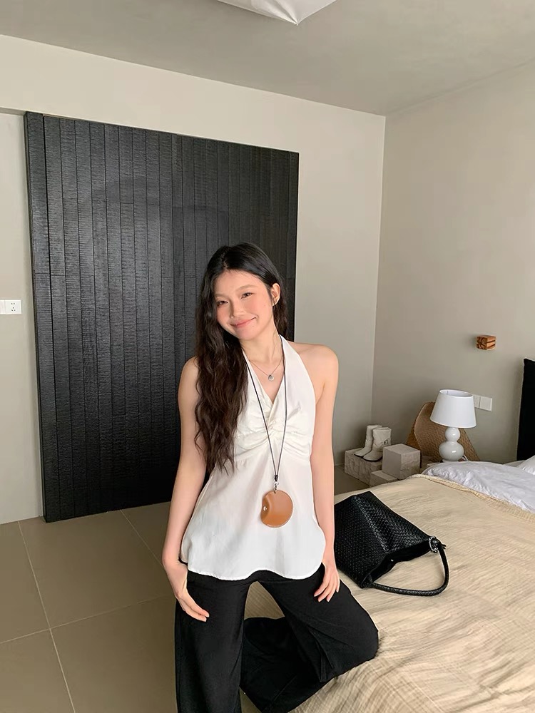 缎面挂脖吊带背心女夏季纯欲辣妹性感v领抹胸上衣泰式独特娃娃衫