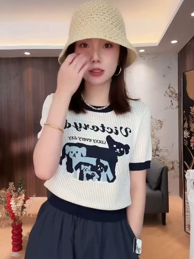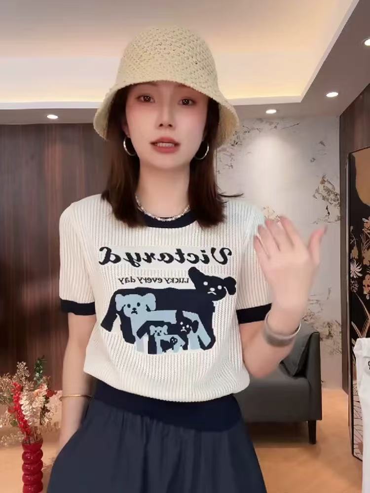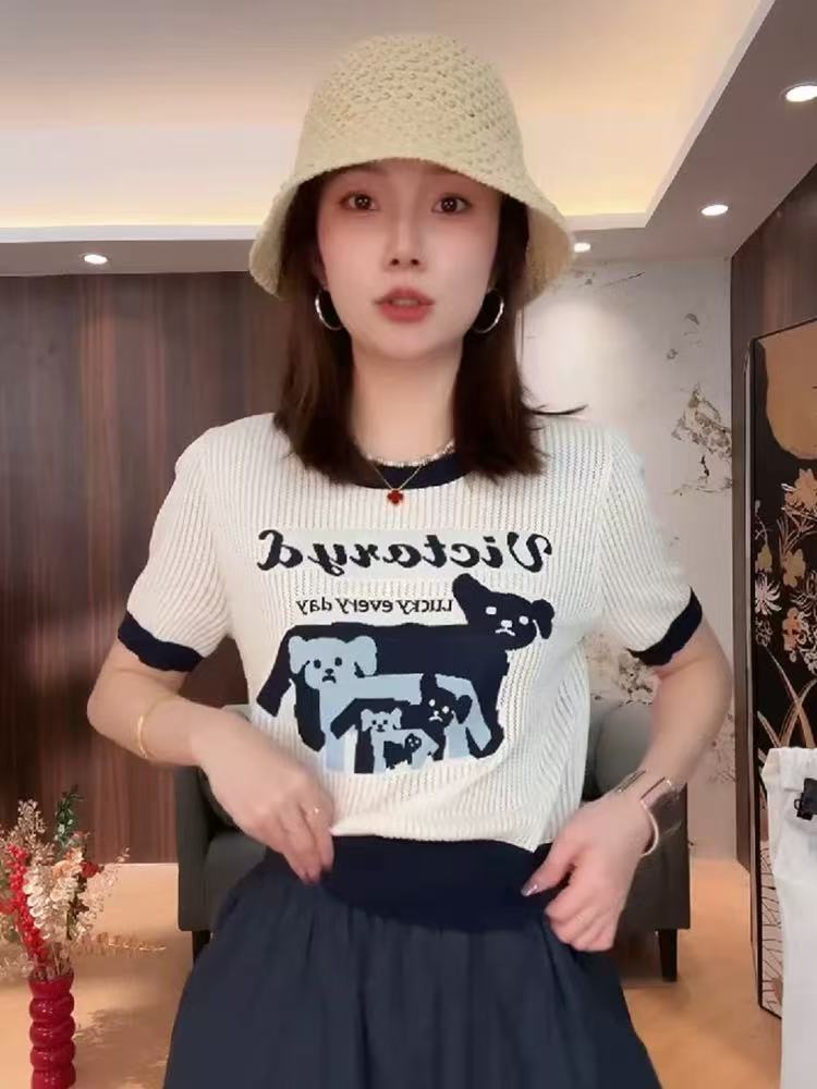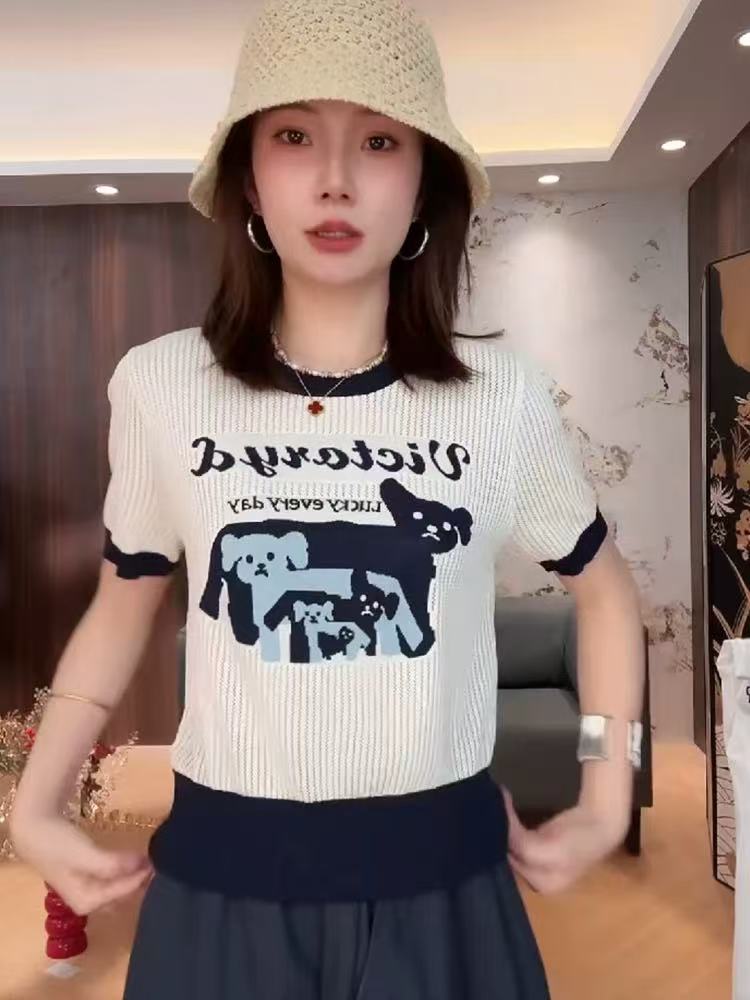 유럽 상품 2025년 여름 신상품 반팔 니트 T 디자인 대비 컬러 만화 나이 감소 패션 올매치 캐주얼 상의