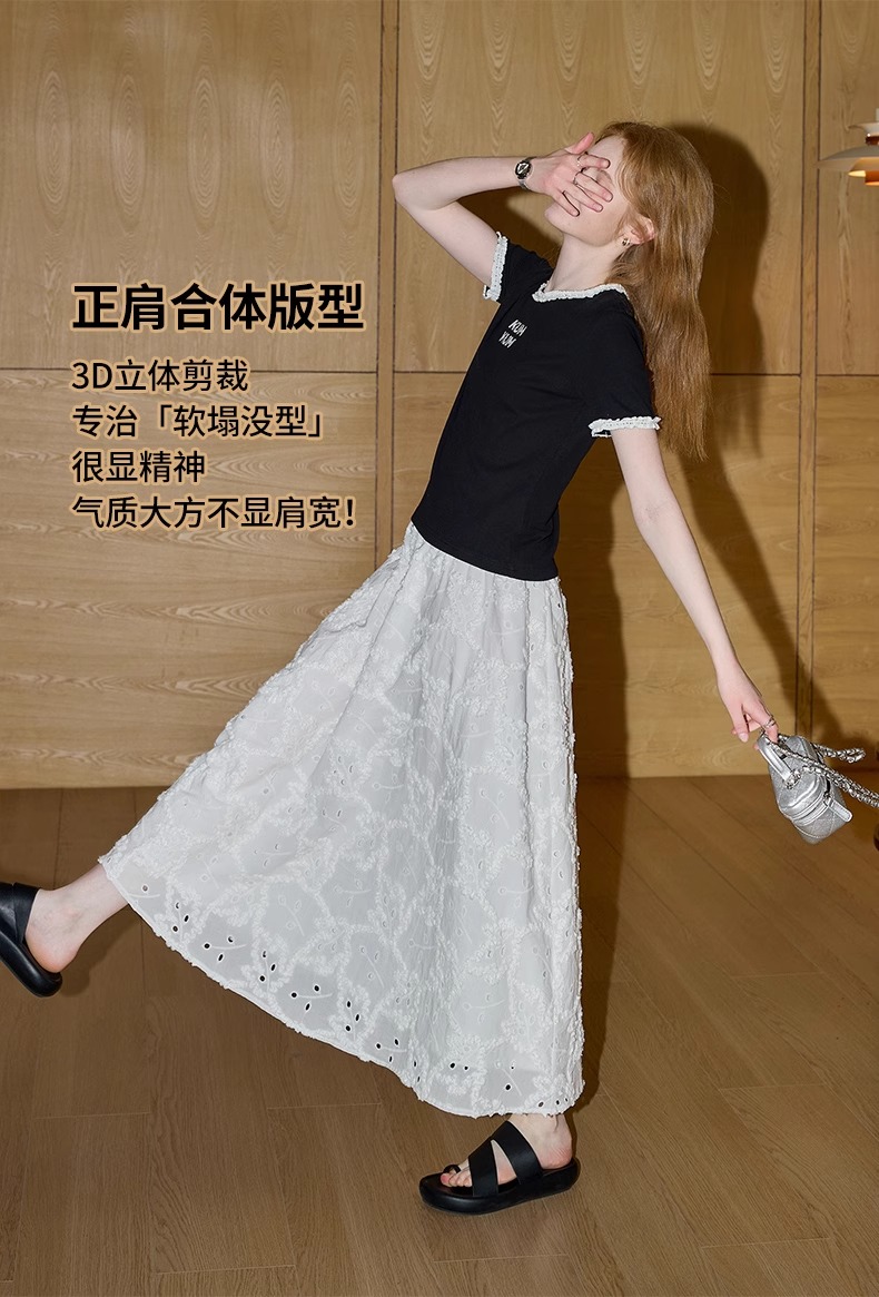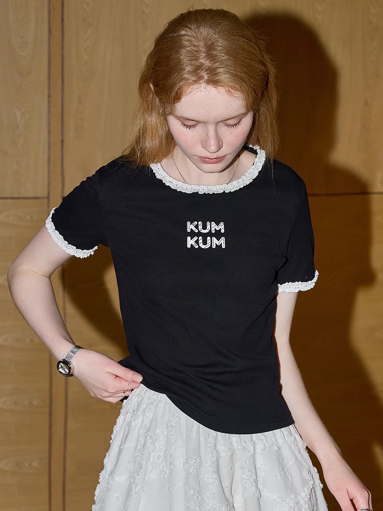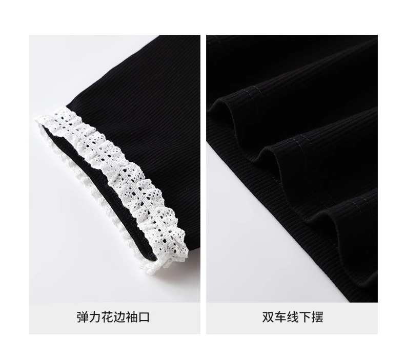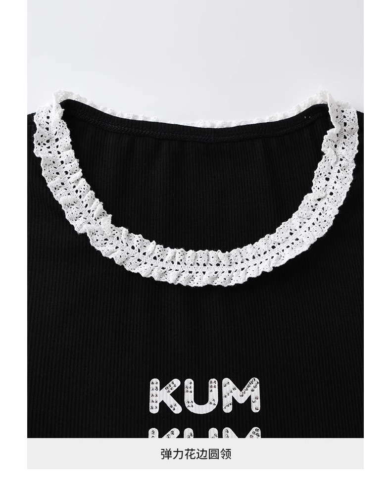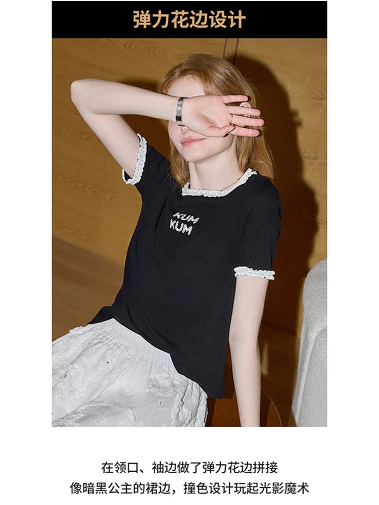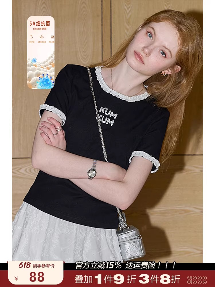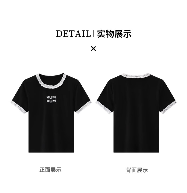 비실사 샷 달콤하고 매콤한 소녀 스타일 레이스 스플라이싱 반팔 티셔츠 여성 2025 여름 신상품 슬림 숏 탑