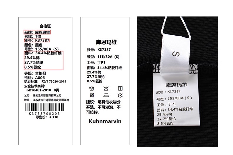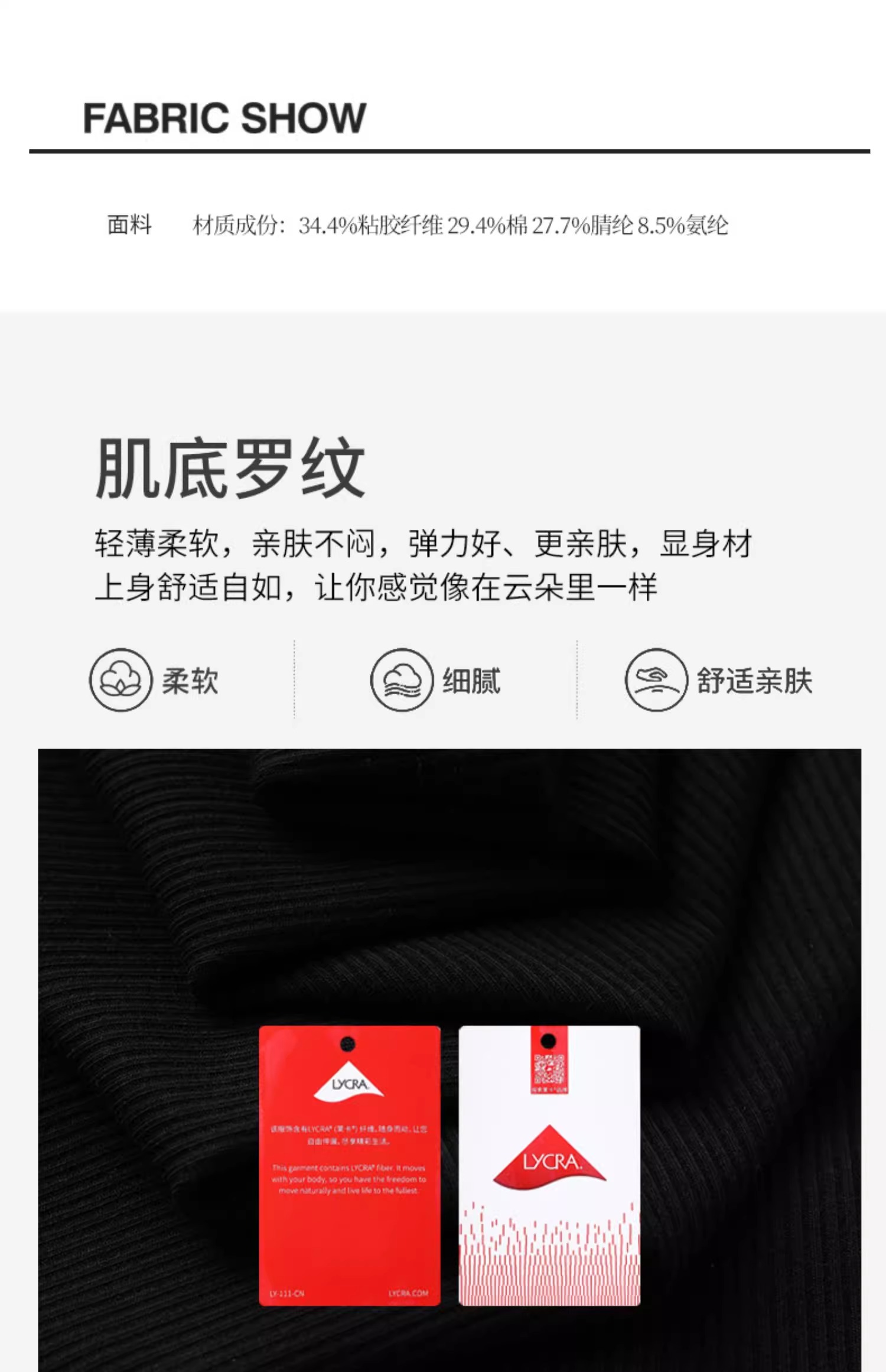 비스코스/비스코스 34.4%; 면 29.4%; 아크릴 27.7%; 스판덱스/라이크라 8.5%