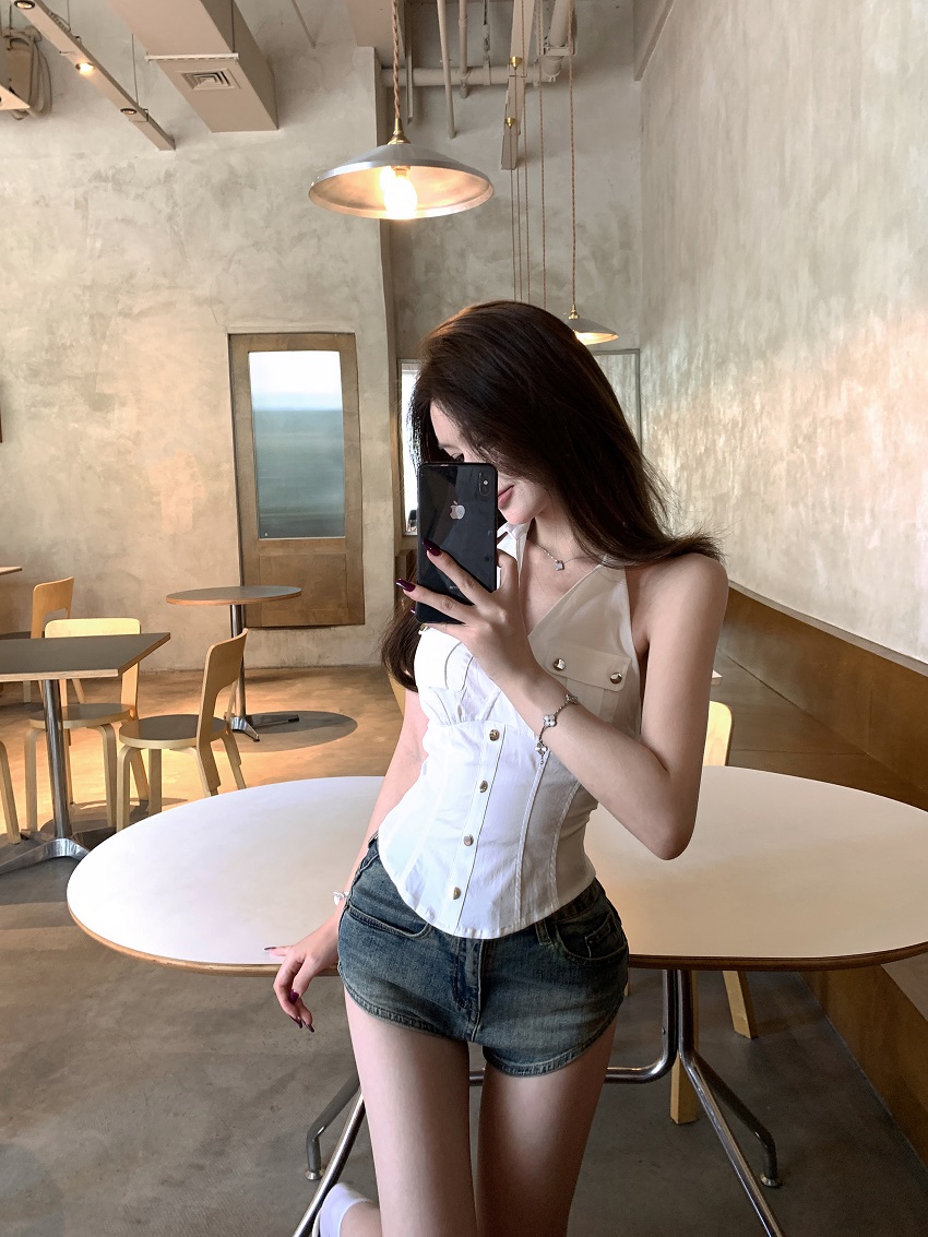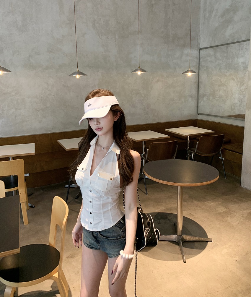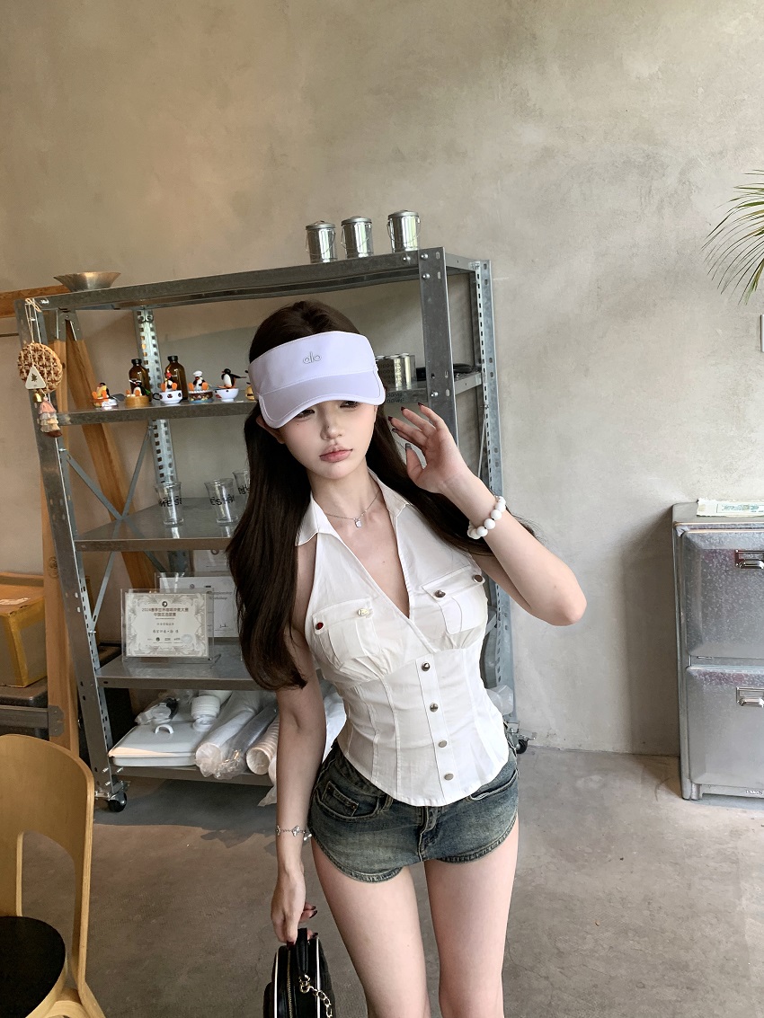 实拍实价 无袖衬衫女夏季美式复古工装挂脖白色上衣