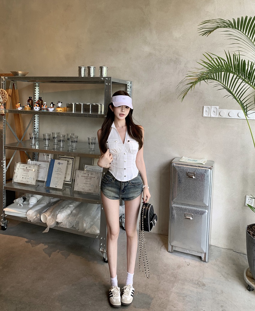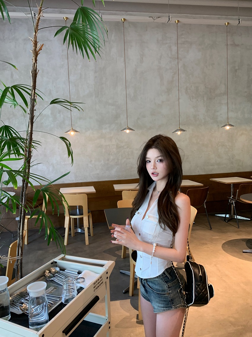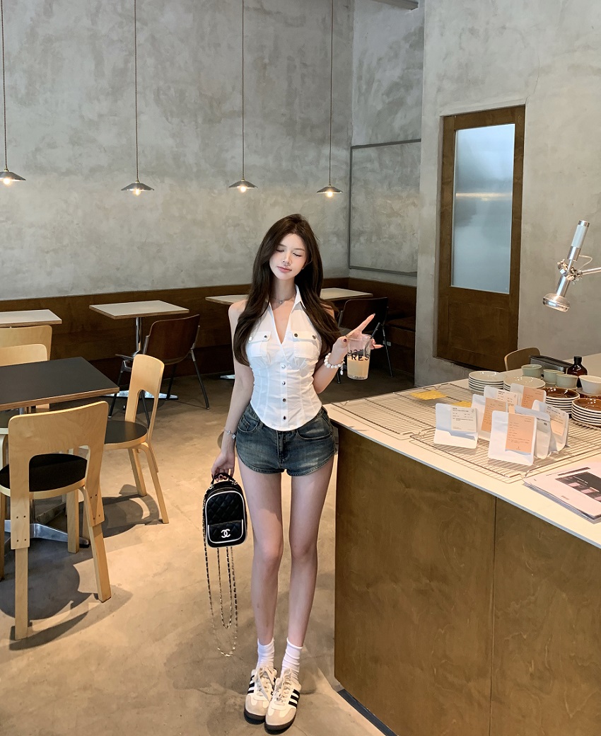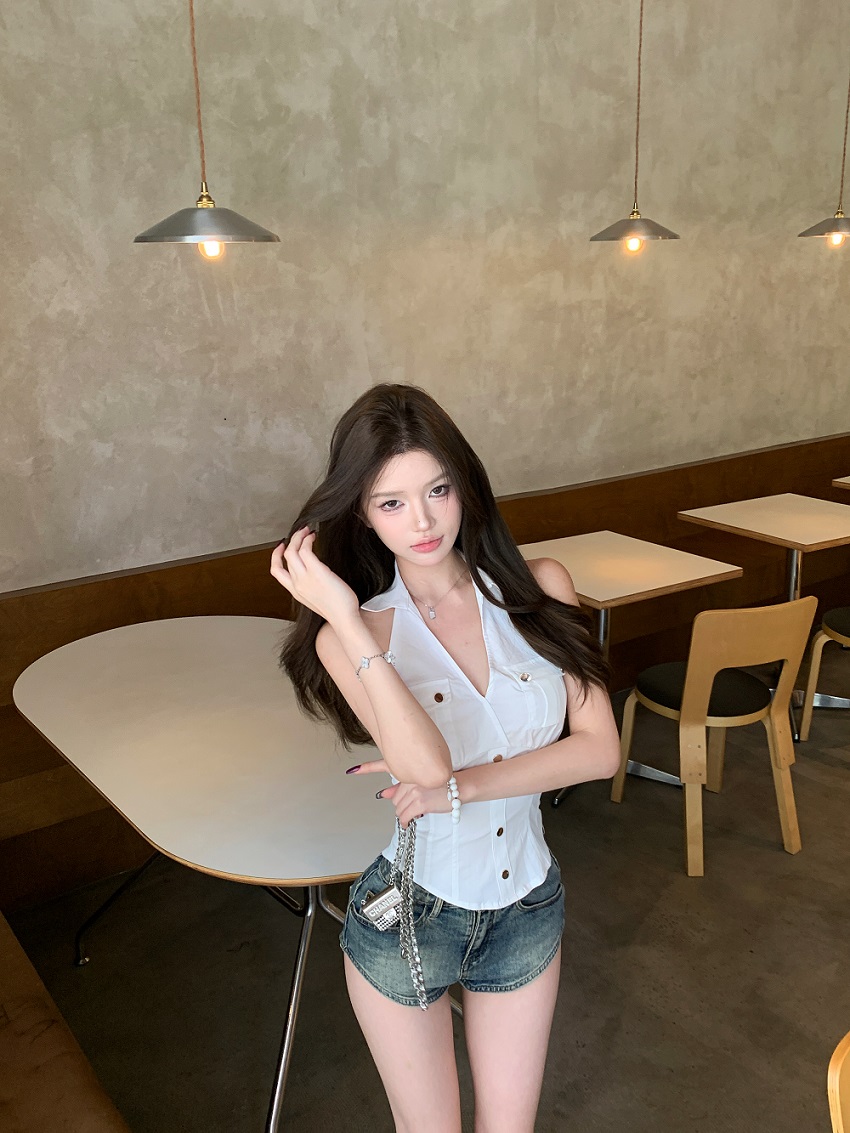 实拍实价 无袖衬衫女夏季美式复古工装挂脖白色上衣