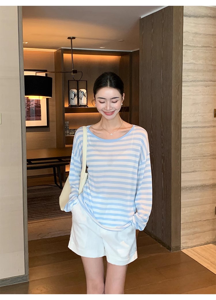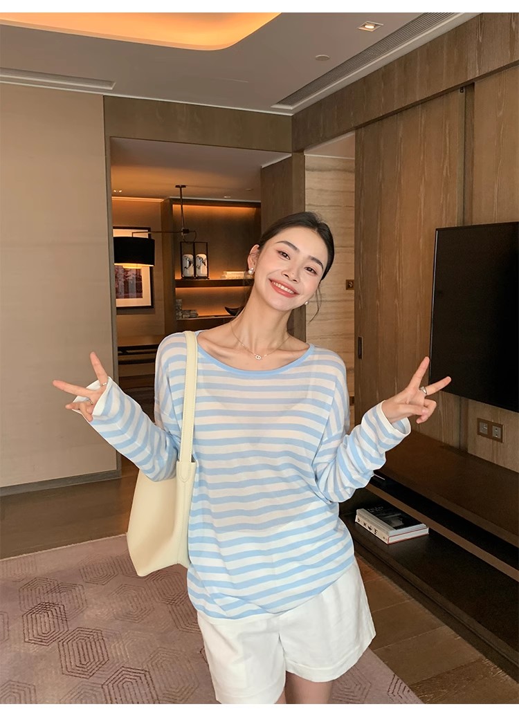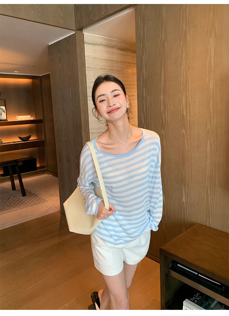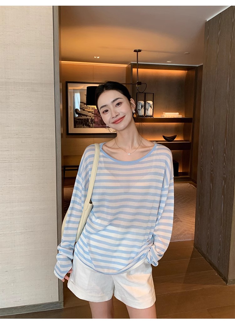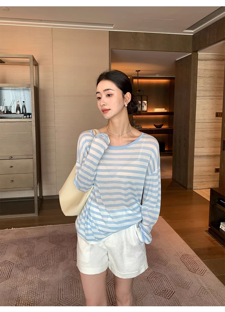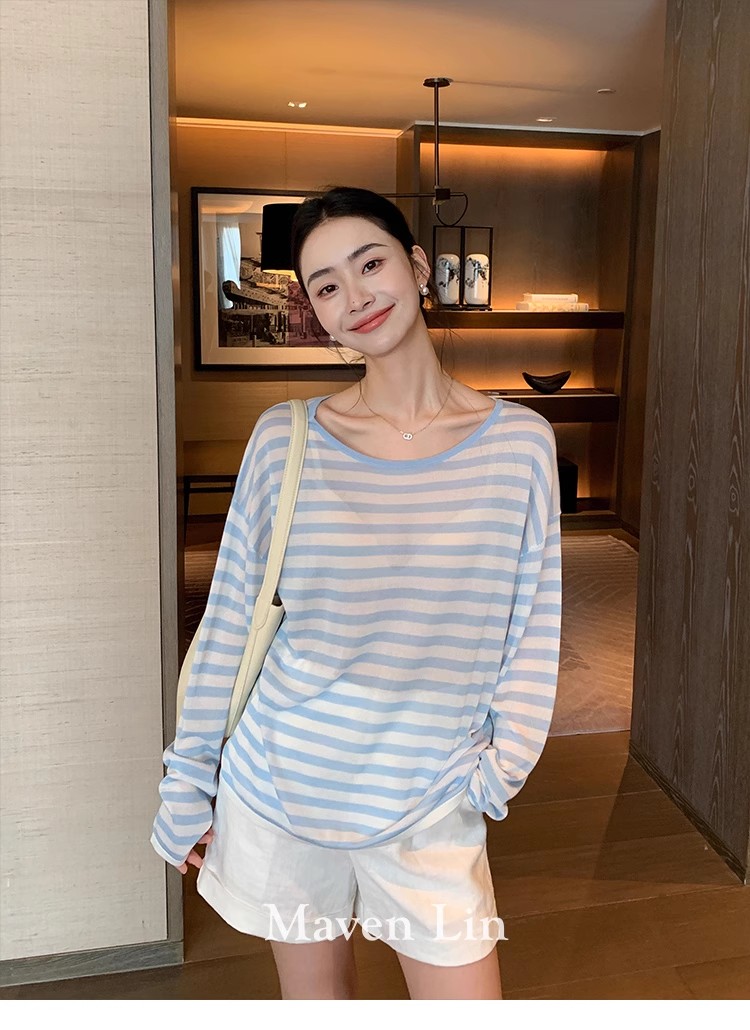 Maven Lin 1/30支醋酸胶原蛋白纱|条纹长袖上衣女大圆领防晒罩衫