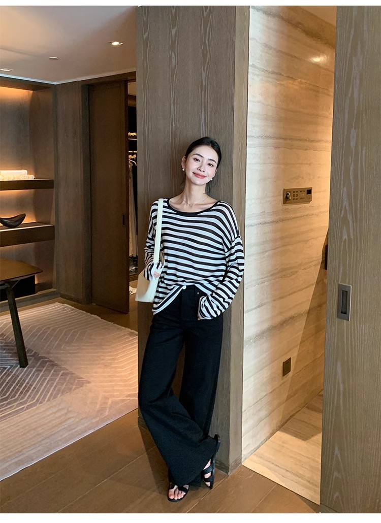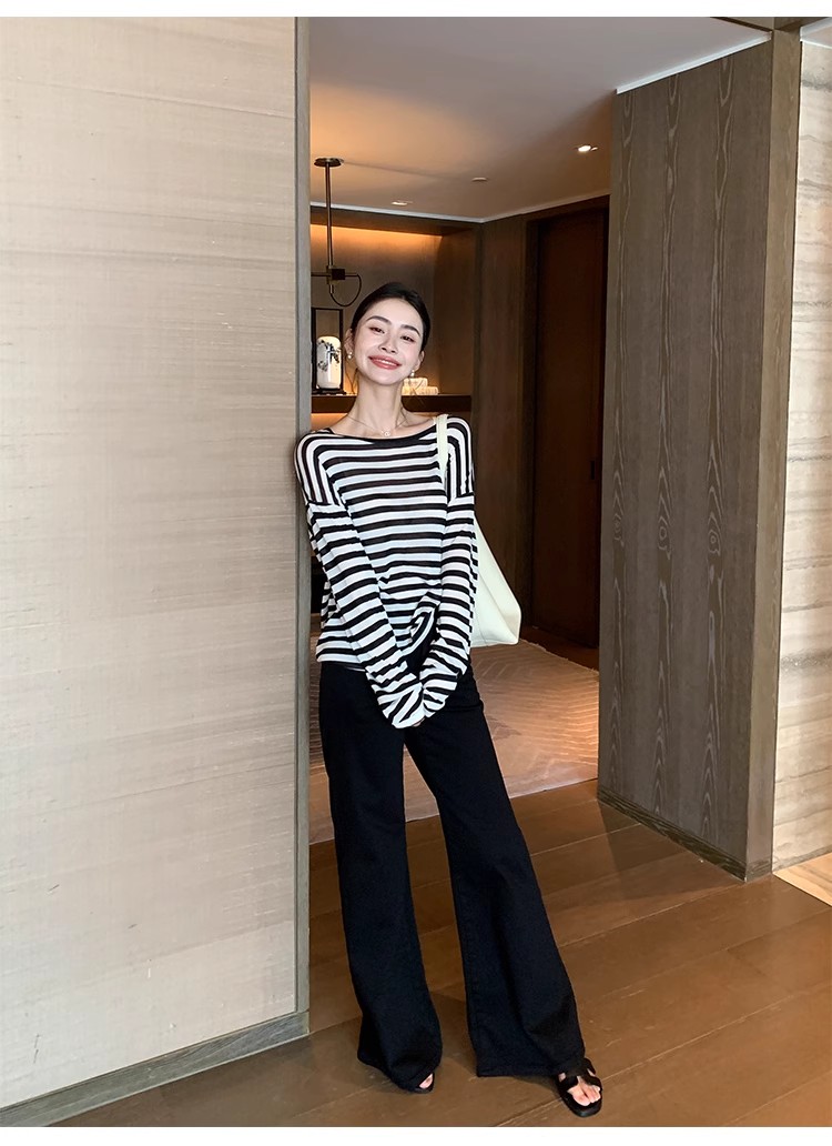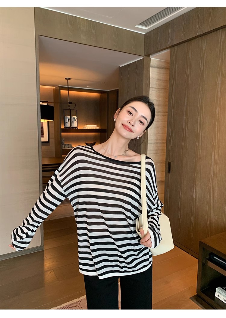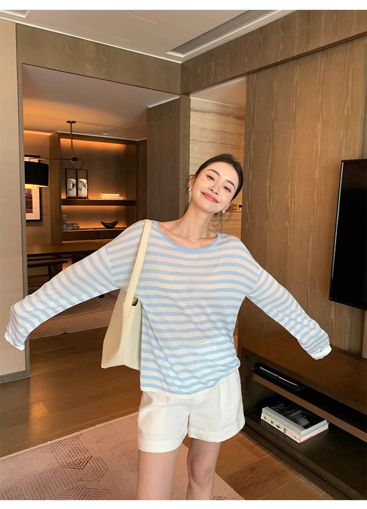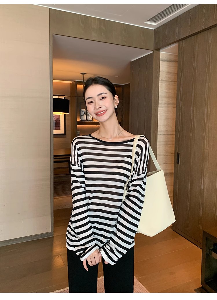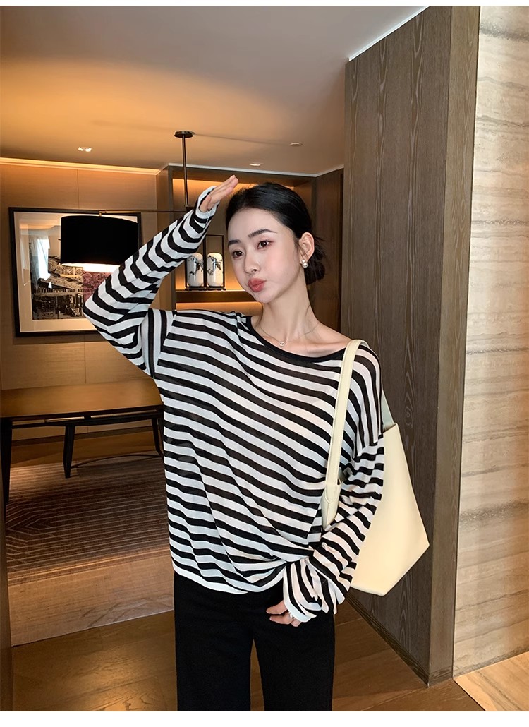Maven Lin 1/30支醋酸胶原蛋白纱|条纹长袖上衣女大圆领防晒罩衫