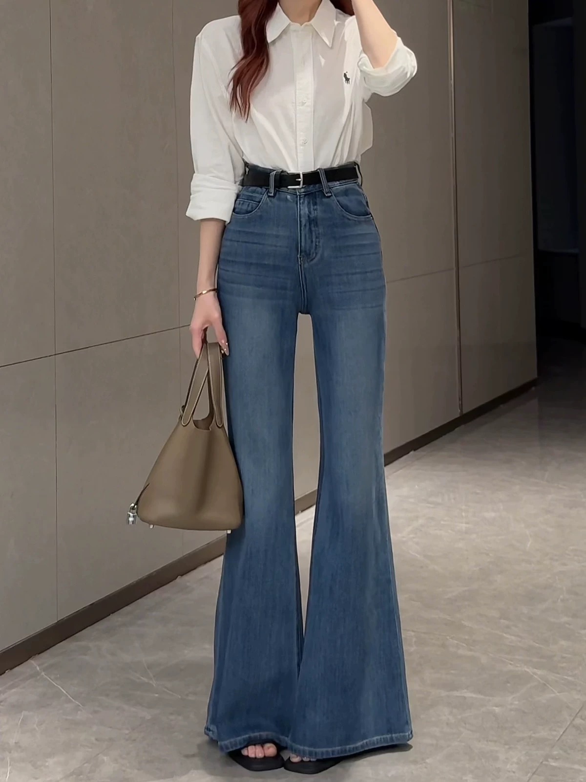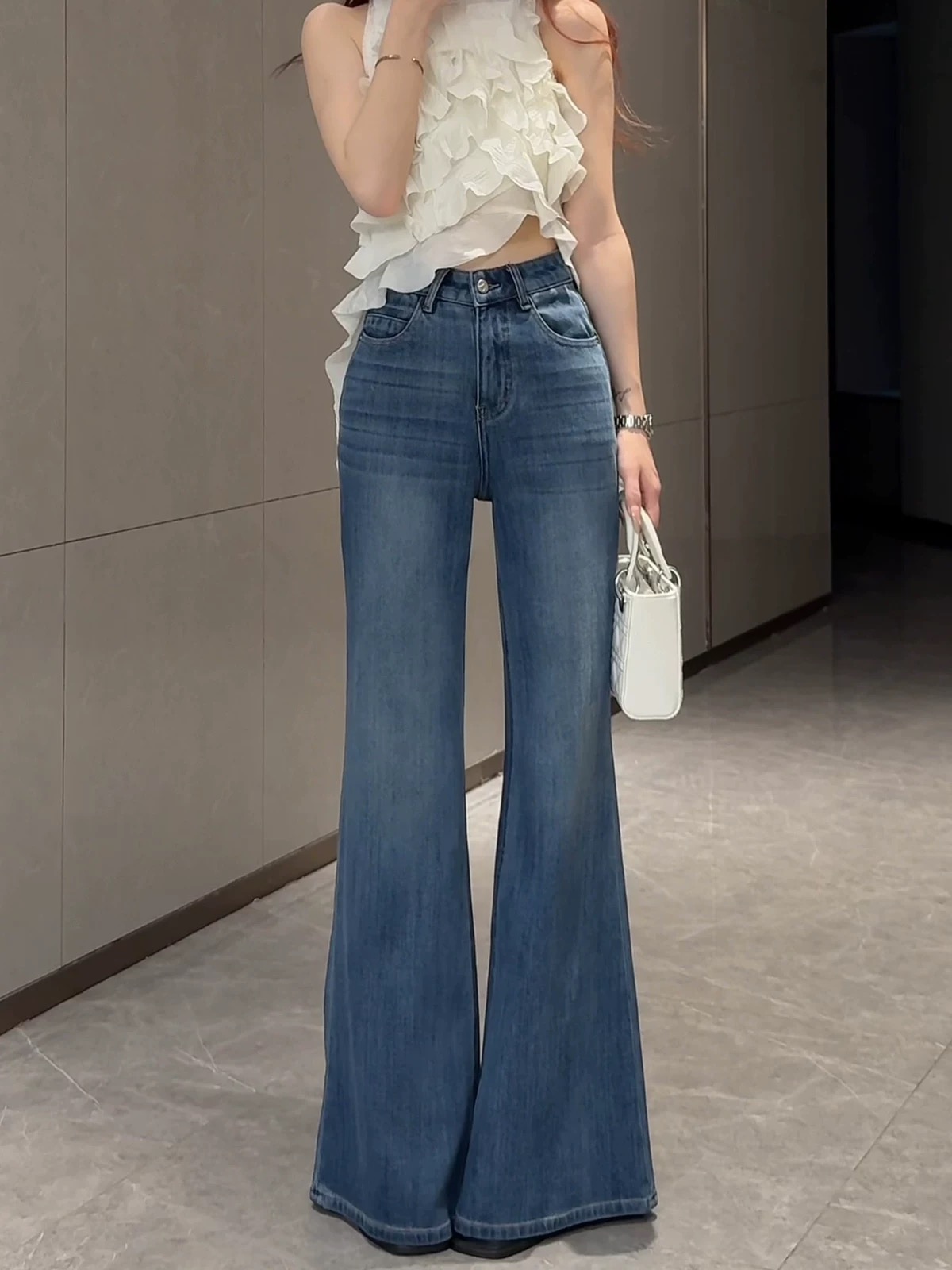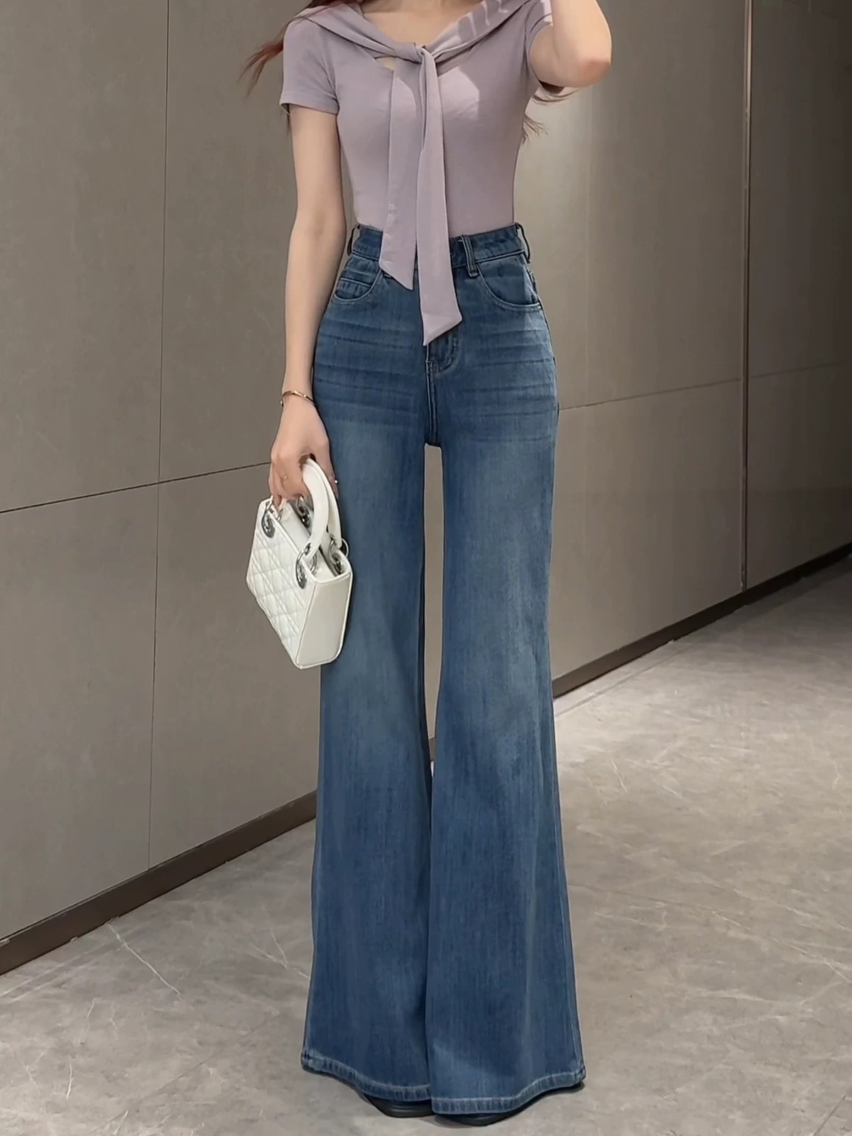 韩系蓝色复古气质高腰微喇牛仔裤女夏季新款宽松垂感不贴腿喇叭裤