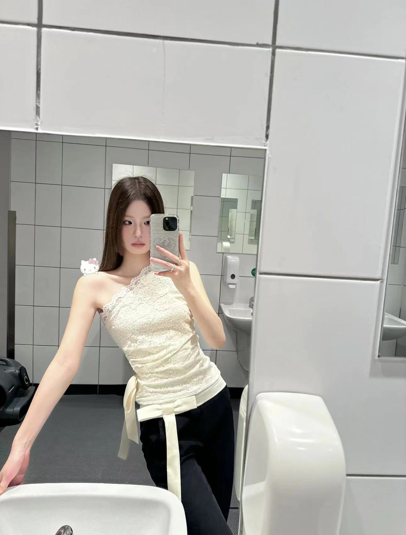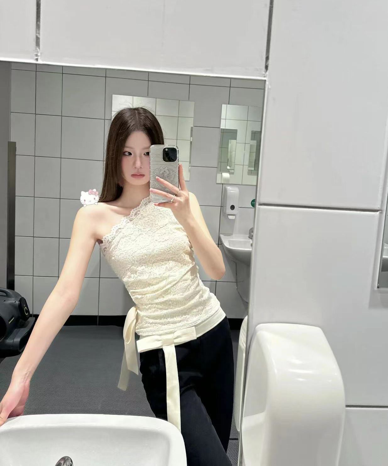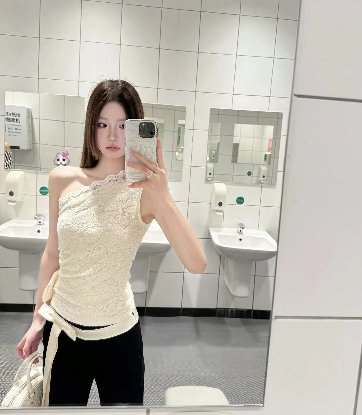 实拍实价 蕾丝斜肩蝴蝶结镂空背心上衣女夏新款辣妹露肩露腰内搭