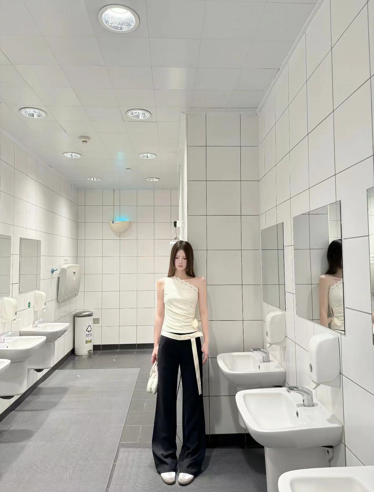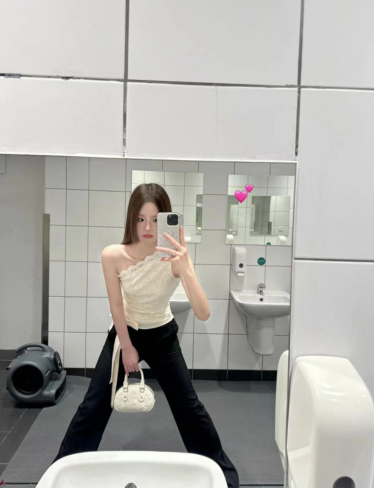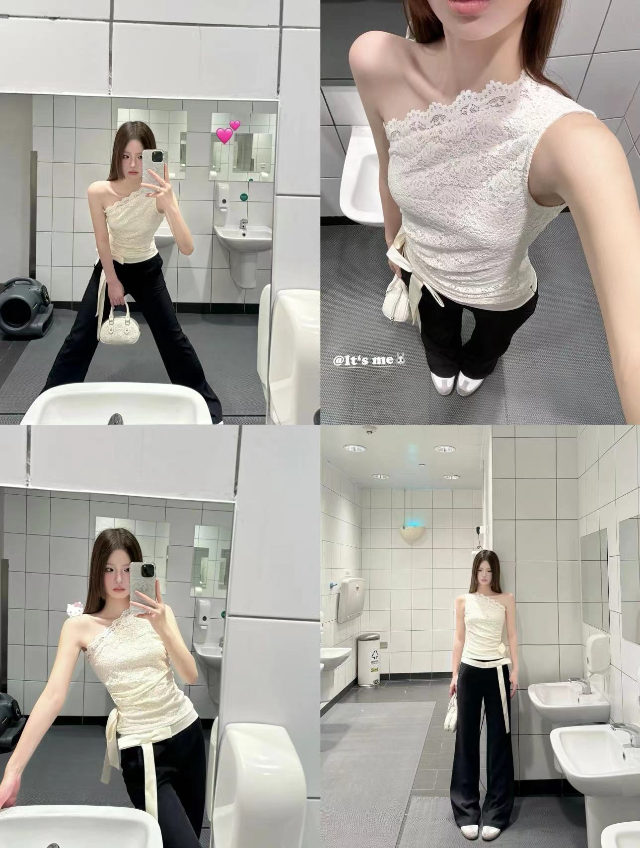 实拍实价 蕾丝斜肩蝴蝶结镂空背心上衣女夏新款辣妹露肩露腰内搭