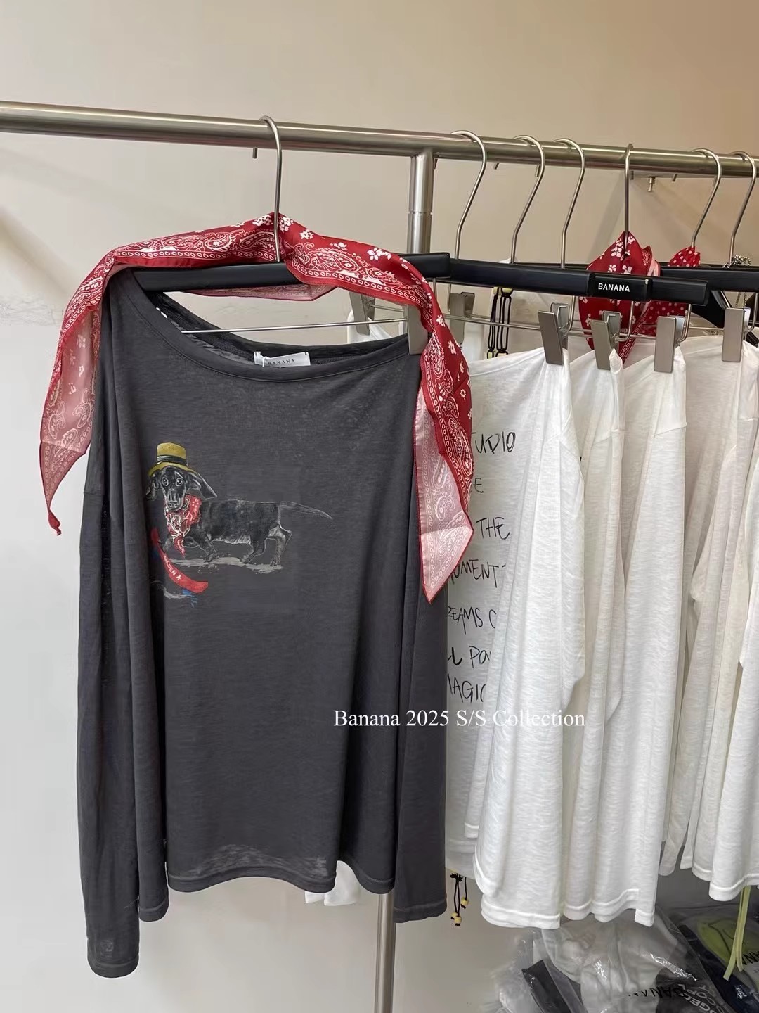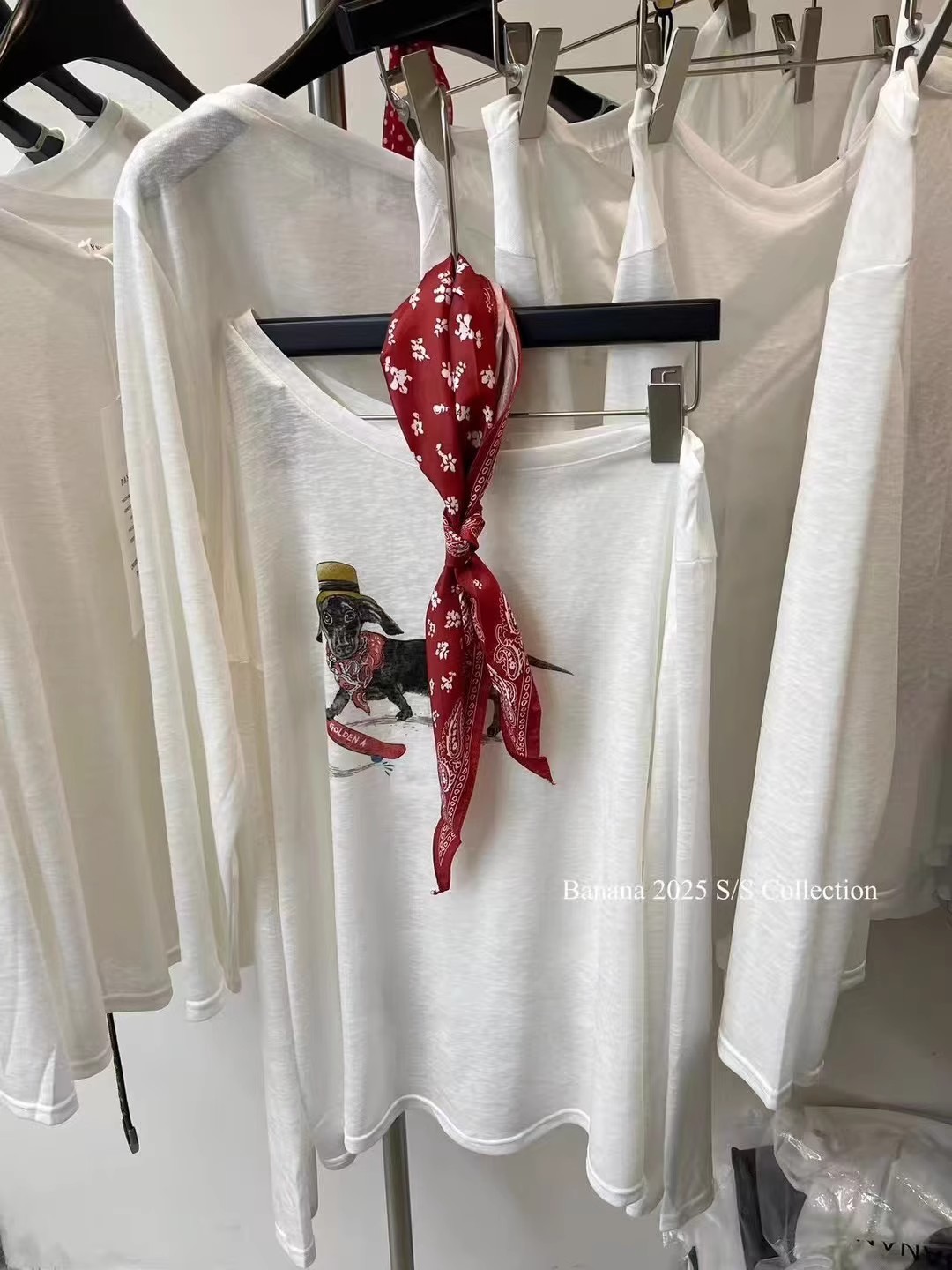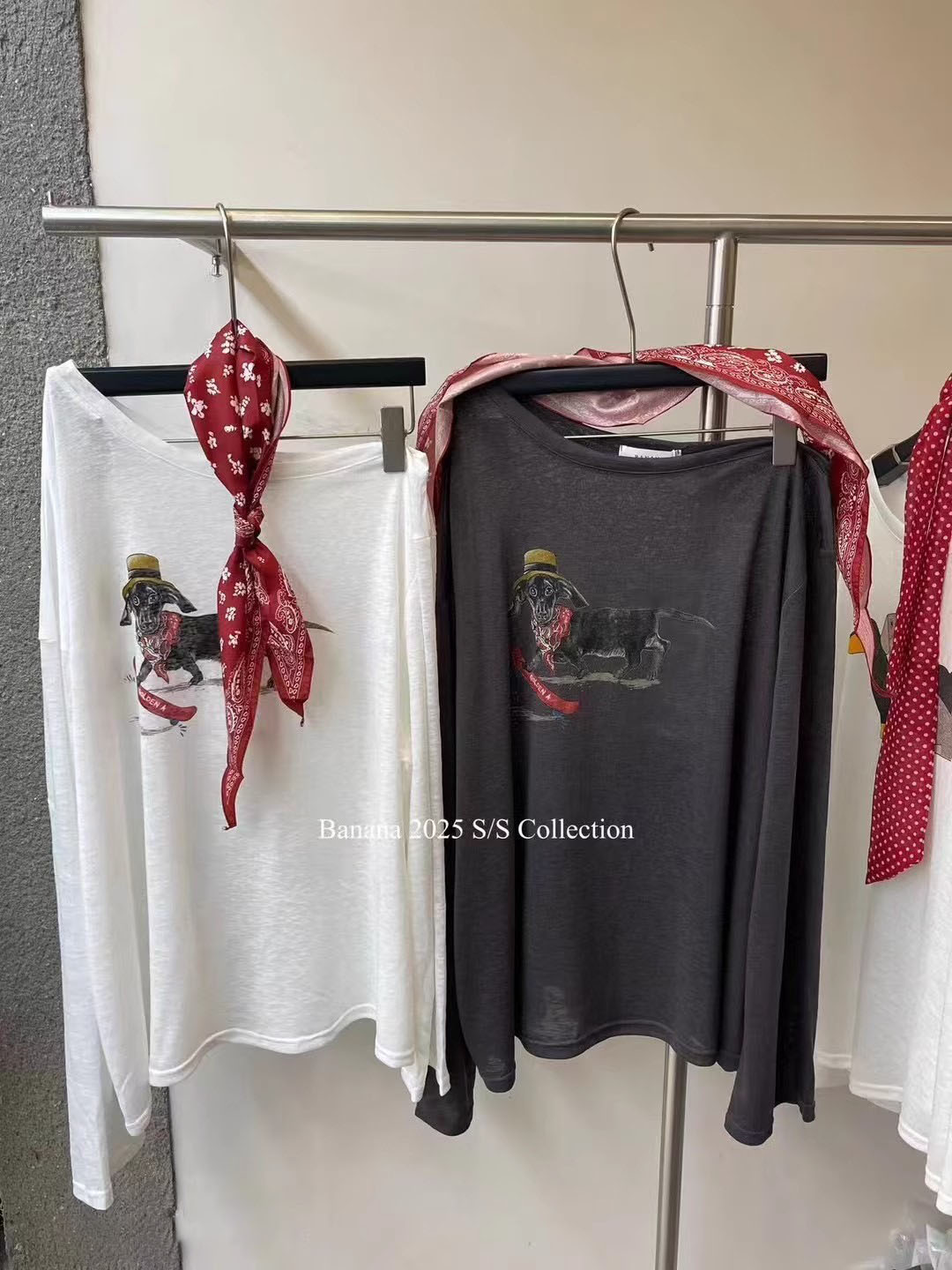 韩国东大门夏季新款卡通小狗印花薄款防晒罩衫长袖斜肩T恤上衣女