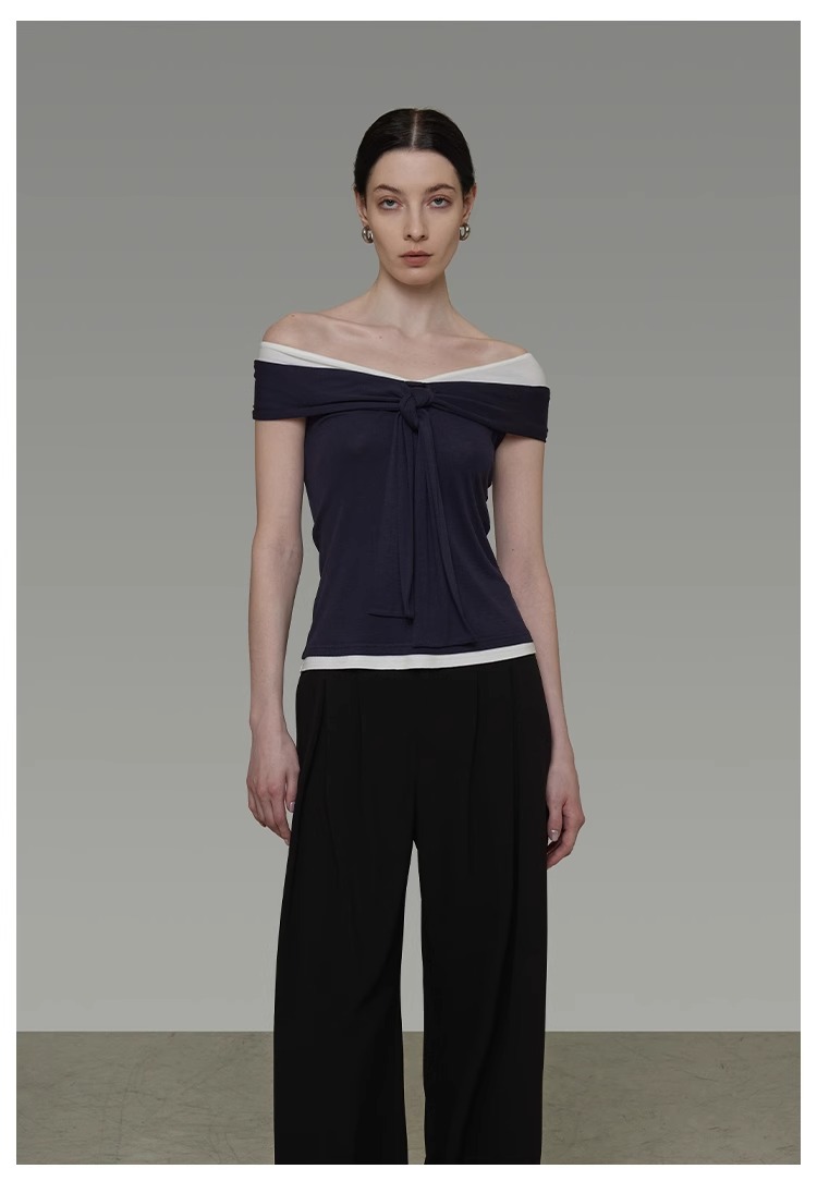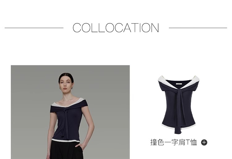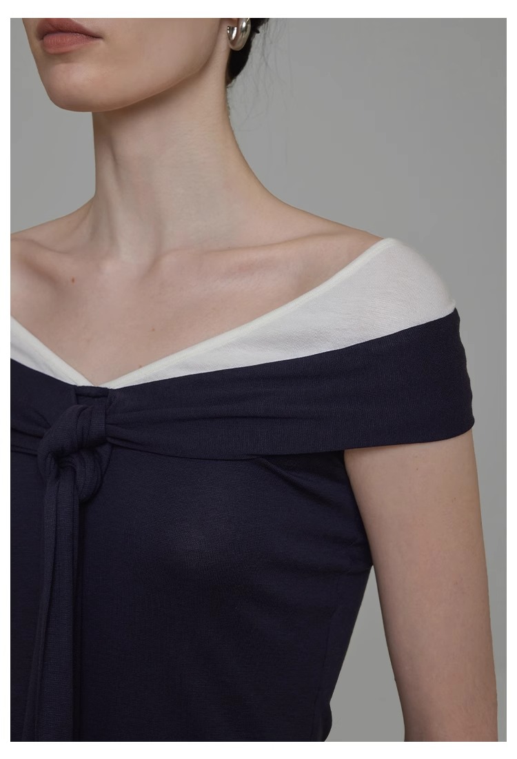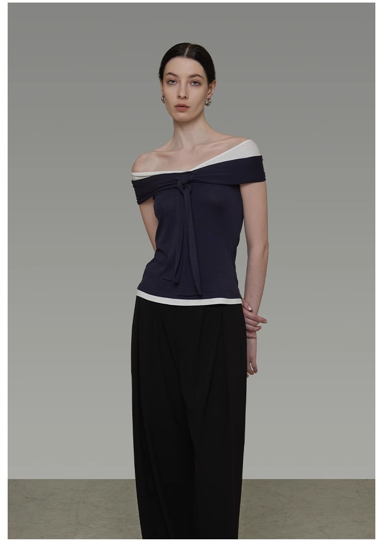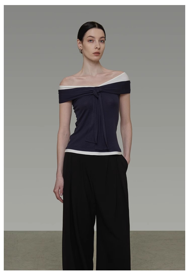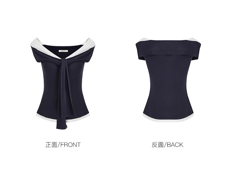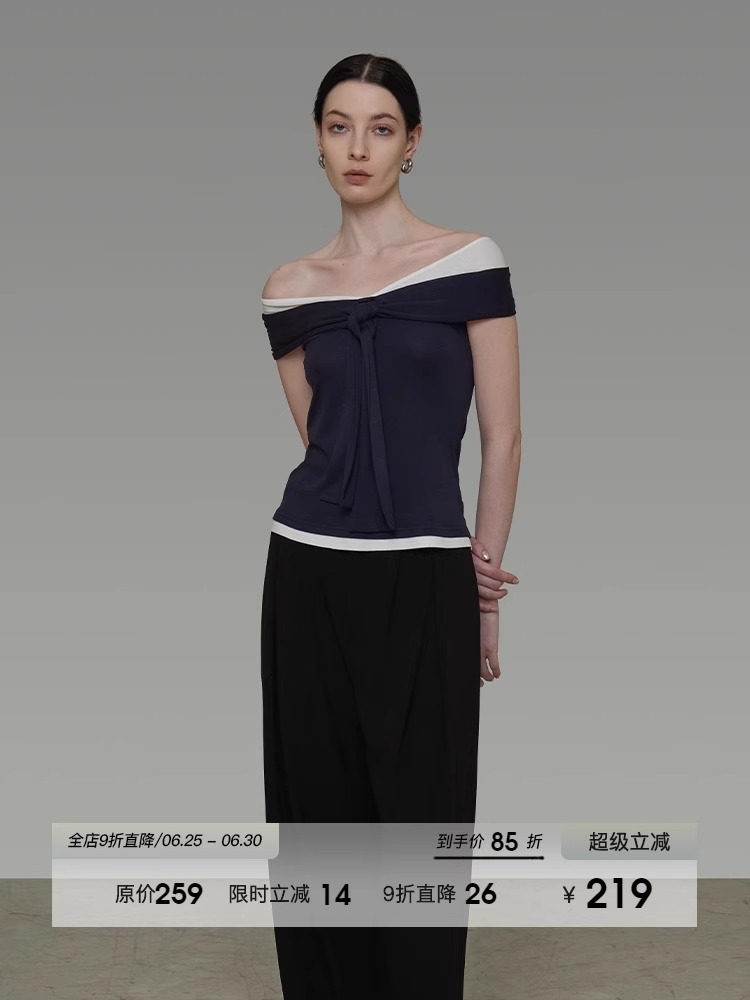 非实拍.撞色一字肩T恤女夏季20025新款高级感修身气质露肩上衣