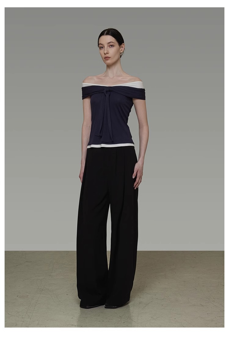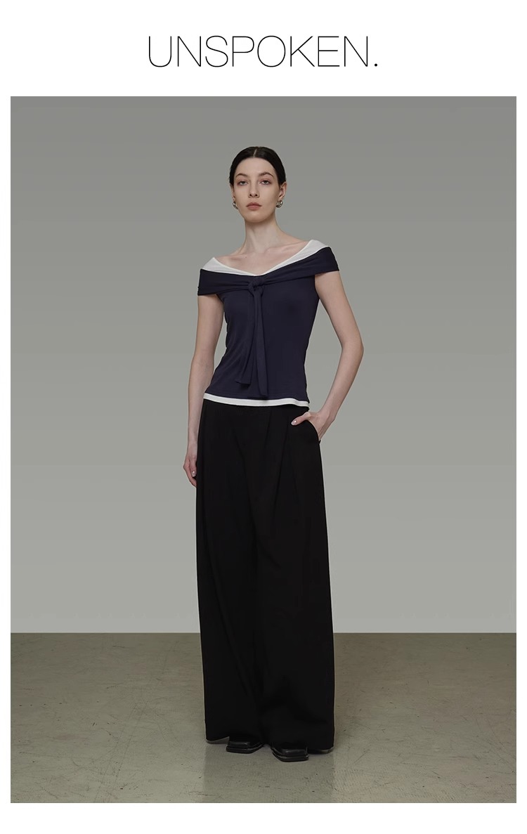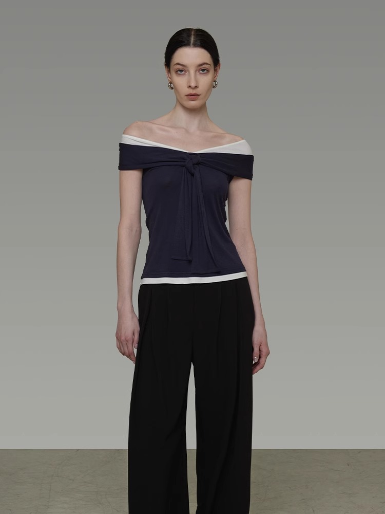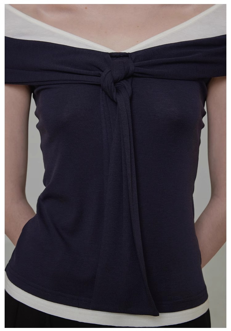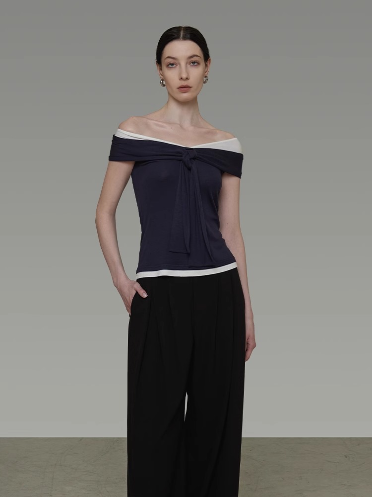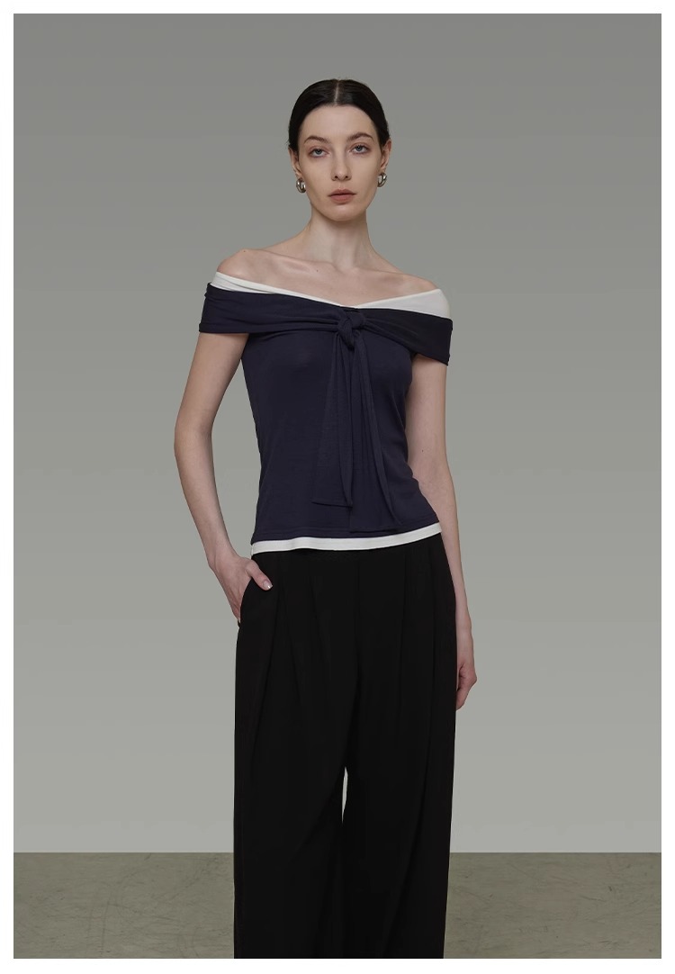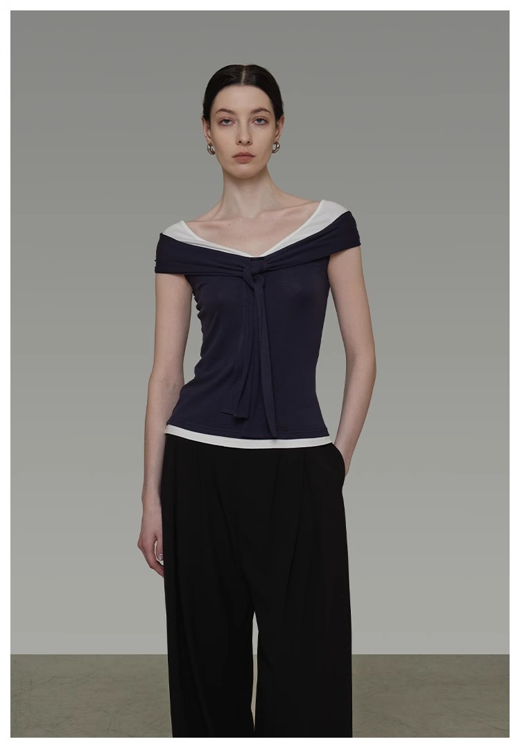 非实拍.撞色一字肩T恤女夏季20025新款高级感修身气质露肩上衣