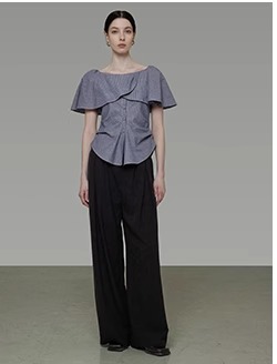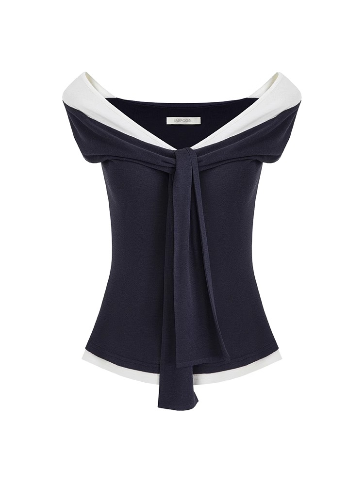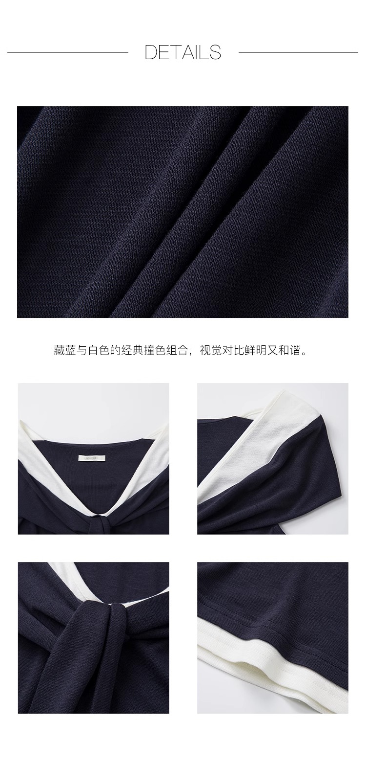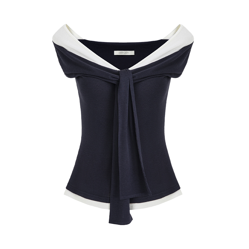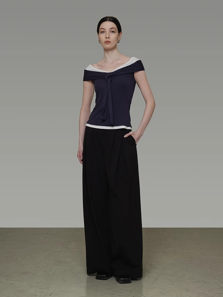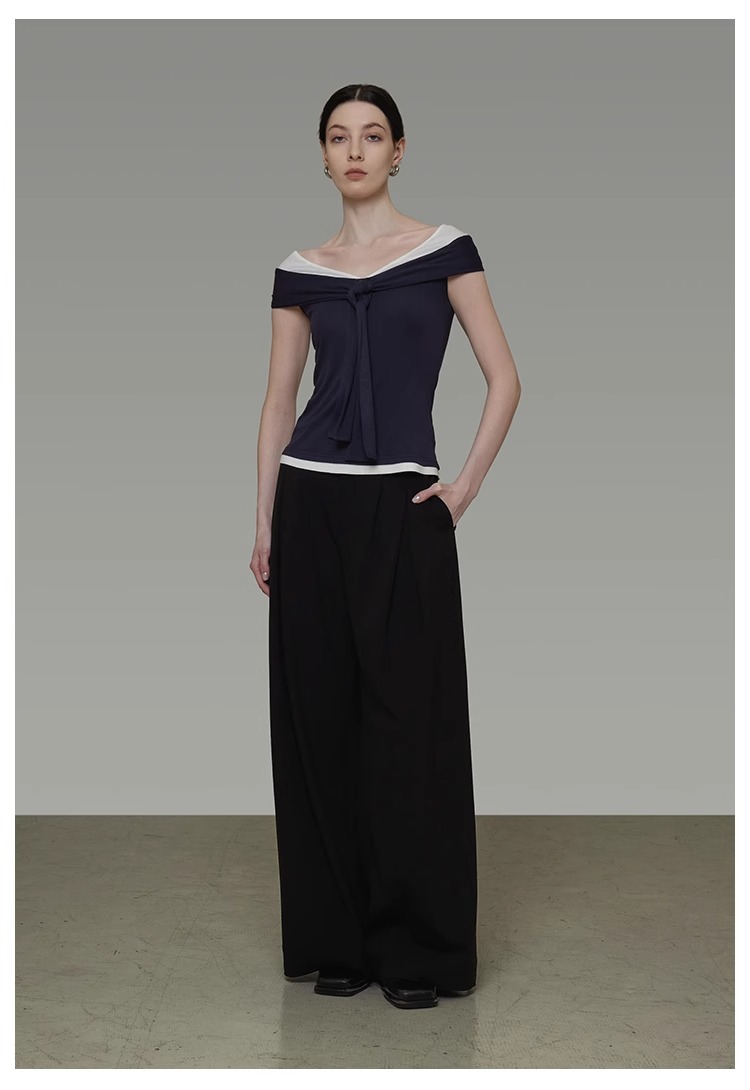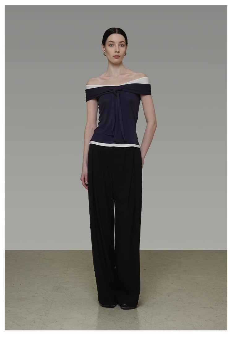 非实拍.撞色一字肩T恤女夏季20025新款高级感修身气质露肩上衣