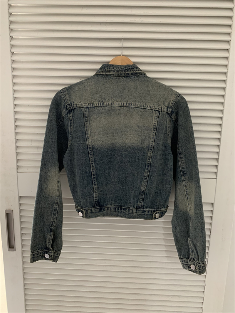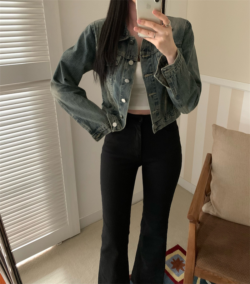 재고 있음 고급 워시드 컬러 + 숄더 패드 루즈 숏 데님 재킷
