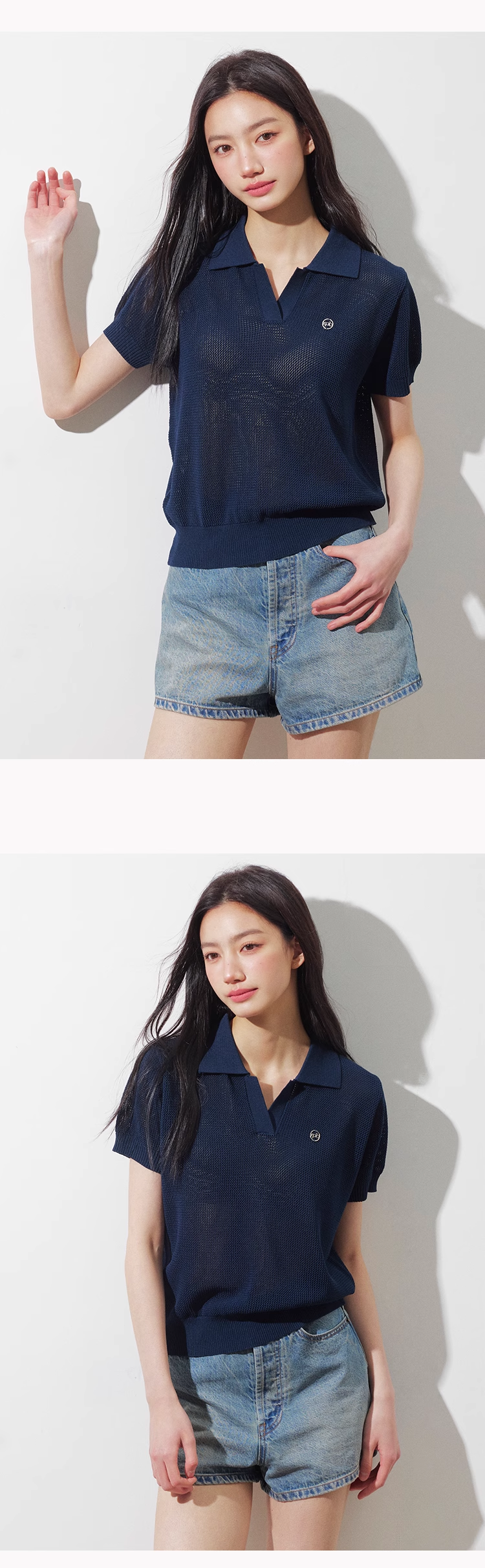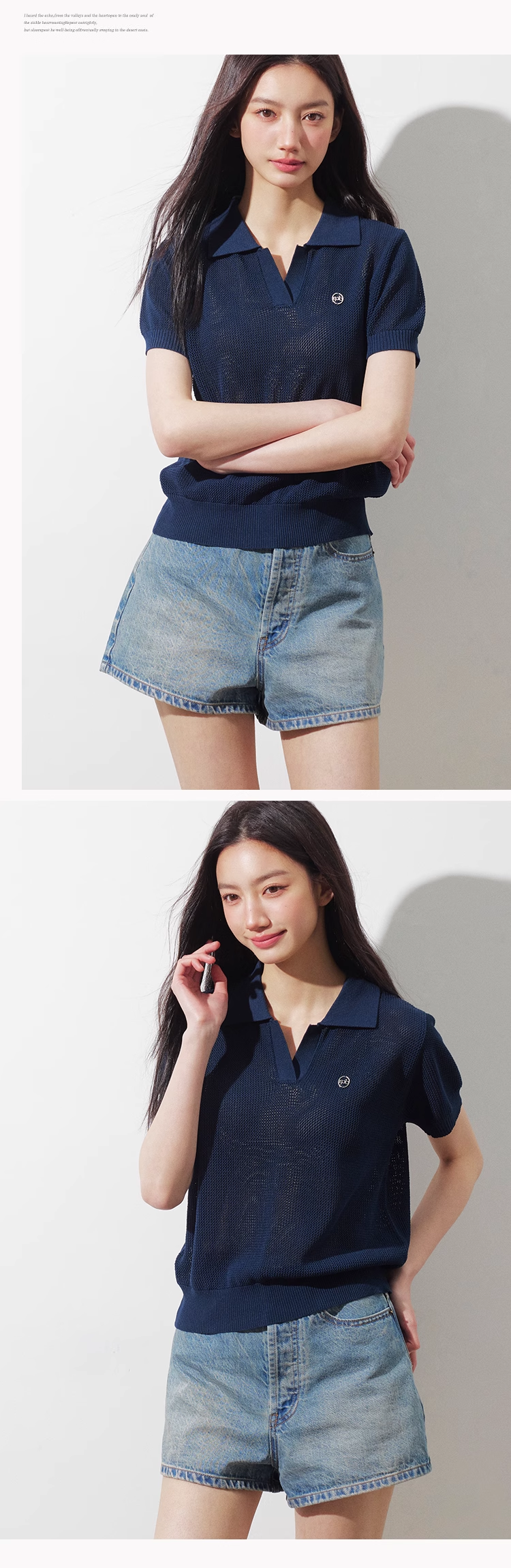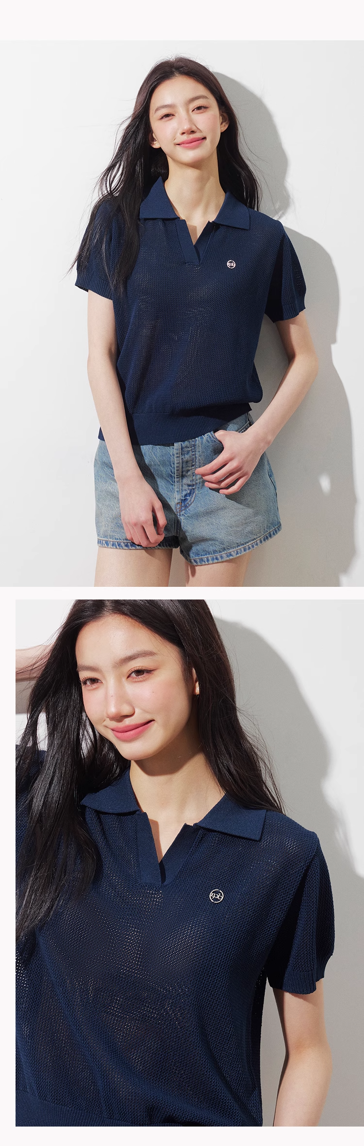 RPB BRAND网眼透气显瘦纯色简约百搭翻领短袖针织衫女上衣打底衫