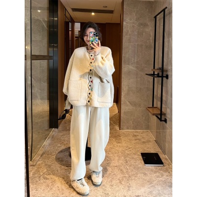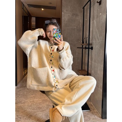 复古波浪边手工花朵针织开衫女韩国东大门复古宽松慵懒风羊毛毛衣