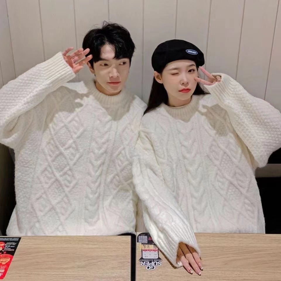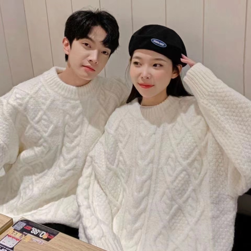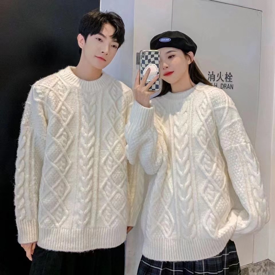 麻花毛衣男女秋冬软糯糯百搭奶白色圆领宽松套头慵懒风外穿针织衫