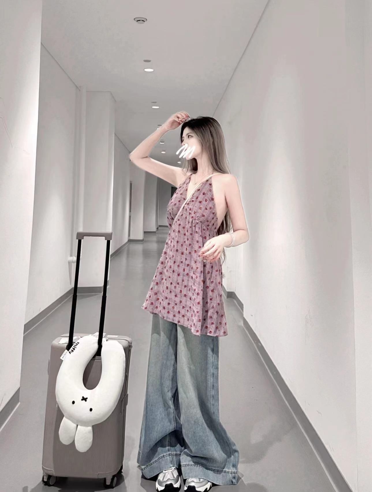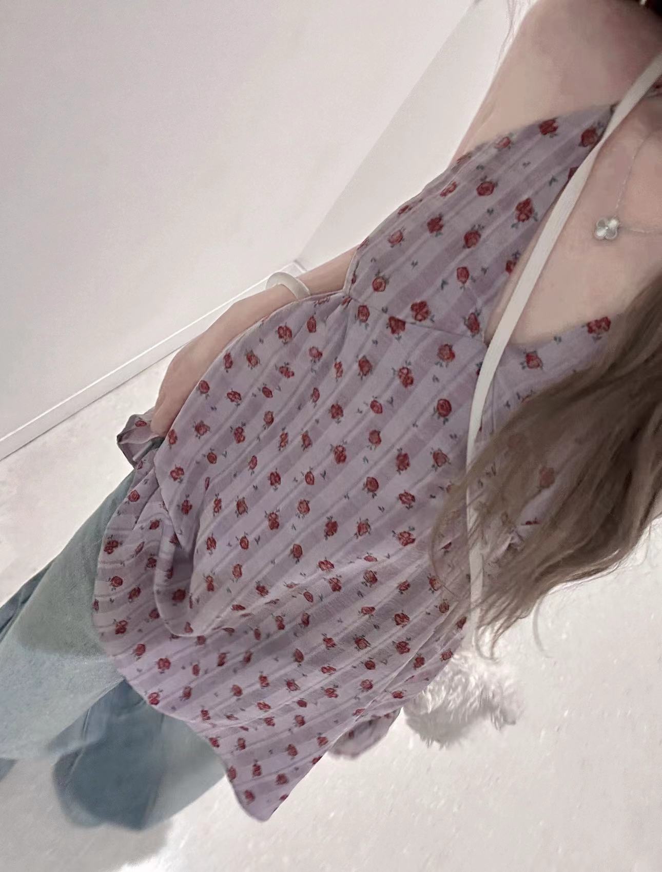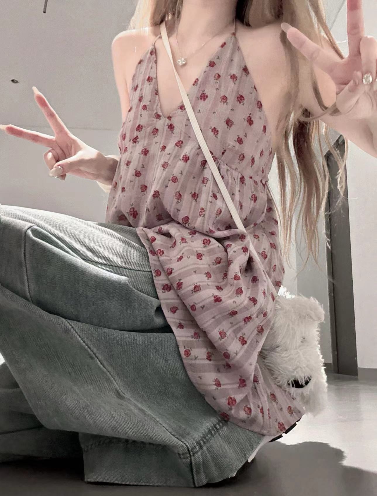 实拍实价 紫色碎花无袖背心上衣中长款连衣裙女