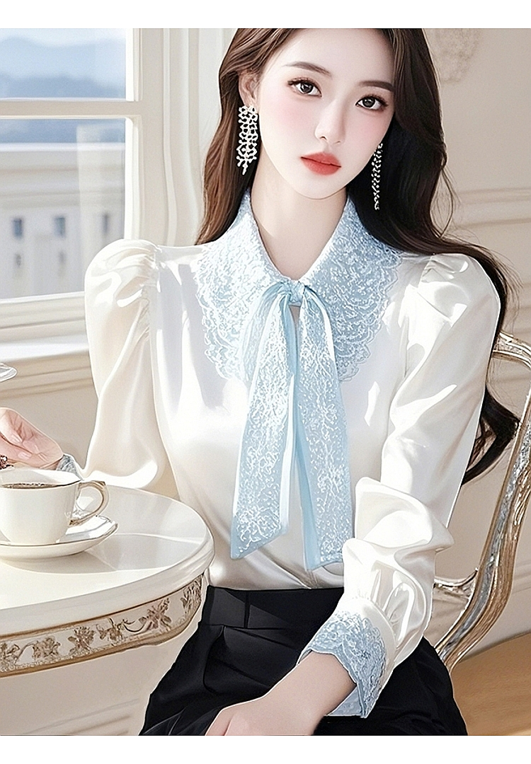 2025년 여성용 우아한 레이스 칼라 화이트 아세테이트 새틴 블라우스 - 봄에 어울리는 시크하고 고급스러운 탑