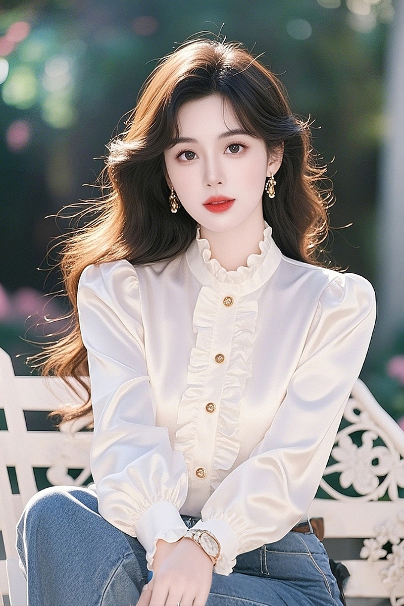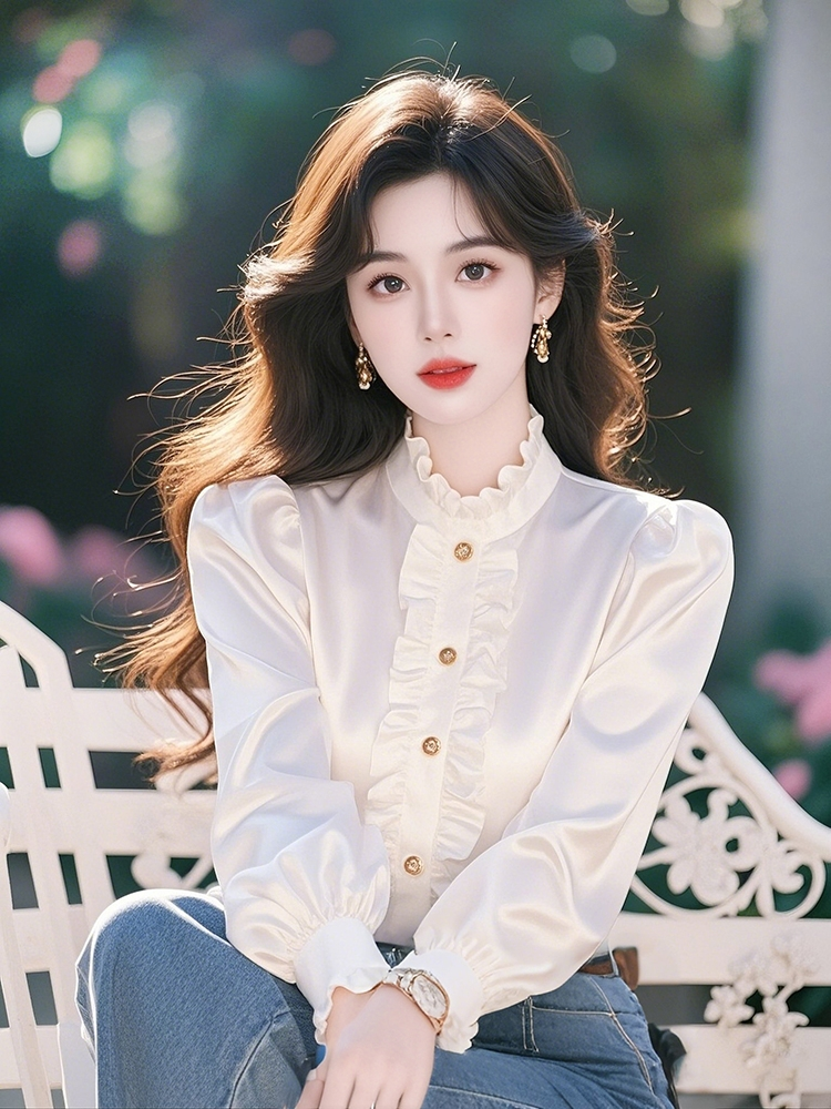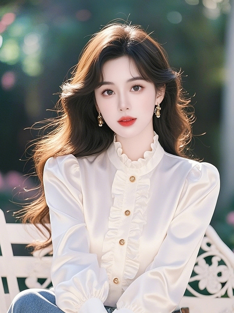 여성용 고급 화이트 새틴 블라우스, 러플 장식, 2025년 초봄 신상 스타일, 독특하고 개성 넘치는 탑.