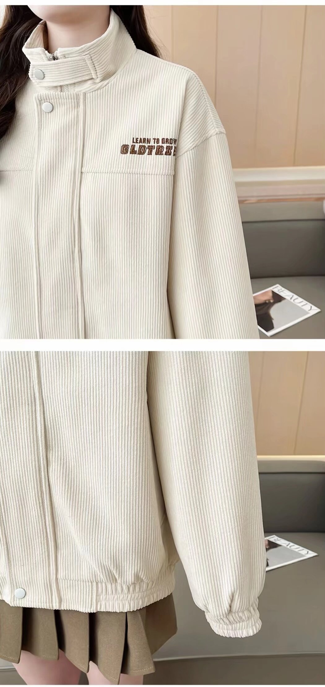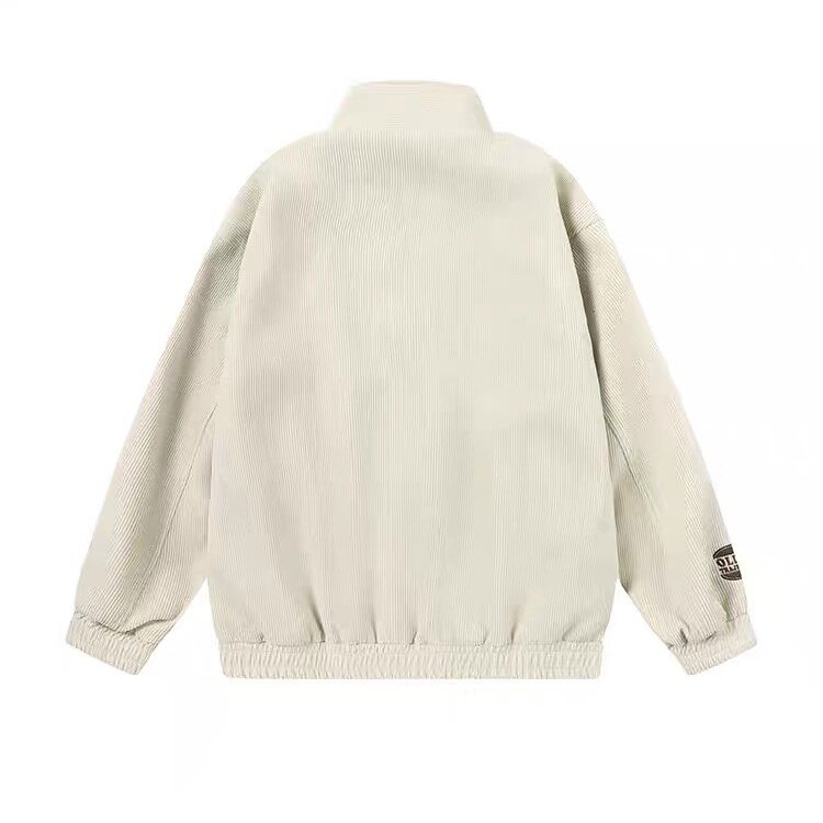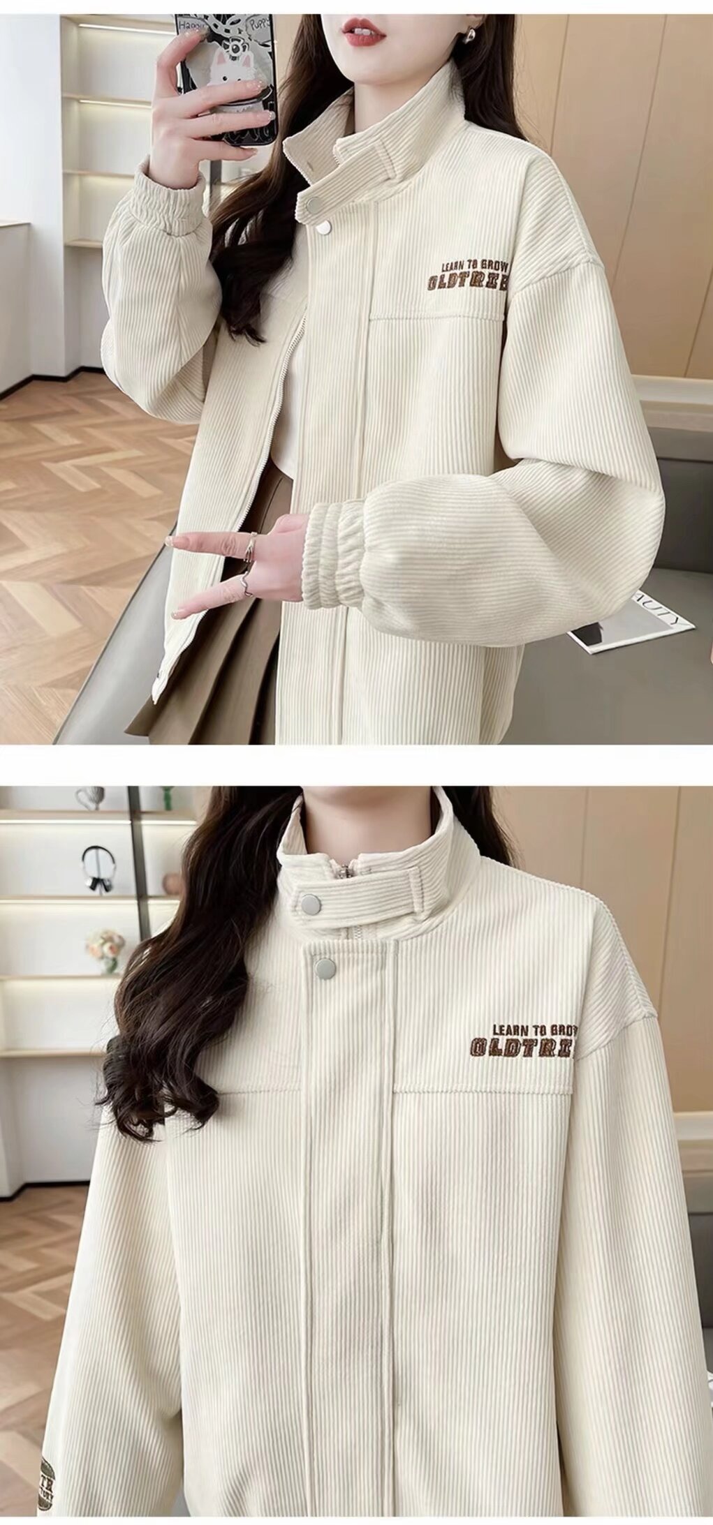 2025년 봄/가을 신상 살구색 스탠드 칼라 코듀로이 재킷 (남녀 공용, 루즈핏, 활용도 높은 캐주얼 스포츠 재킷)