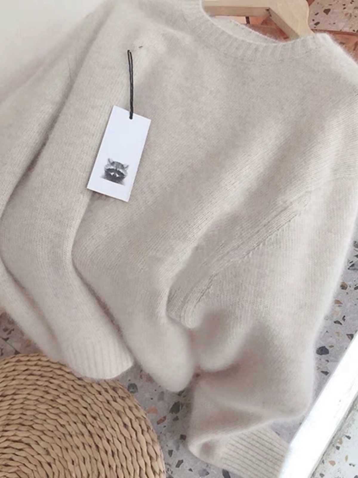 2025年秋冬韩国新款软糯棕色浣熊绒套头毛衣女圆领羊毛针织衫上衣