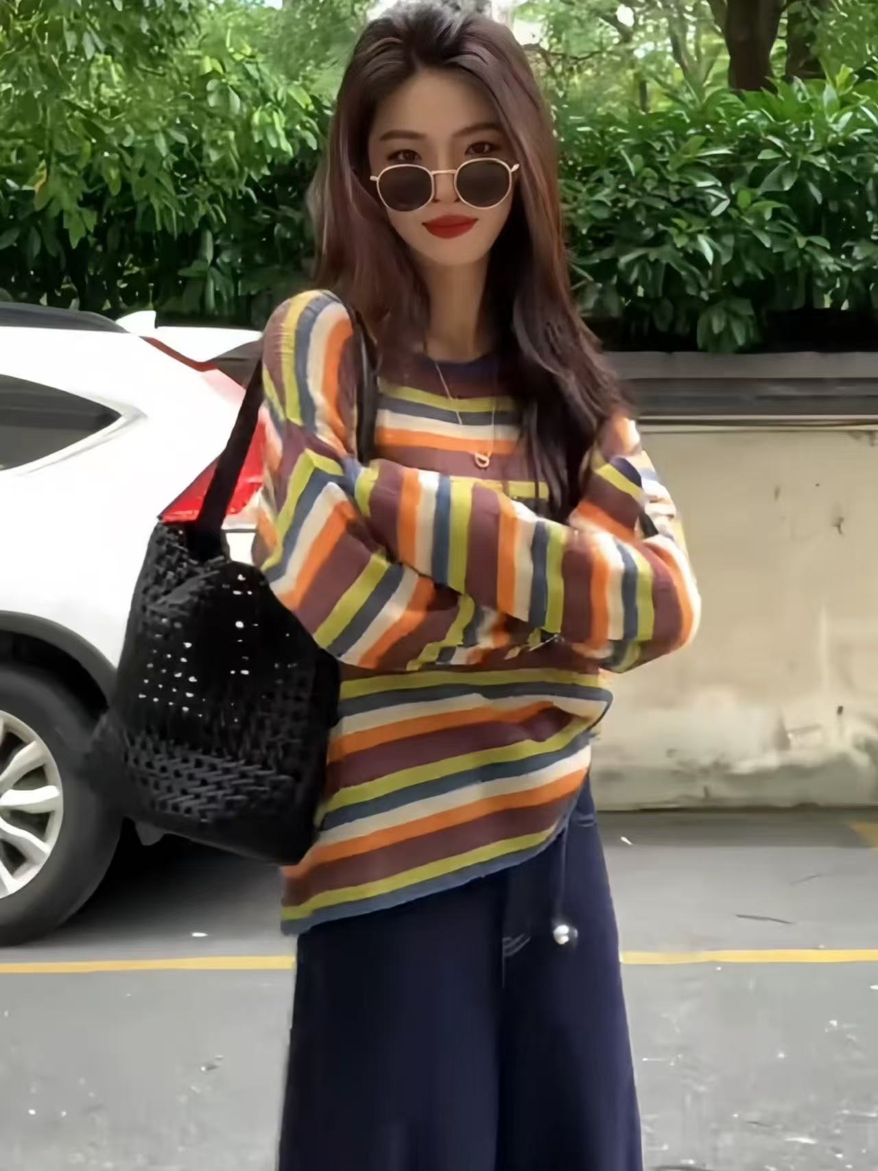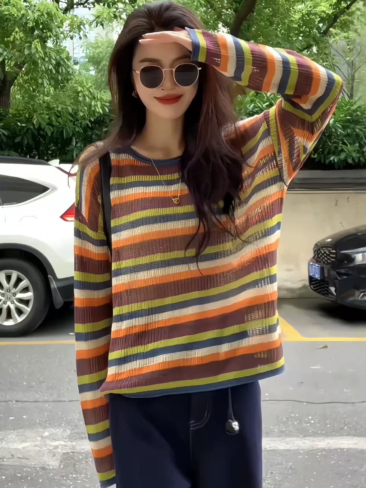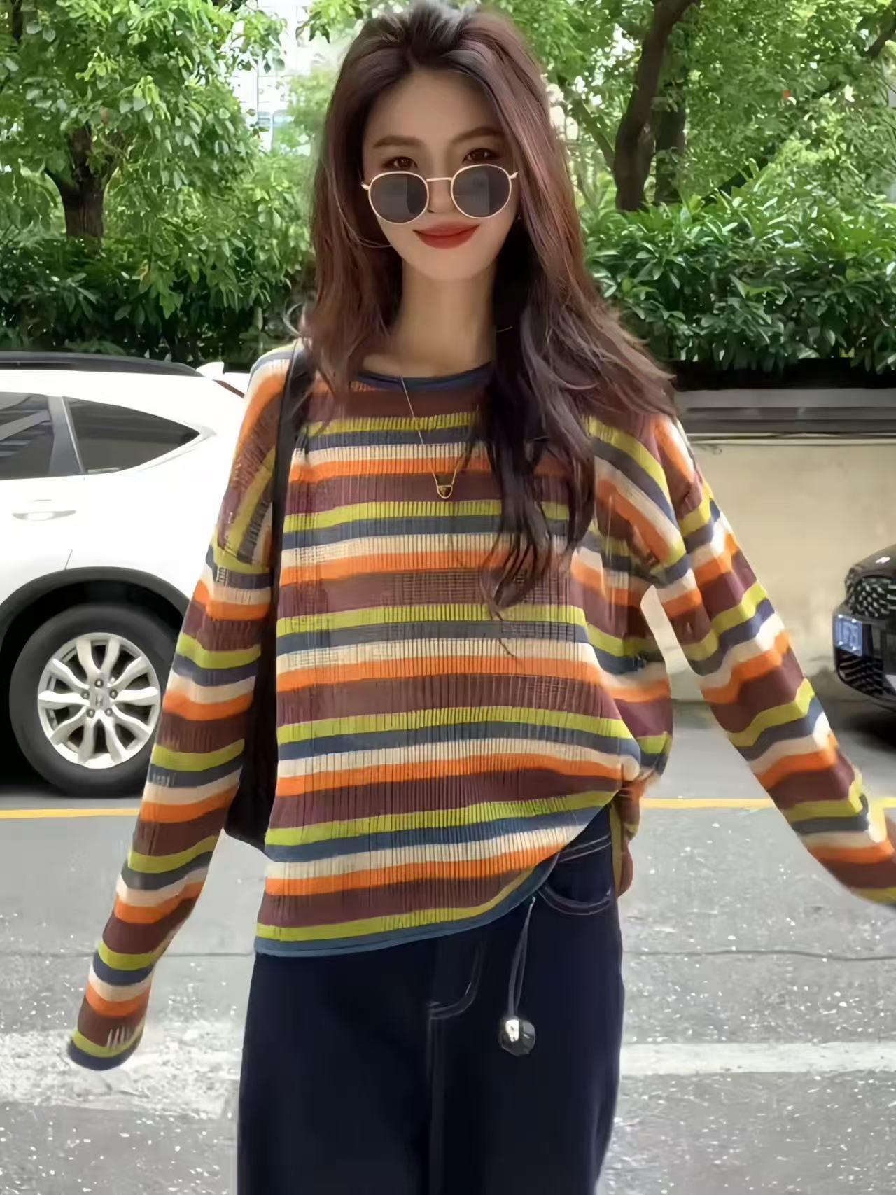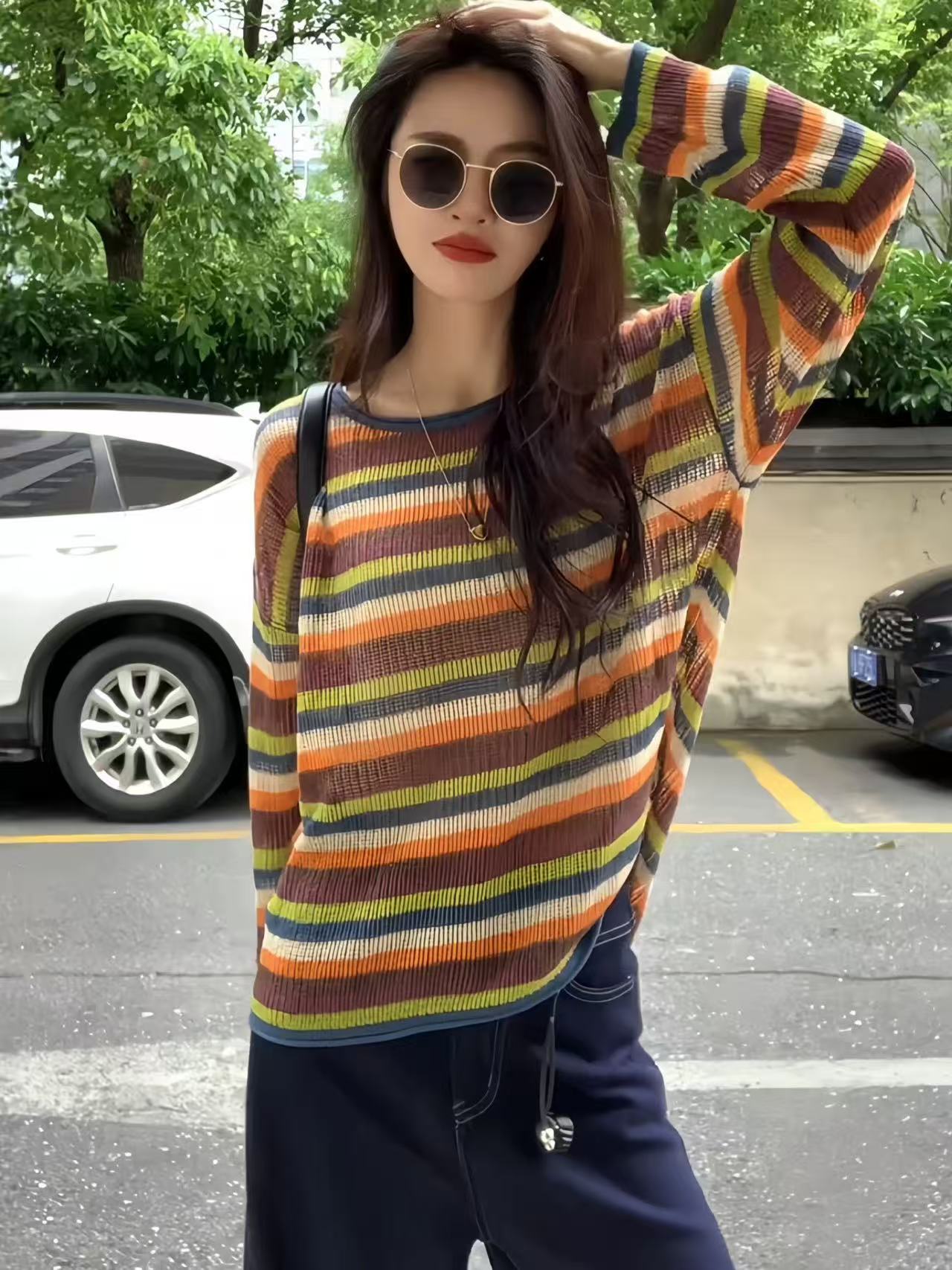 2025년 신상 여성용 초가을 무지개 줄무늬 긴팔 니트 스웨터, 편안한 핏, 루즈한 풀오버 스타일, 자외선 차단 기능
