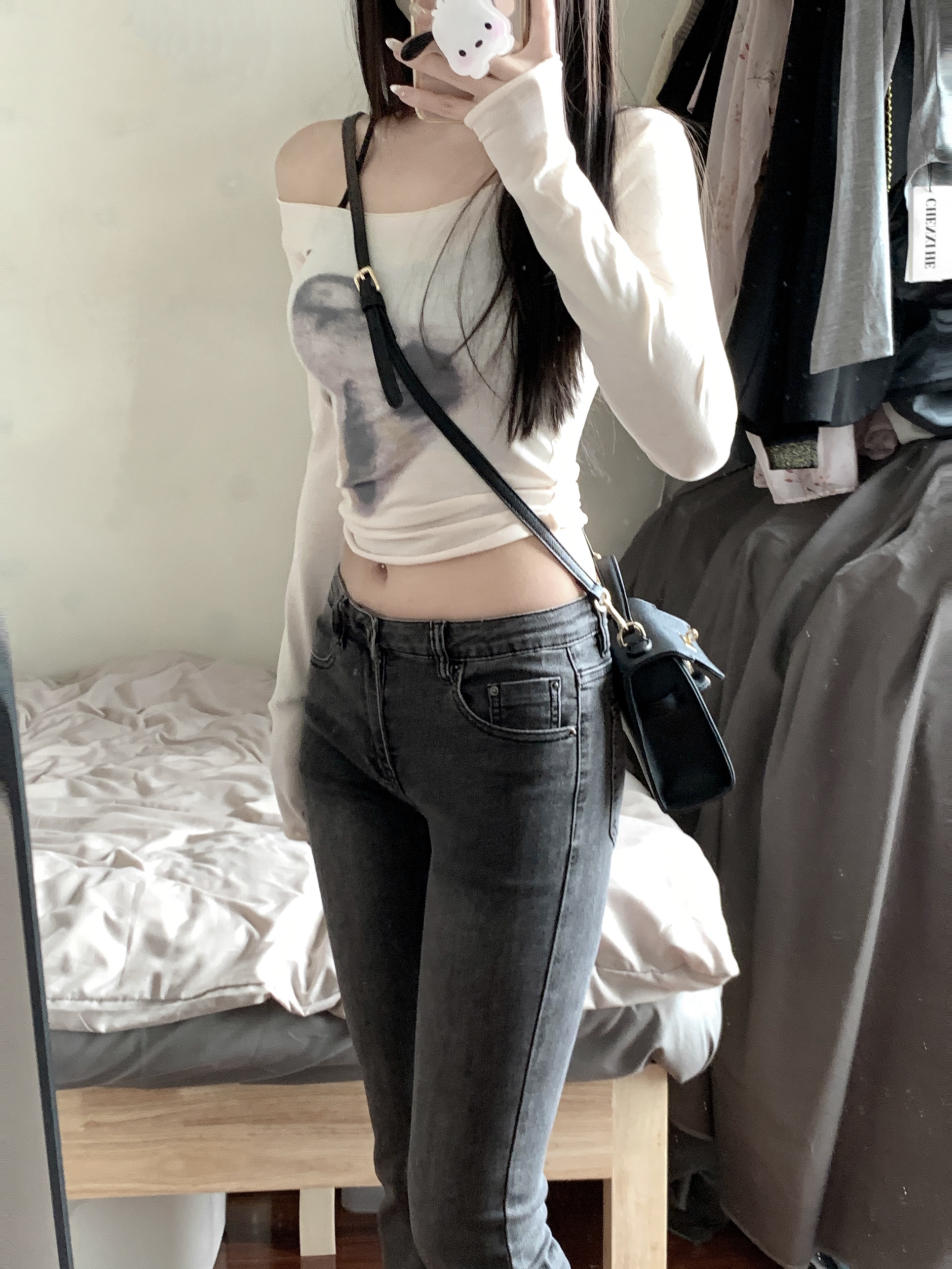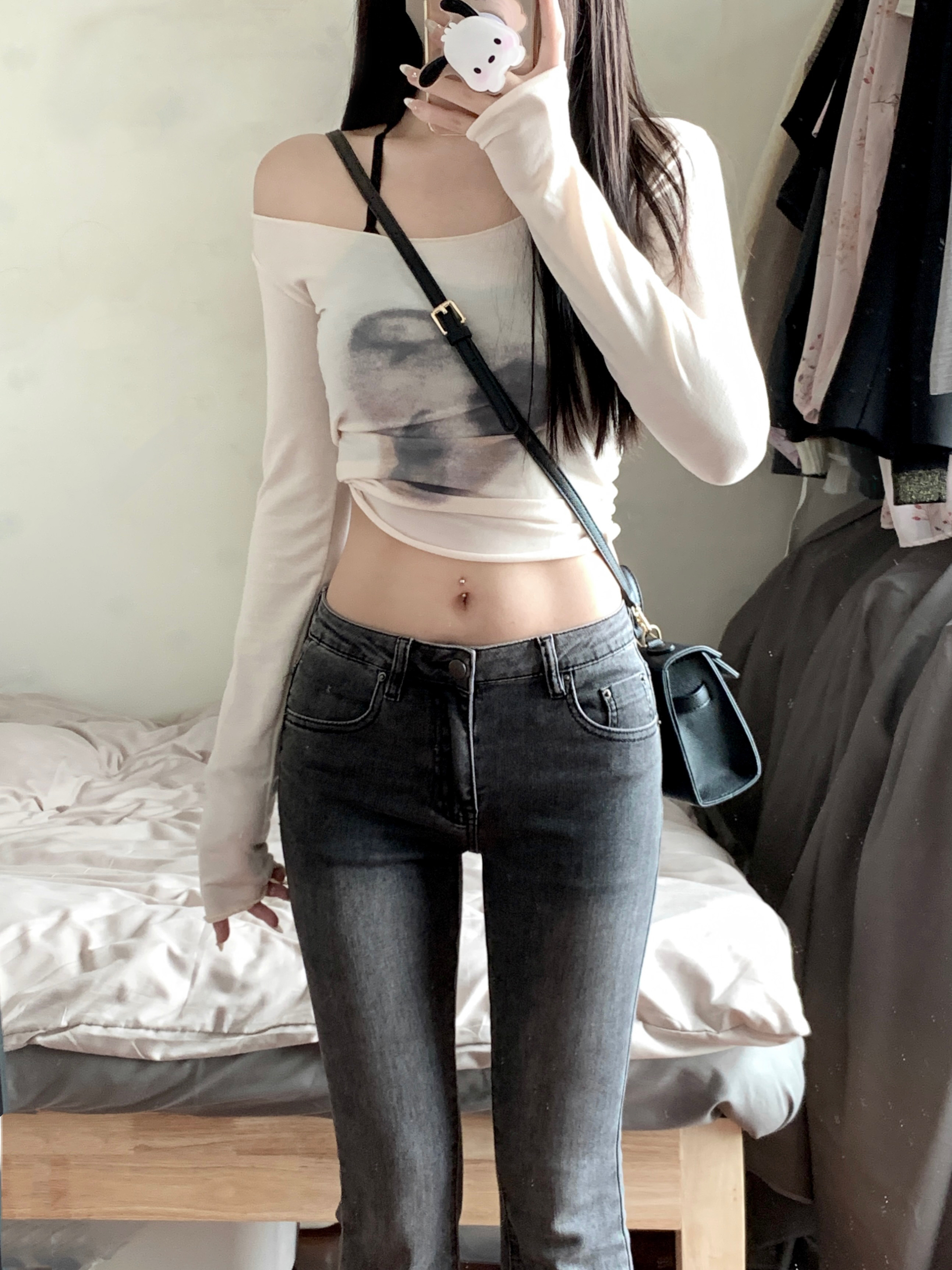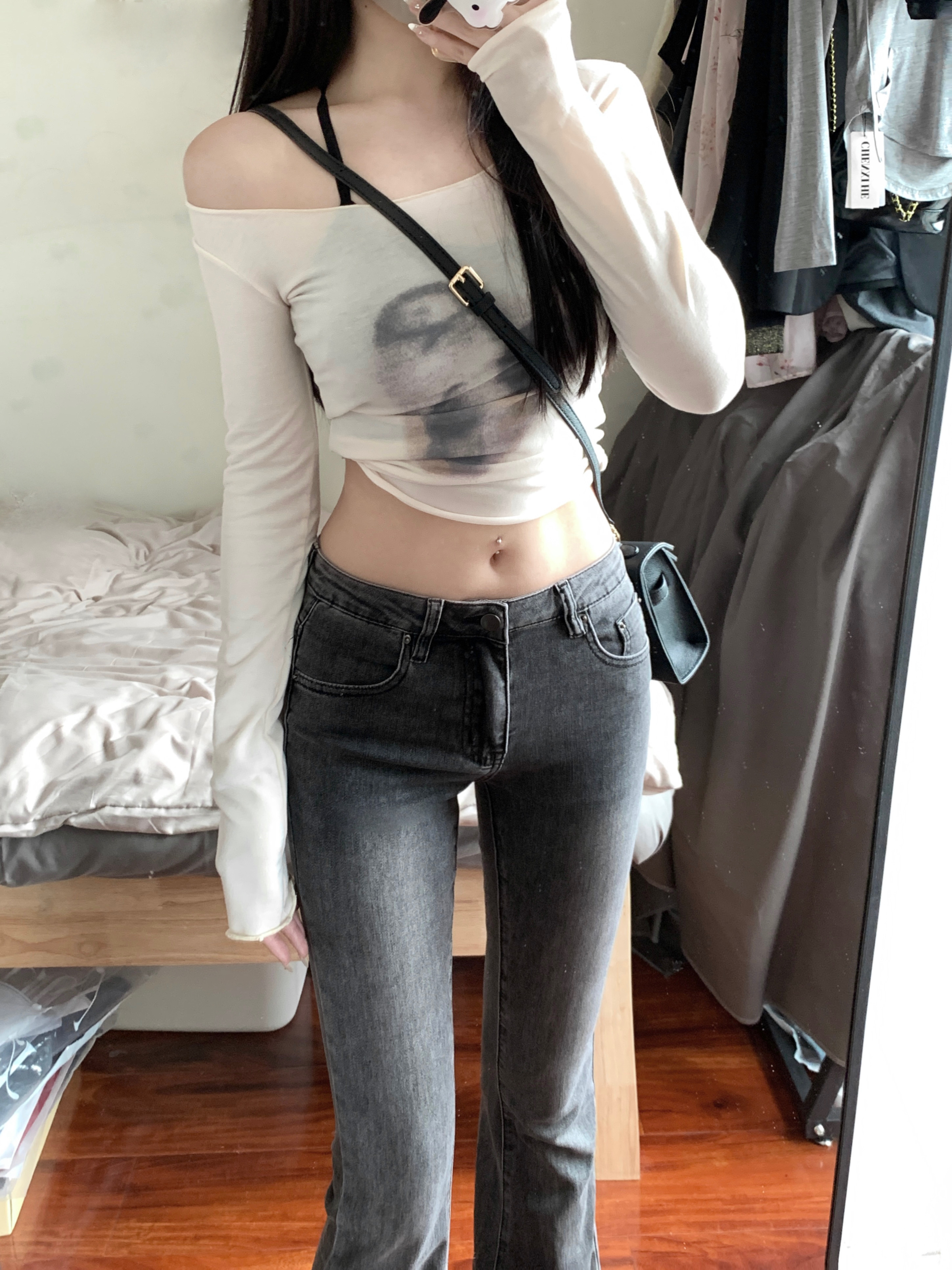 实拍实价 早秋薄款个性扎染大领口修身长袖修身显瘦上衣女