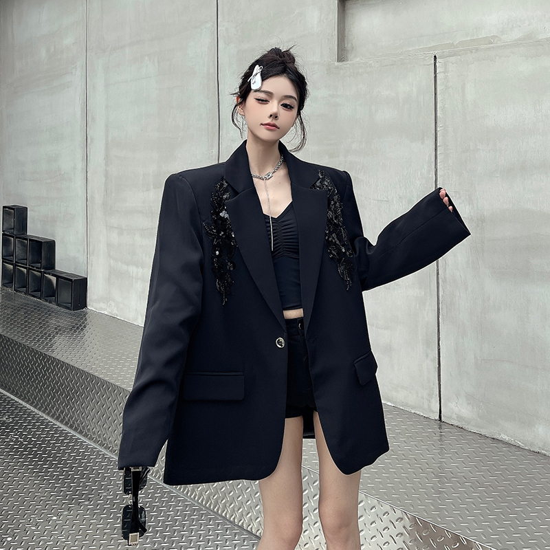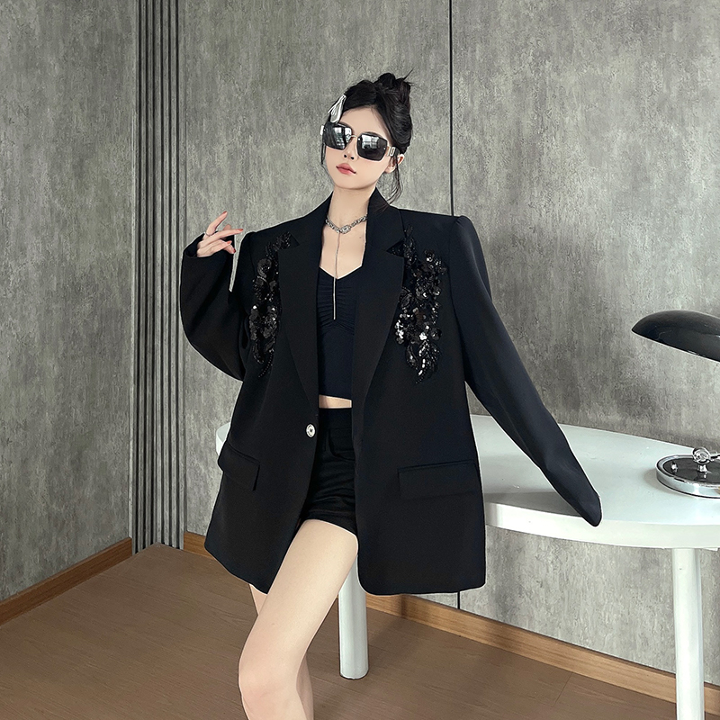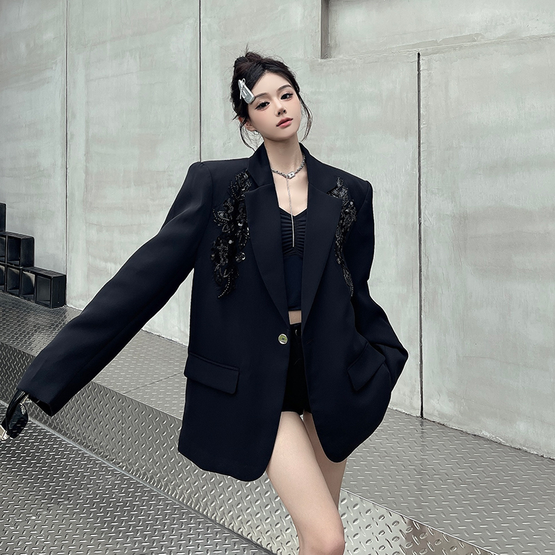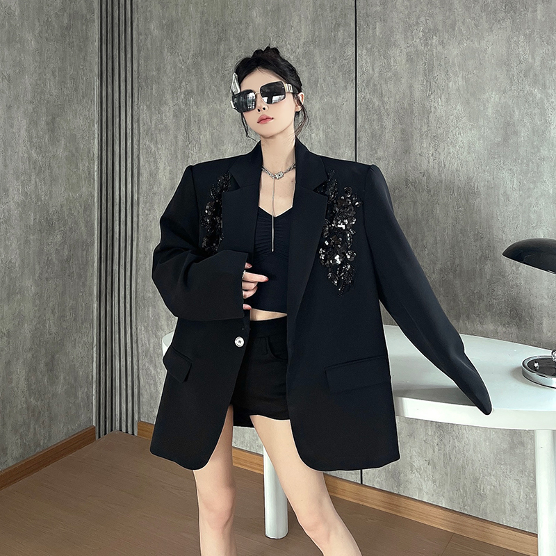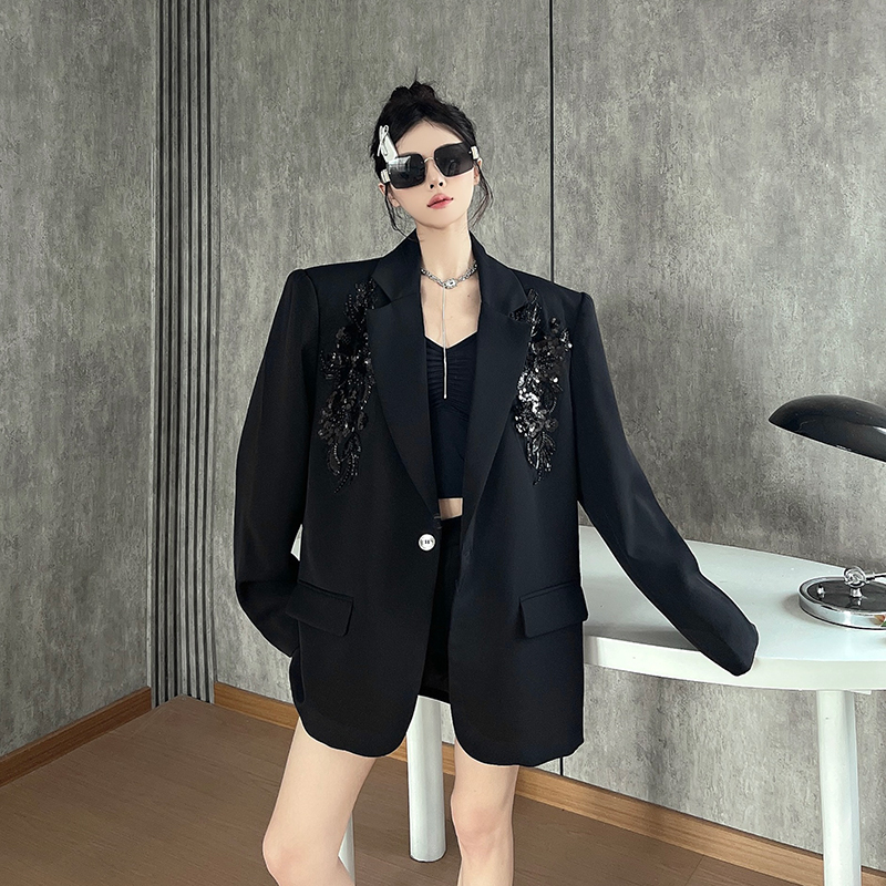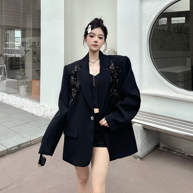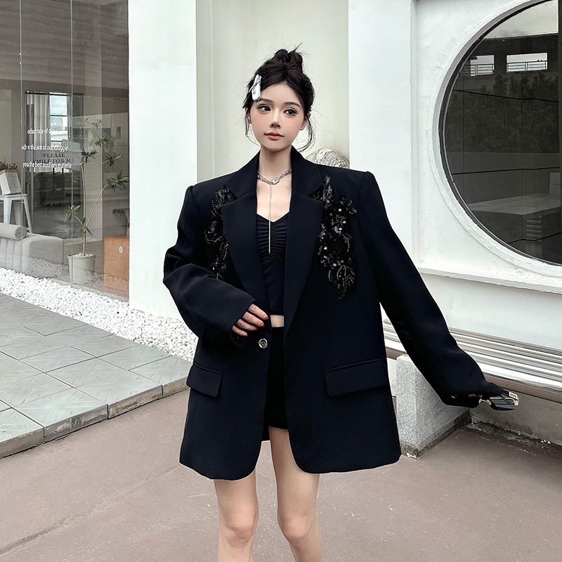 实拍实价黑色小众亮片立体绣花西装外套女高级感轻奢高定西服上衣