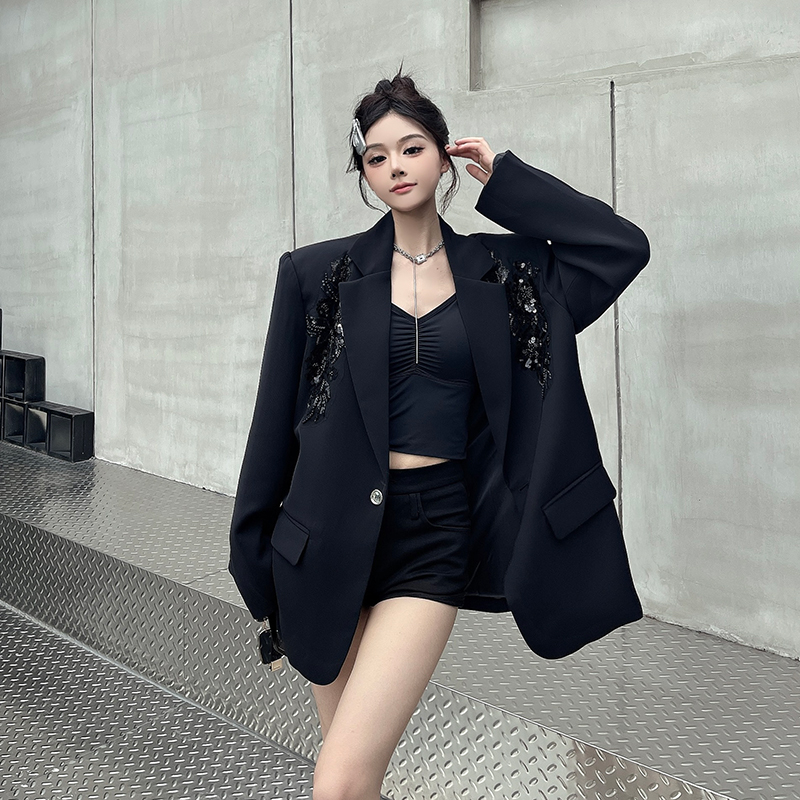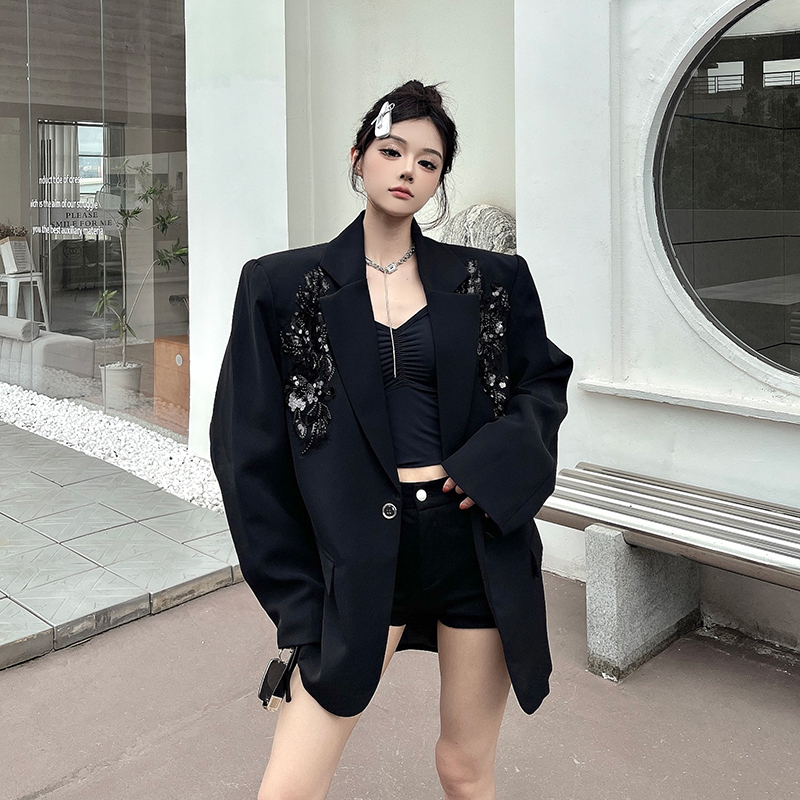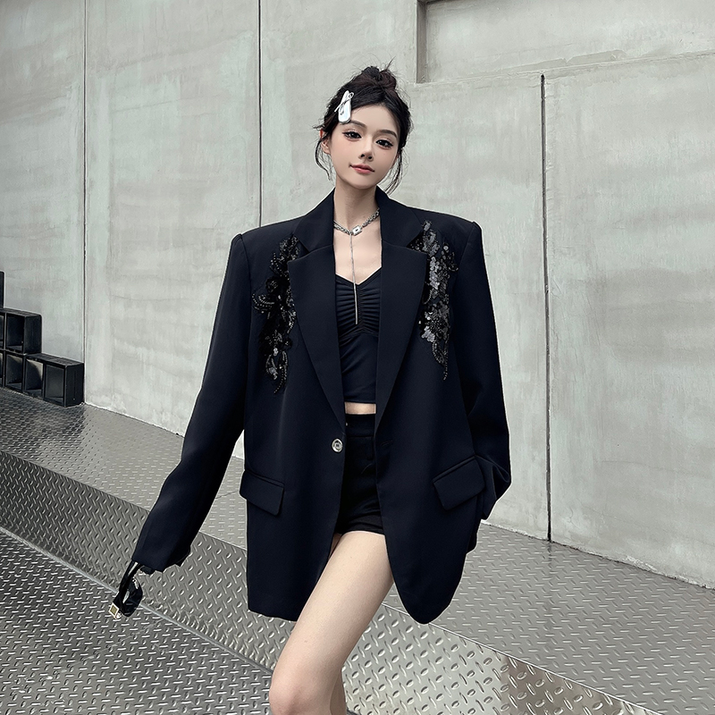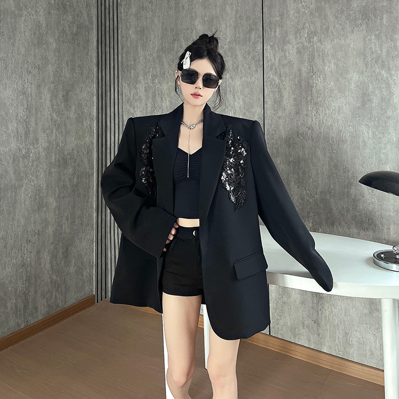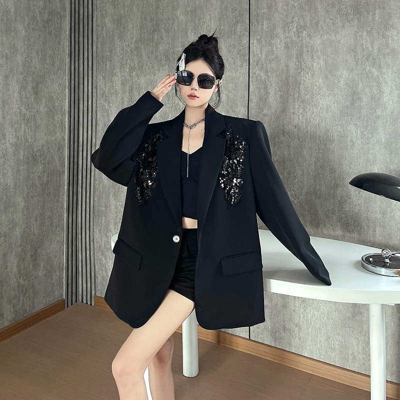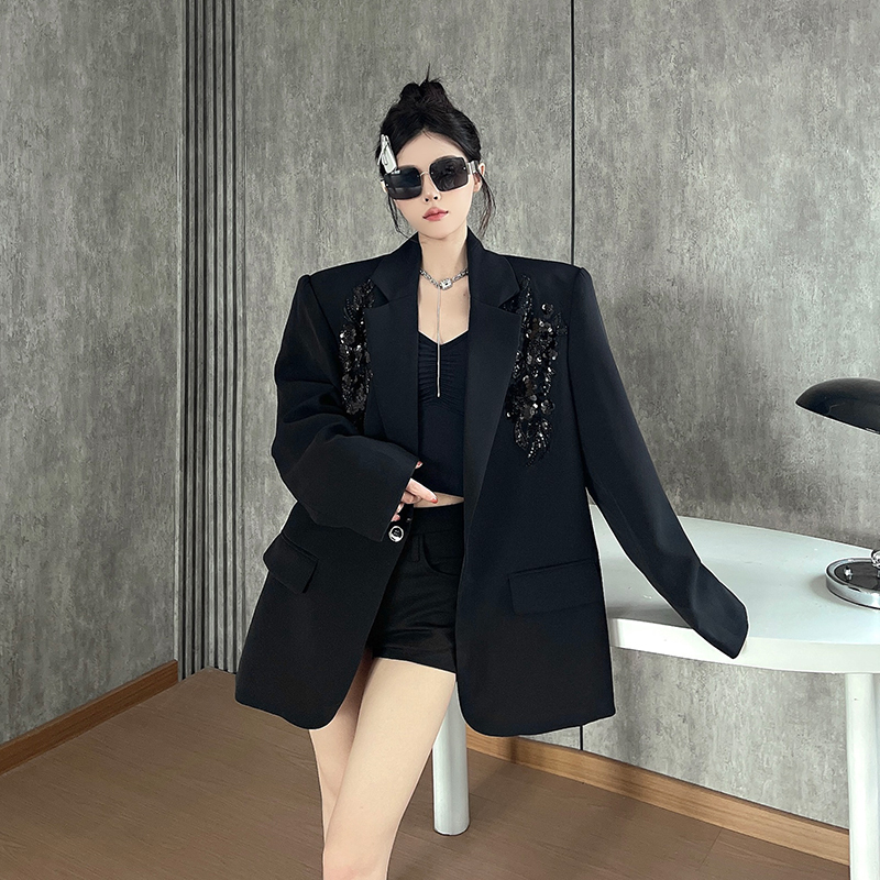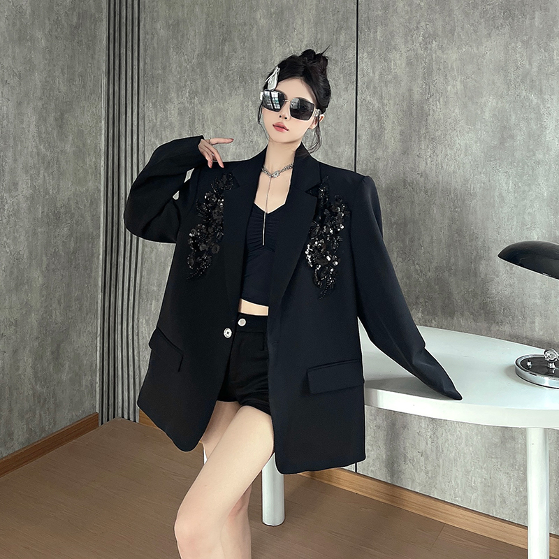 实拍实价黑色小众亮片立体绣花西装外套女高级感轻奢高定西服上衣