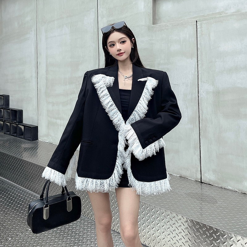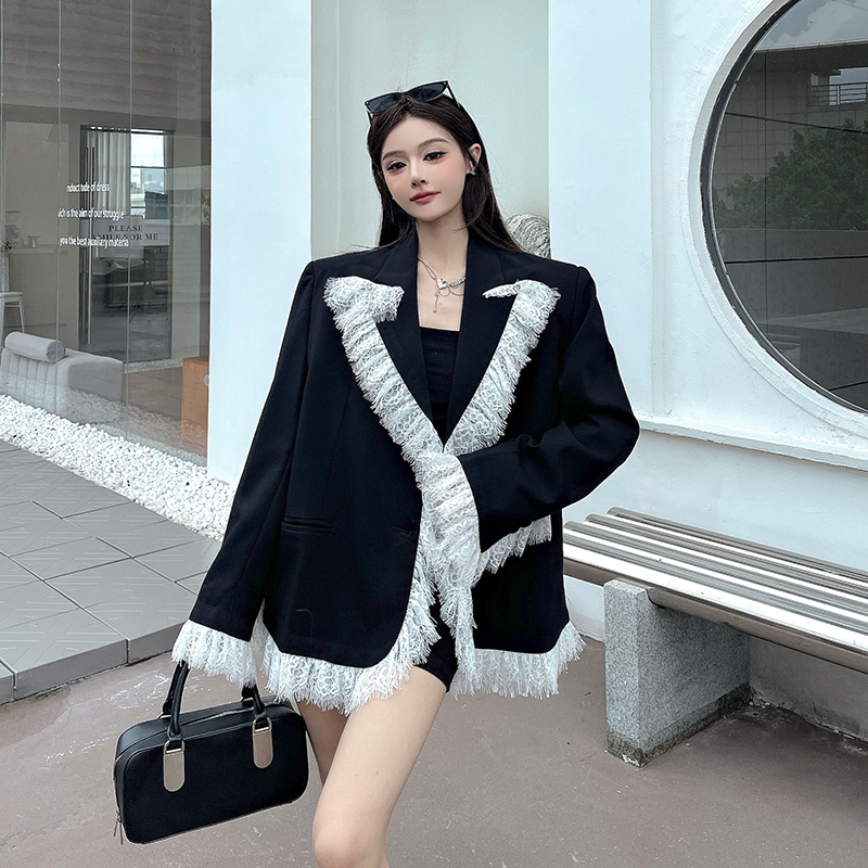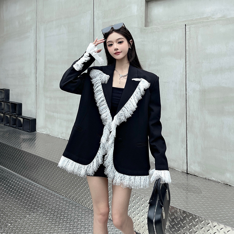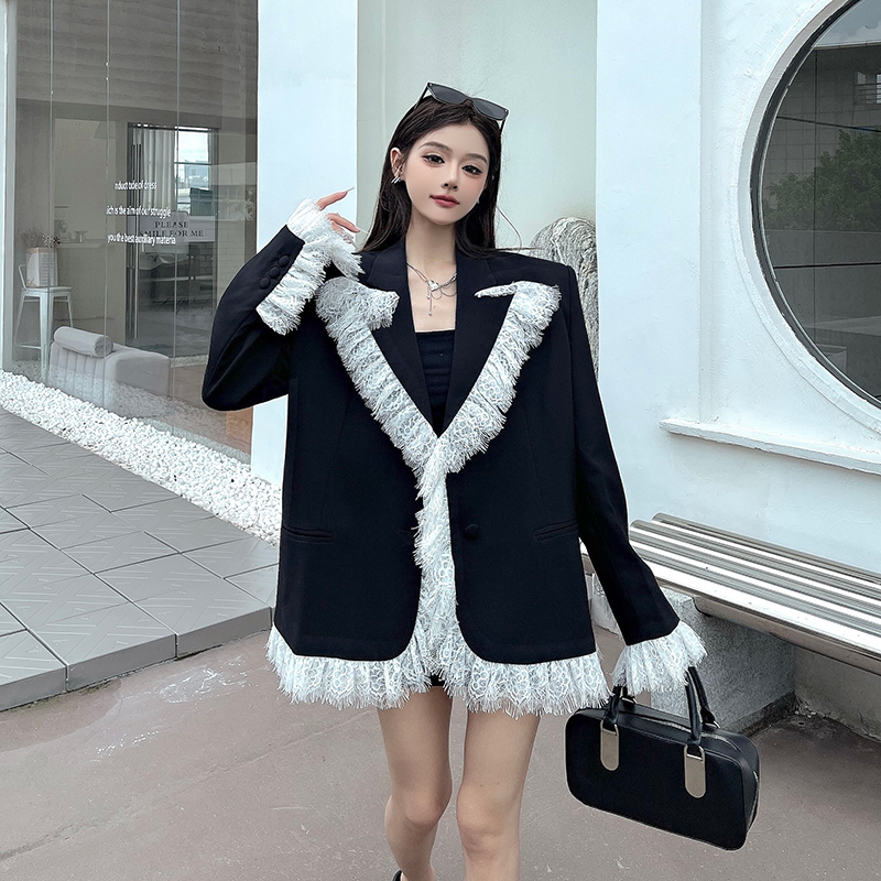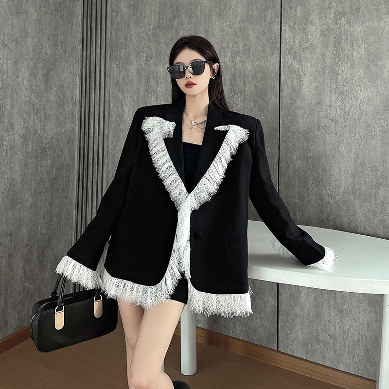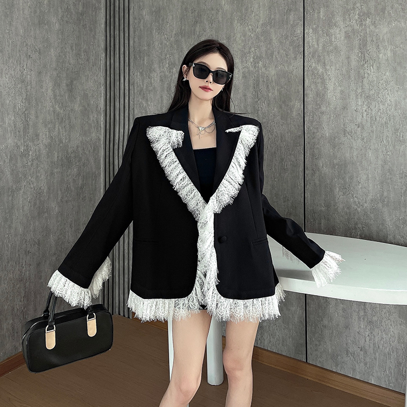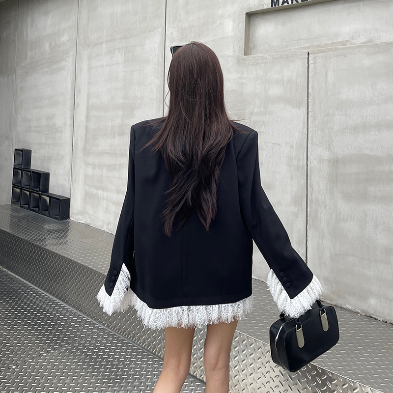实拍实价白色蕾丝边拼接黑色西装外套女春秋新款宽松显瘦垫肩西服