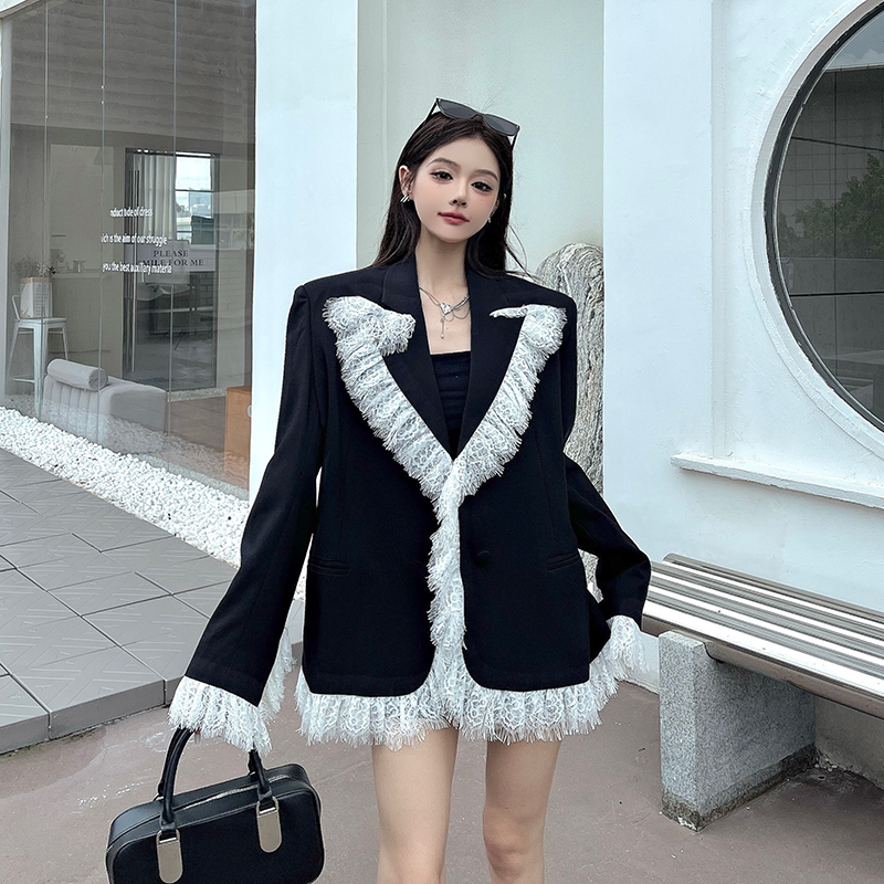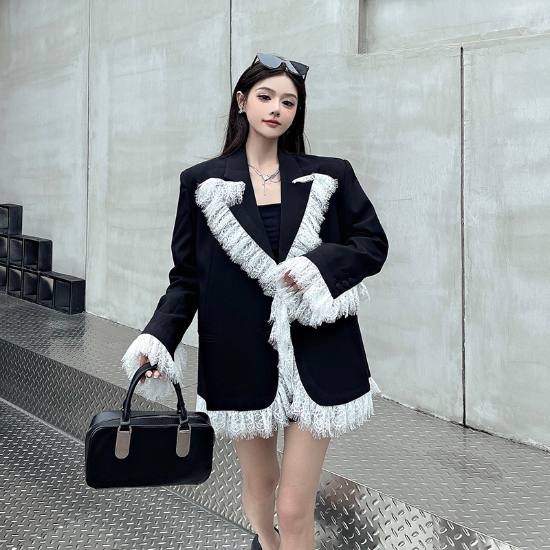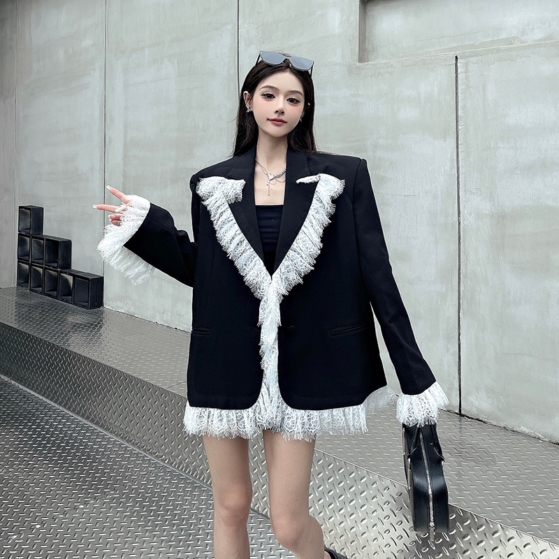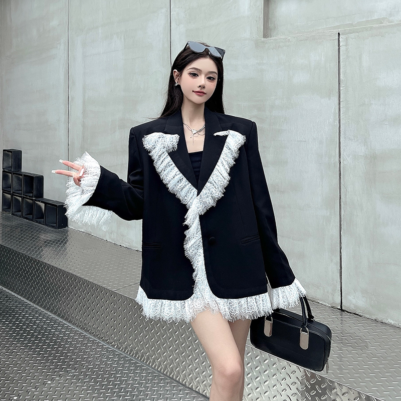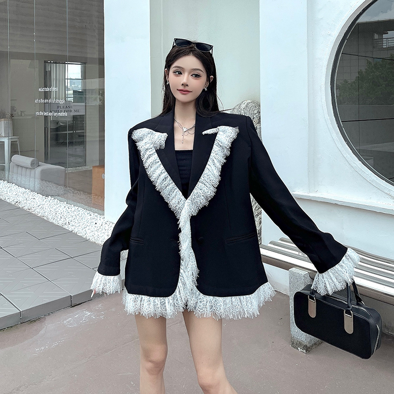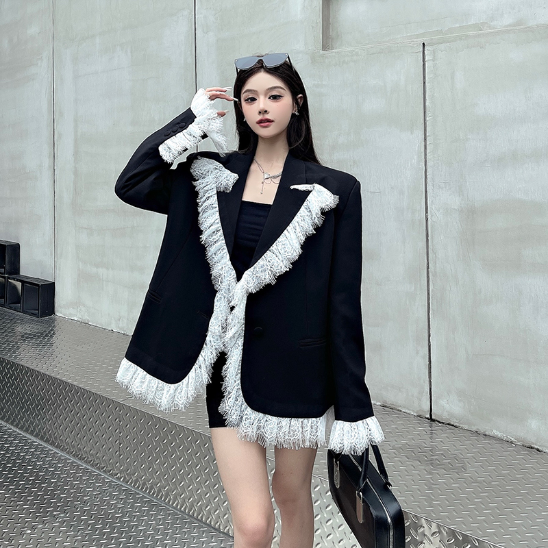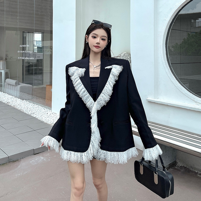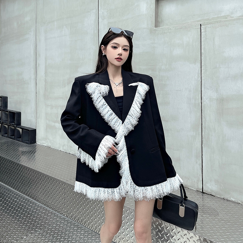 实拍实价白色蕾丝边拼接黑色西装外套女春秋新款宽松显瘦垫肩西服