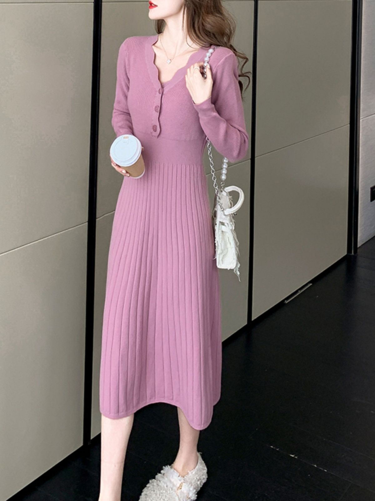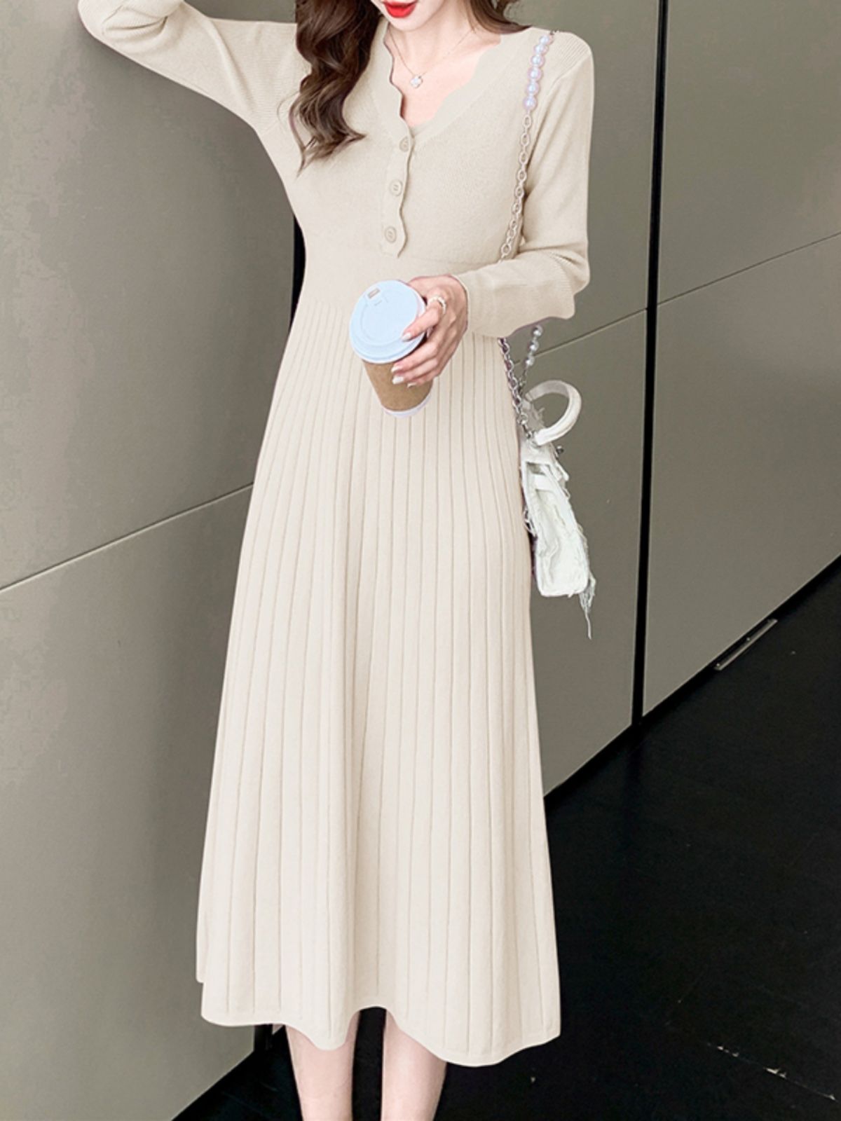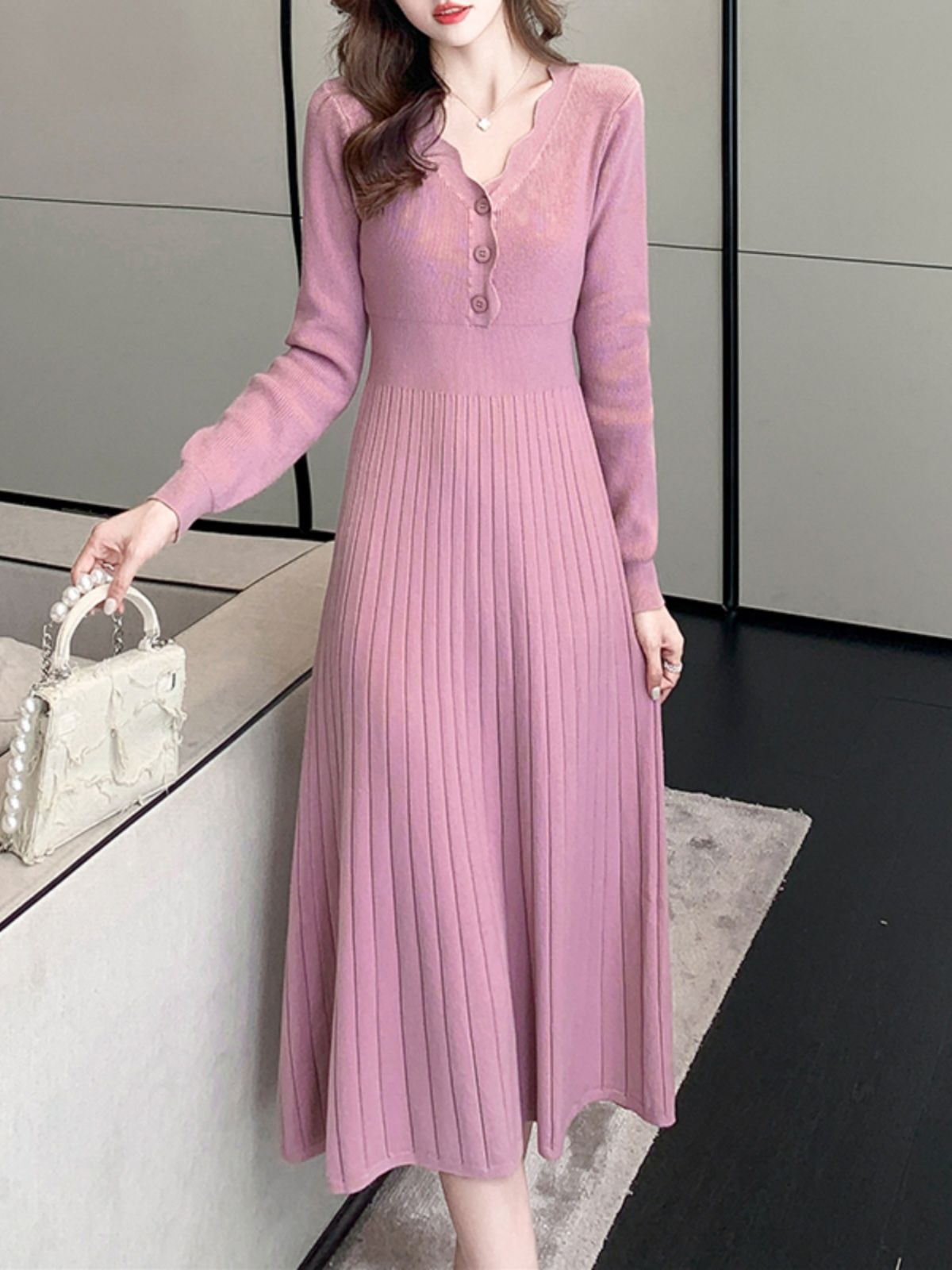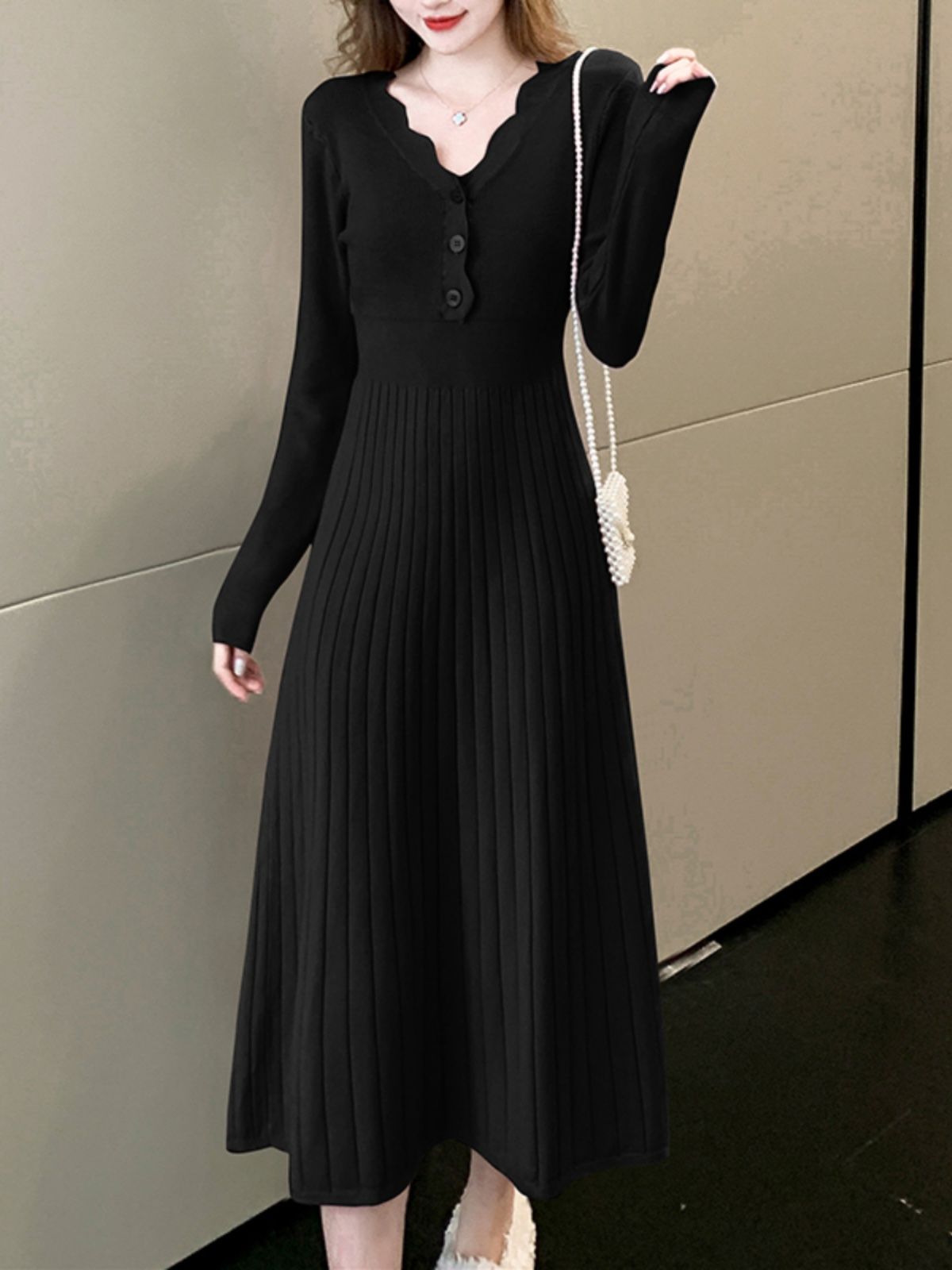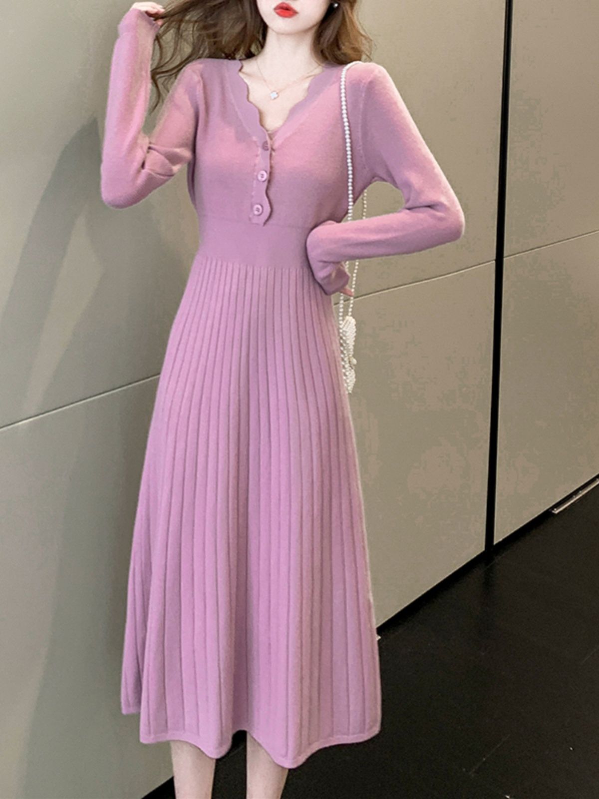 2025년 가을 신상품 레이스 V넥 솔리드 컬러 니트 드레스 (여성용), 우아하고 날씬해 보이는 중간 길이의 베이스 드레스