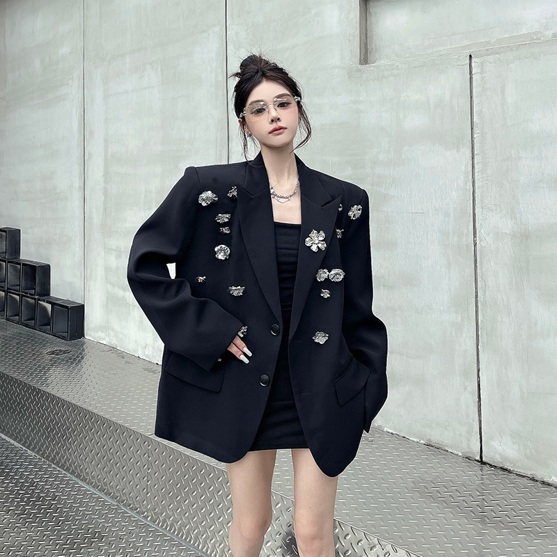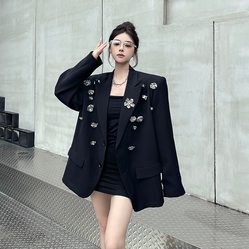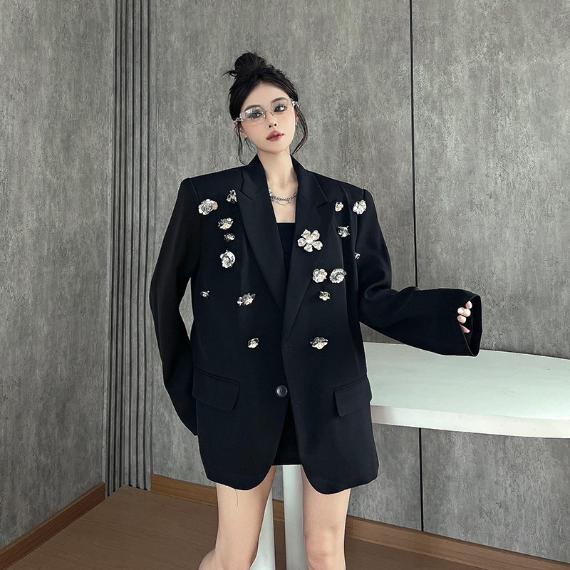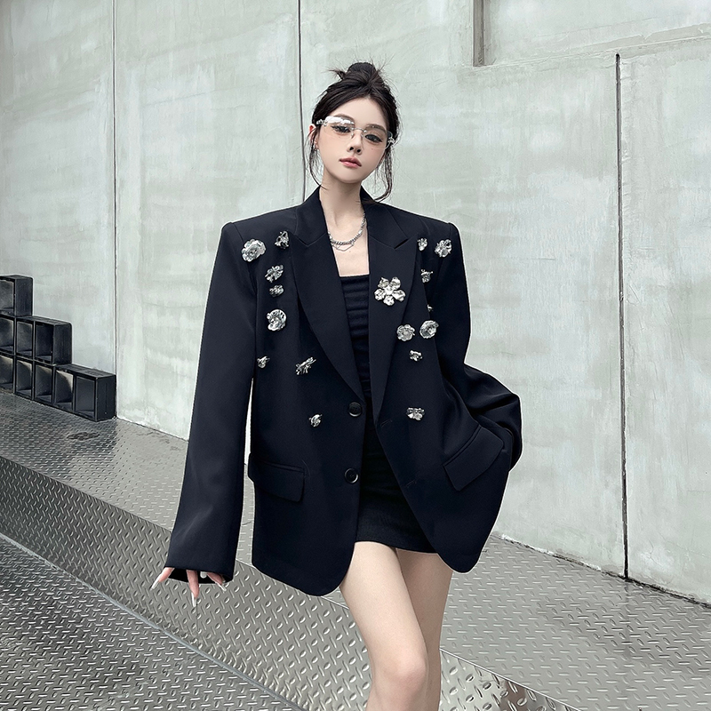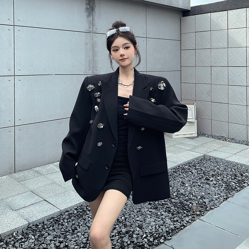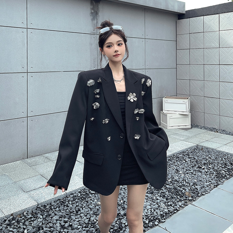 实拍实价 小众玫瑰花朵设计黑色西装外套女春秋新款宽松百搭西服