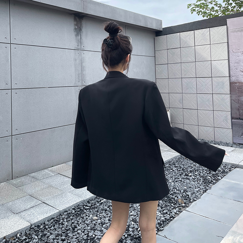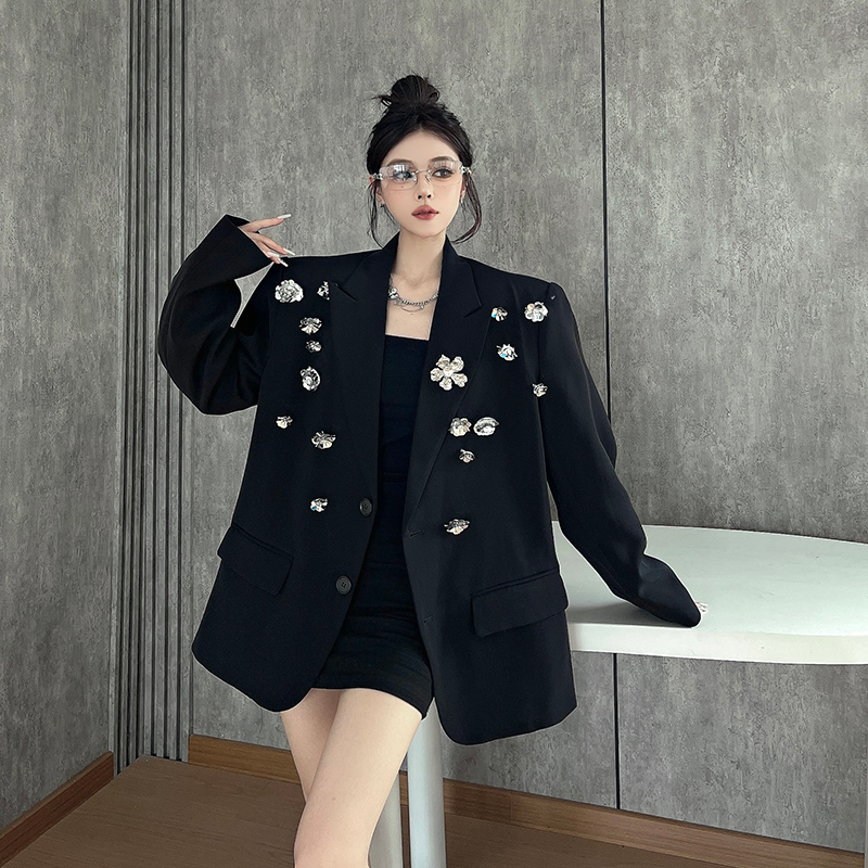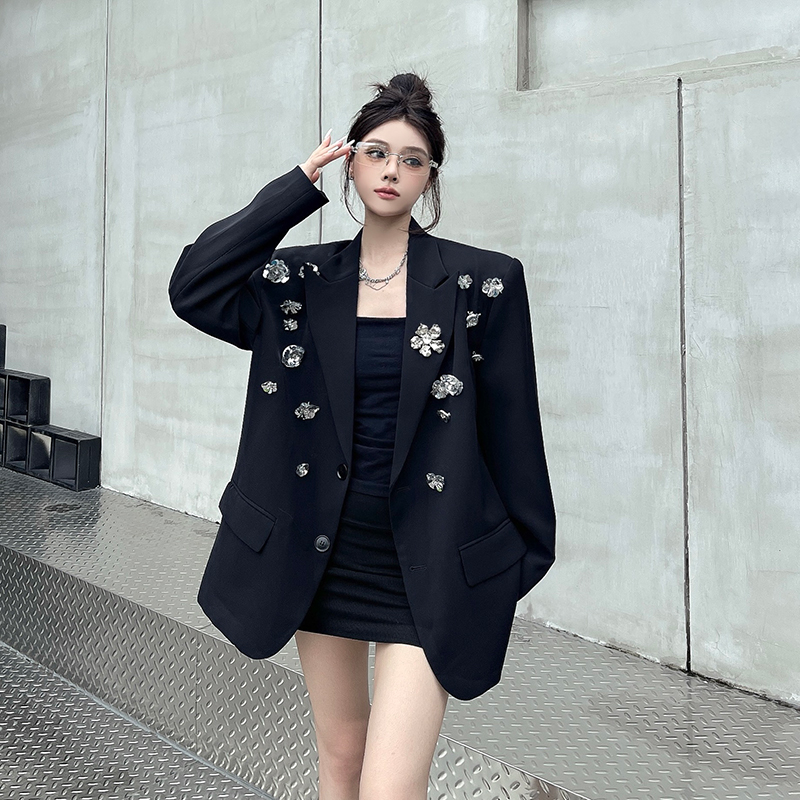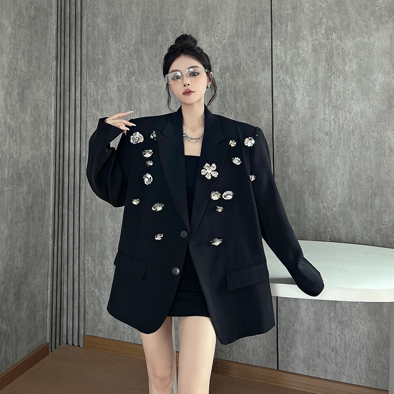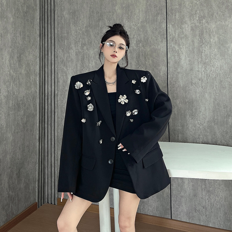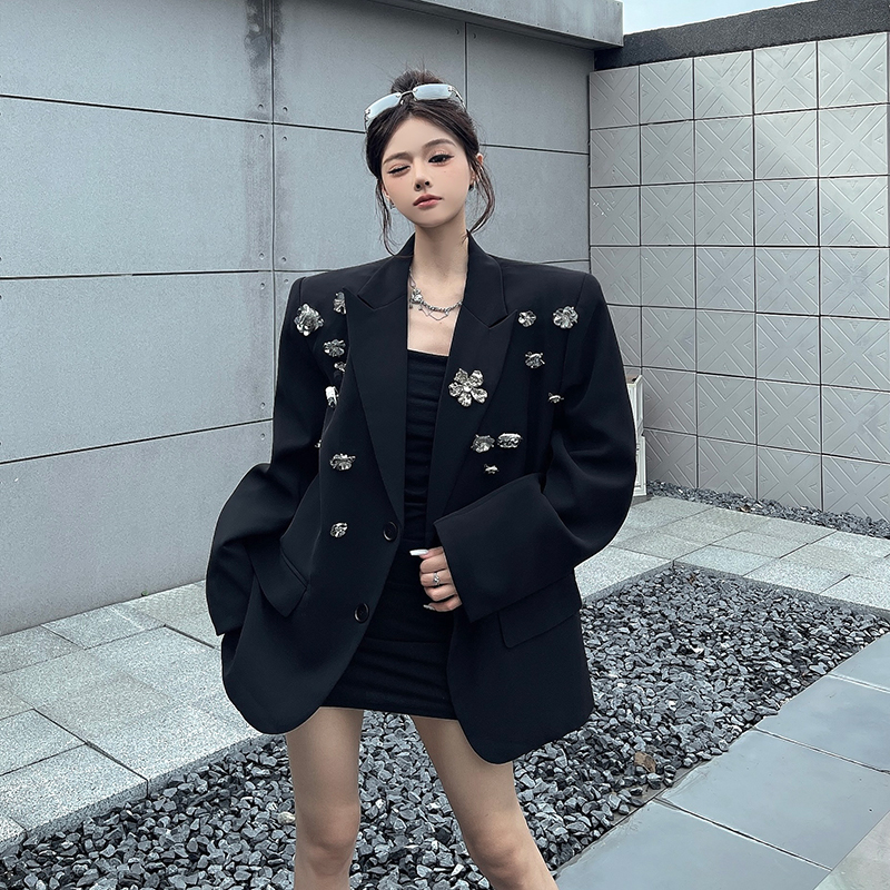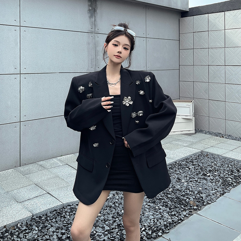 实拍实价 小众玫瑰花朵设计黑色西装外套女春秋新款宽松百搭西服