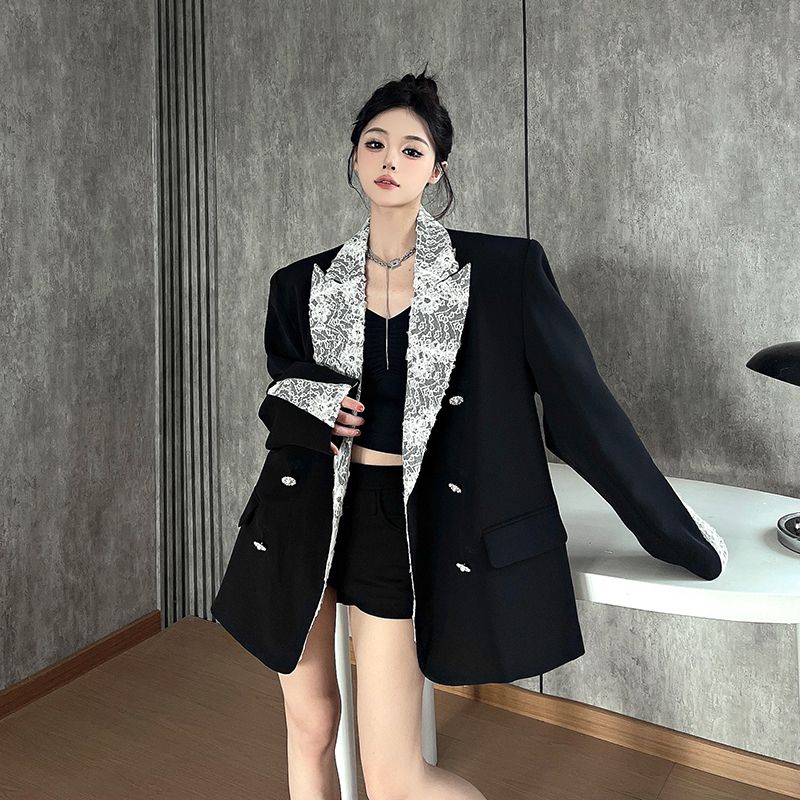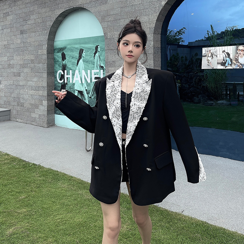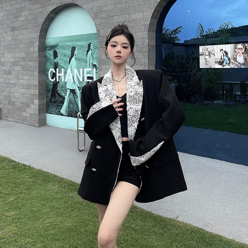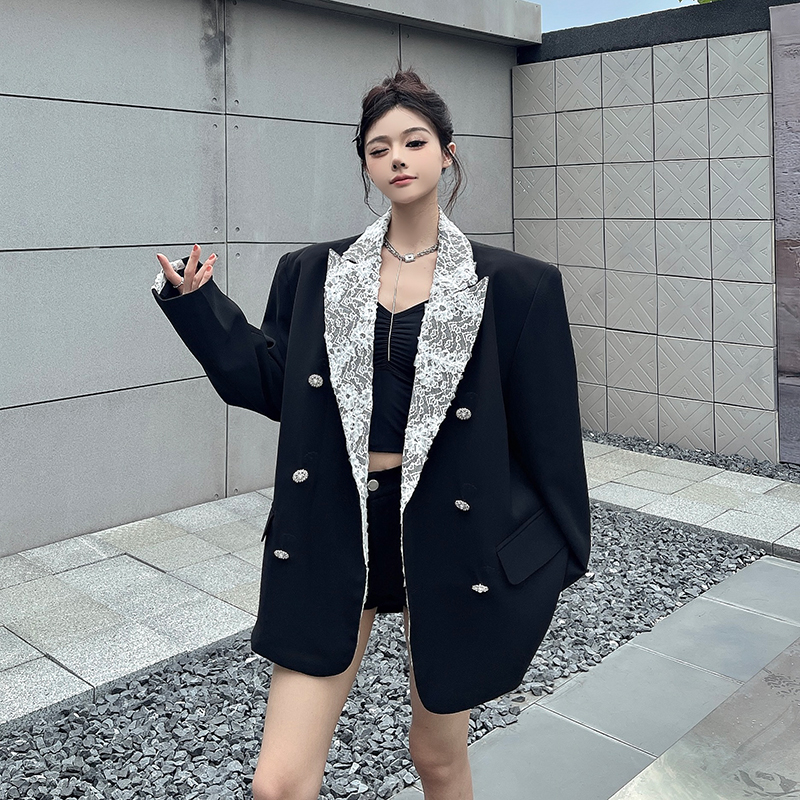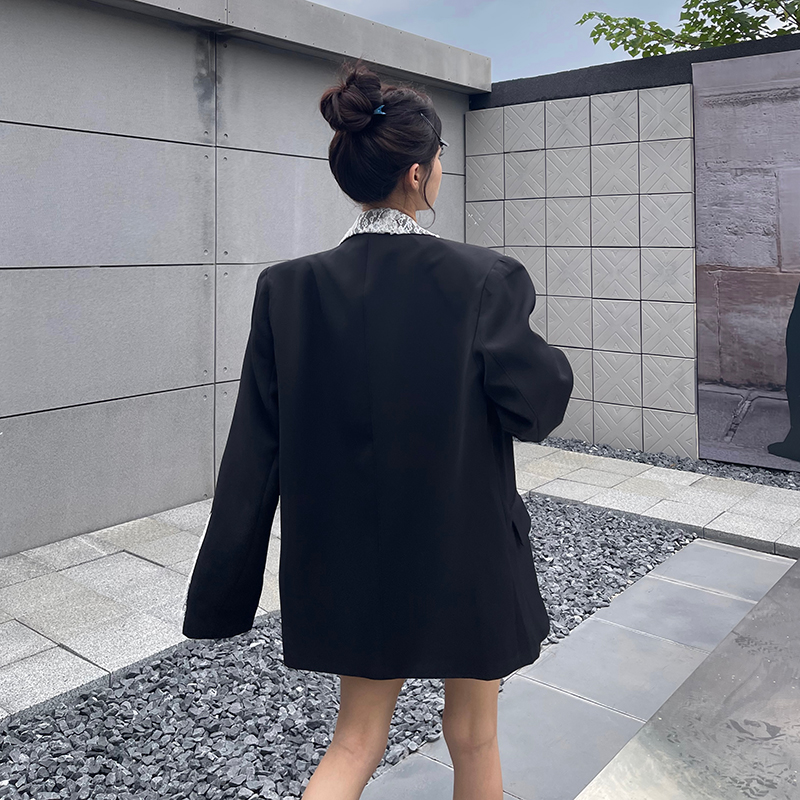 实拍实价黑色西装外套女春秋新款蕾丝拼接设计感宽松垫肩西服上衣