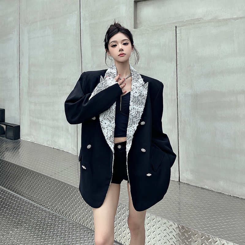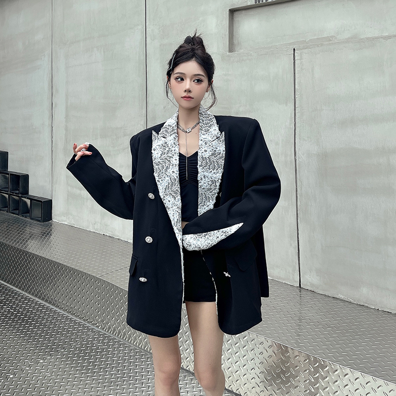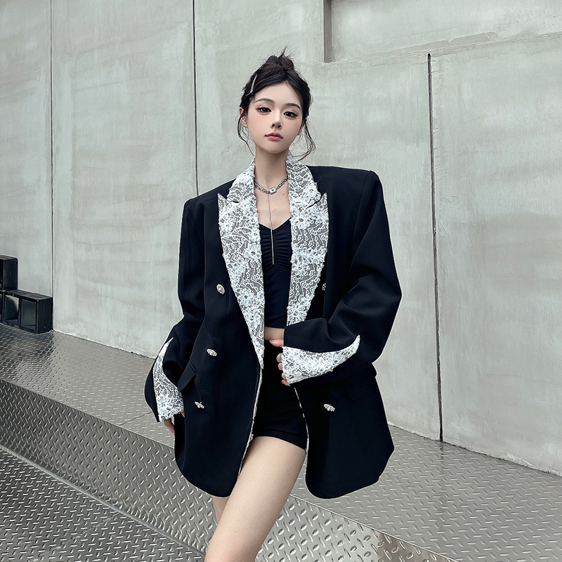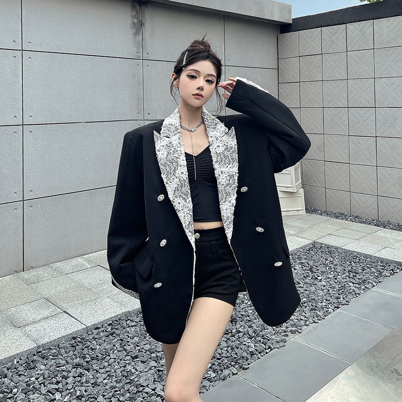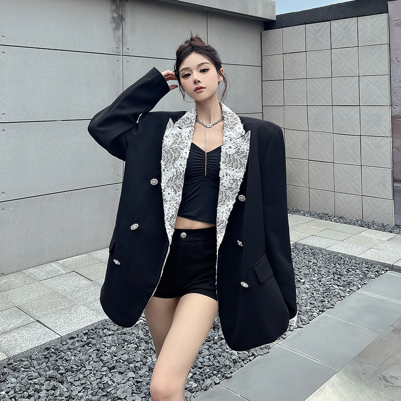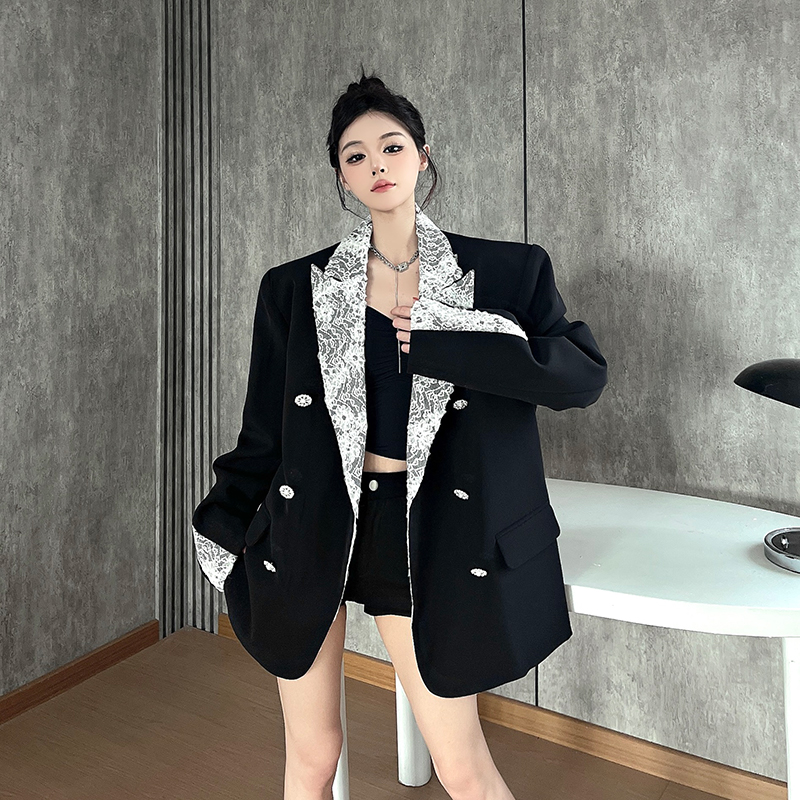 实拍实价黑色西装外套女春秋新款蕾丝拼接设计感宽松垫肩西服上衣